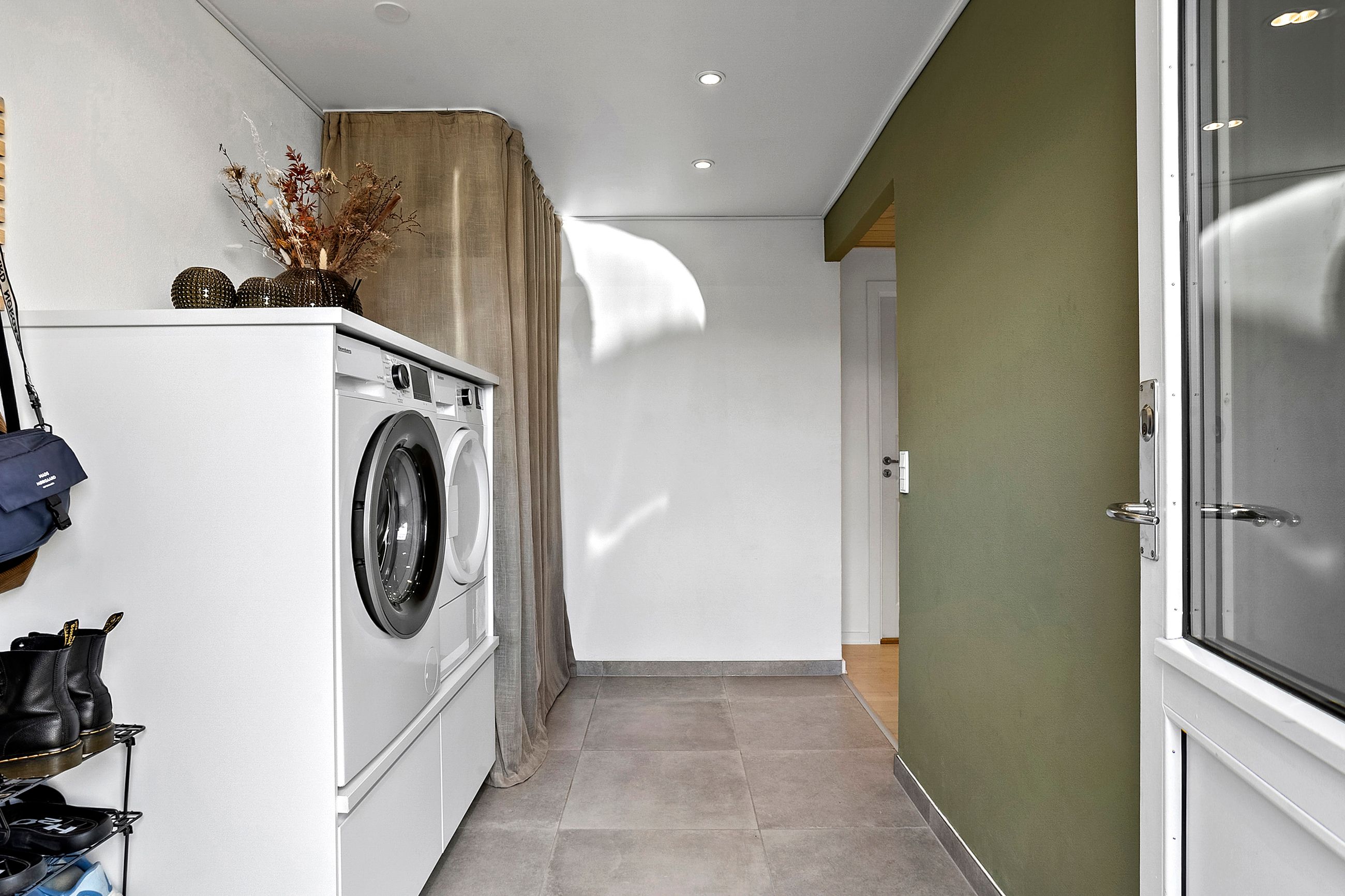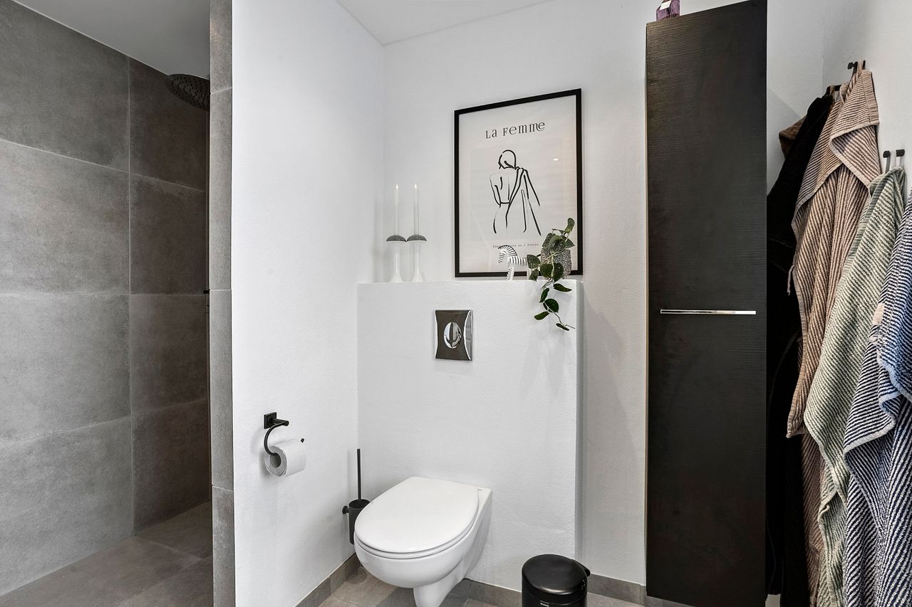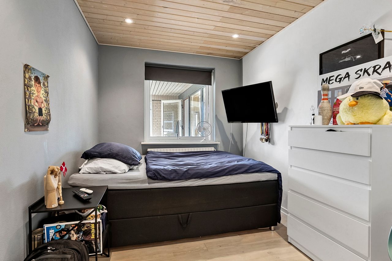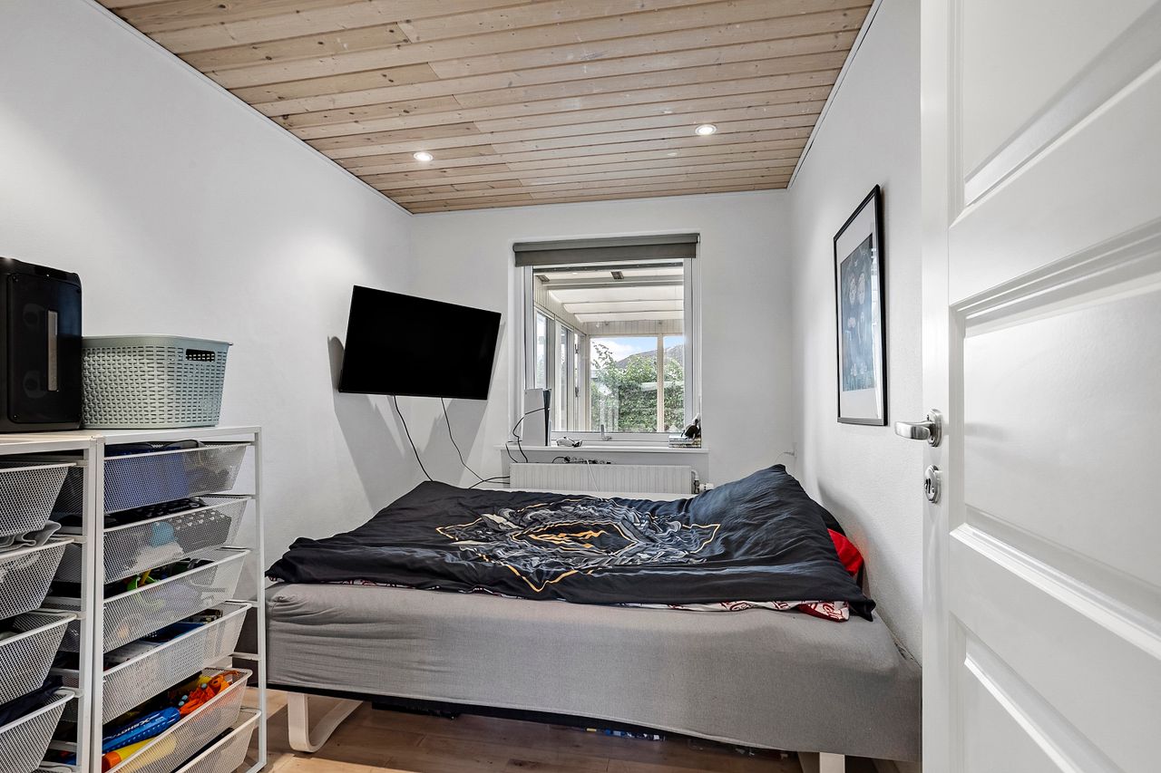 Boligen er praktisk indrettet med indgang gennem et rummeligt bryggers, som leder videre ind til værelsesafdelingen. Her finder I soveværelse, to gode børneværelser, kontor samt et badeværelse med gulvvarme.