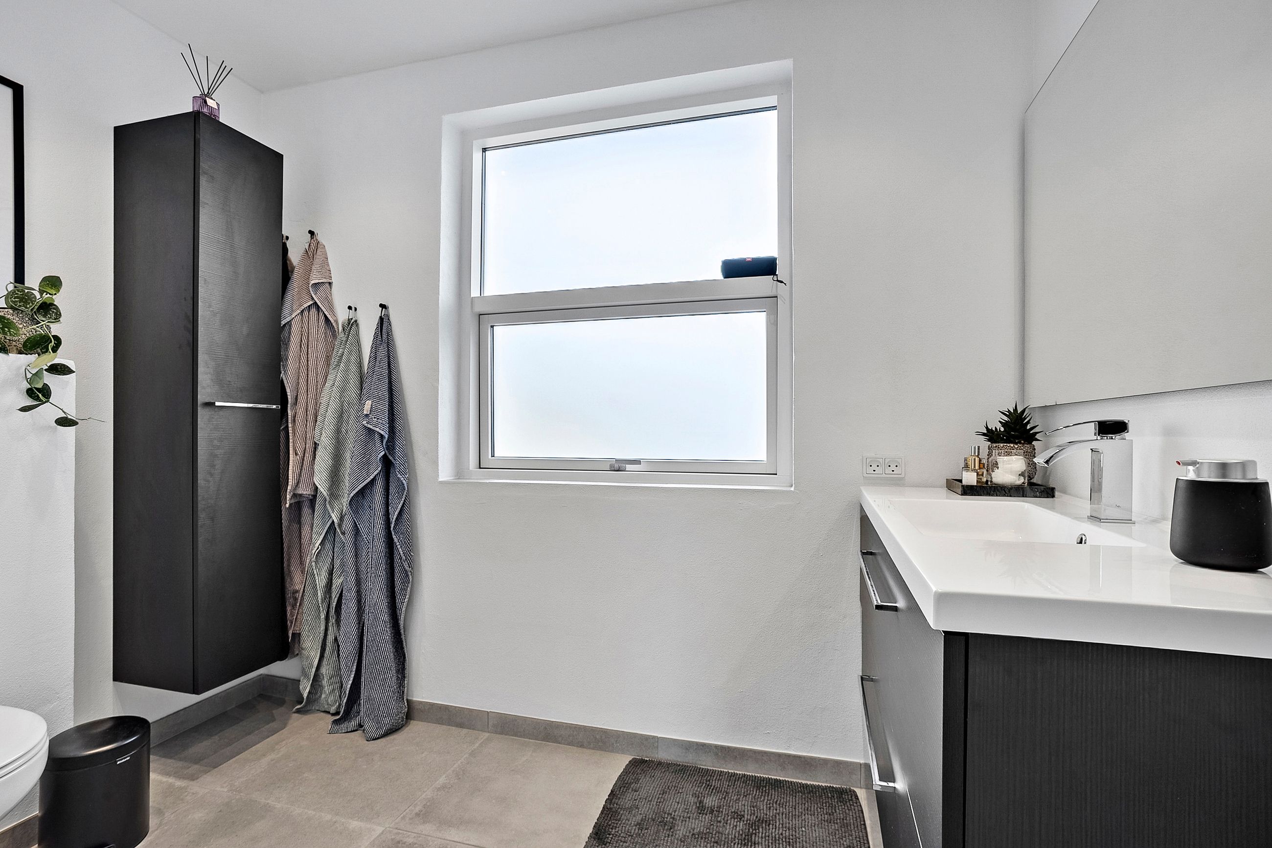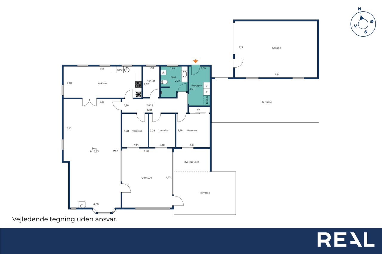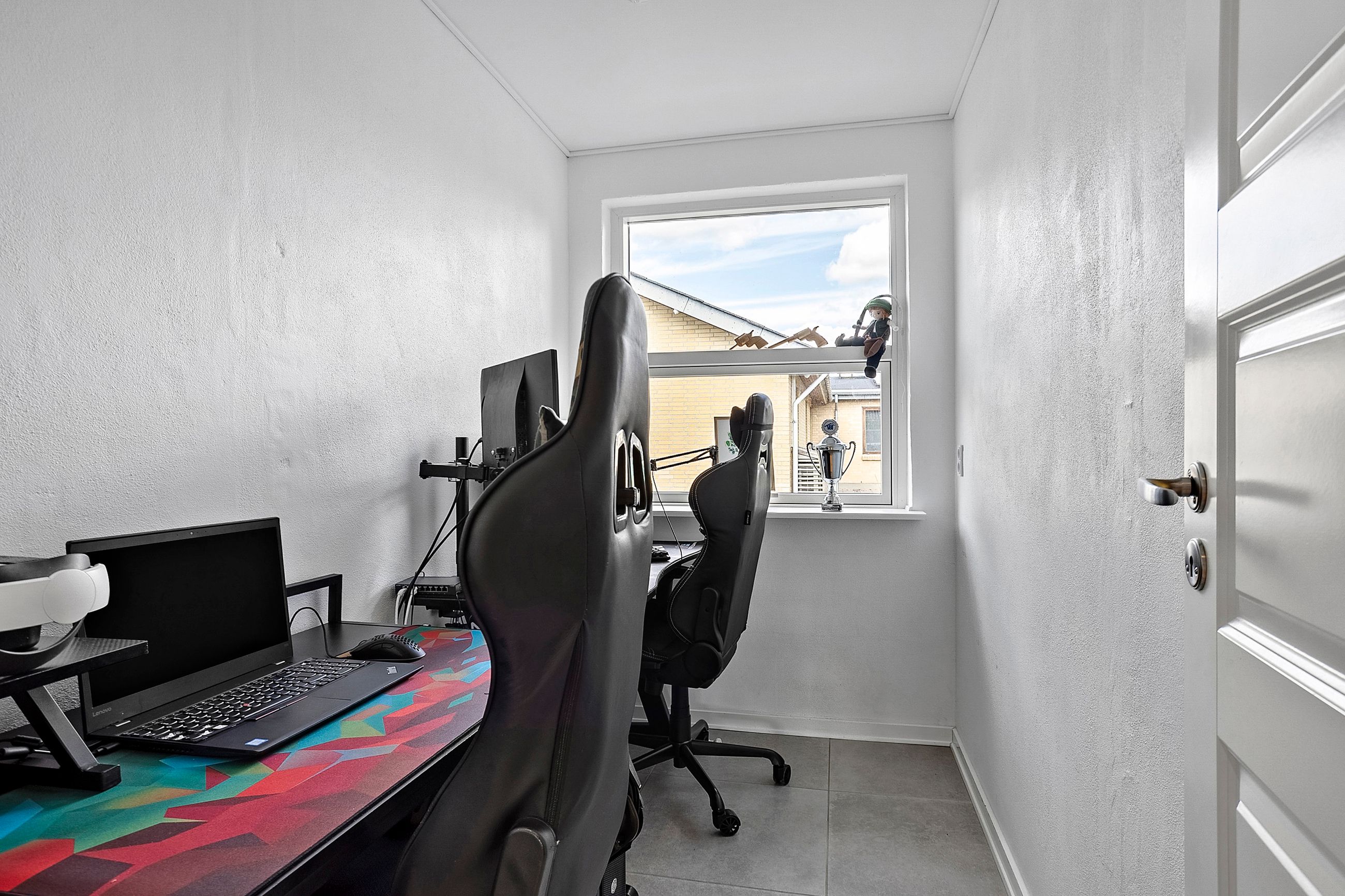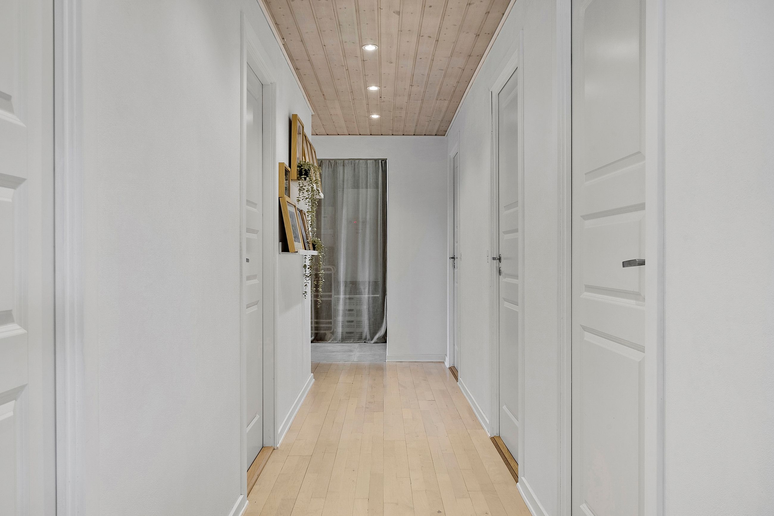 Boligen er praktisk indrettet med indgang gennem et rummeligt bryggers, som leder videre ind til værelsesafdelingen. Her finder I soveværelse, to gode børneværelser, kontor samt et badeværelse med gulvvarme.