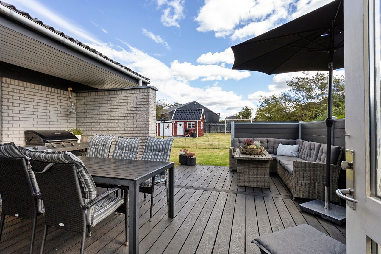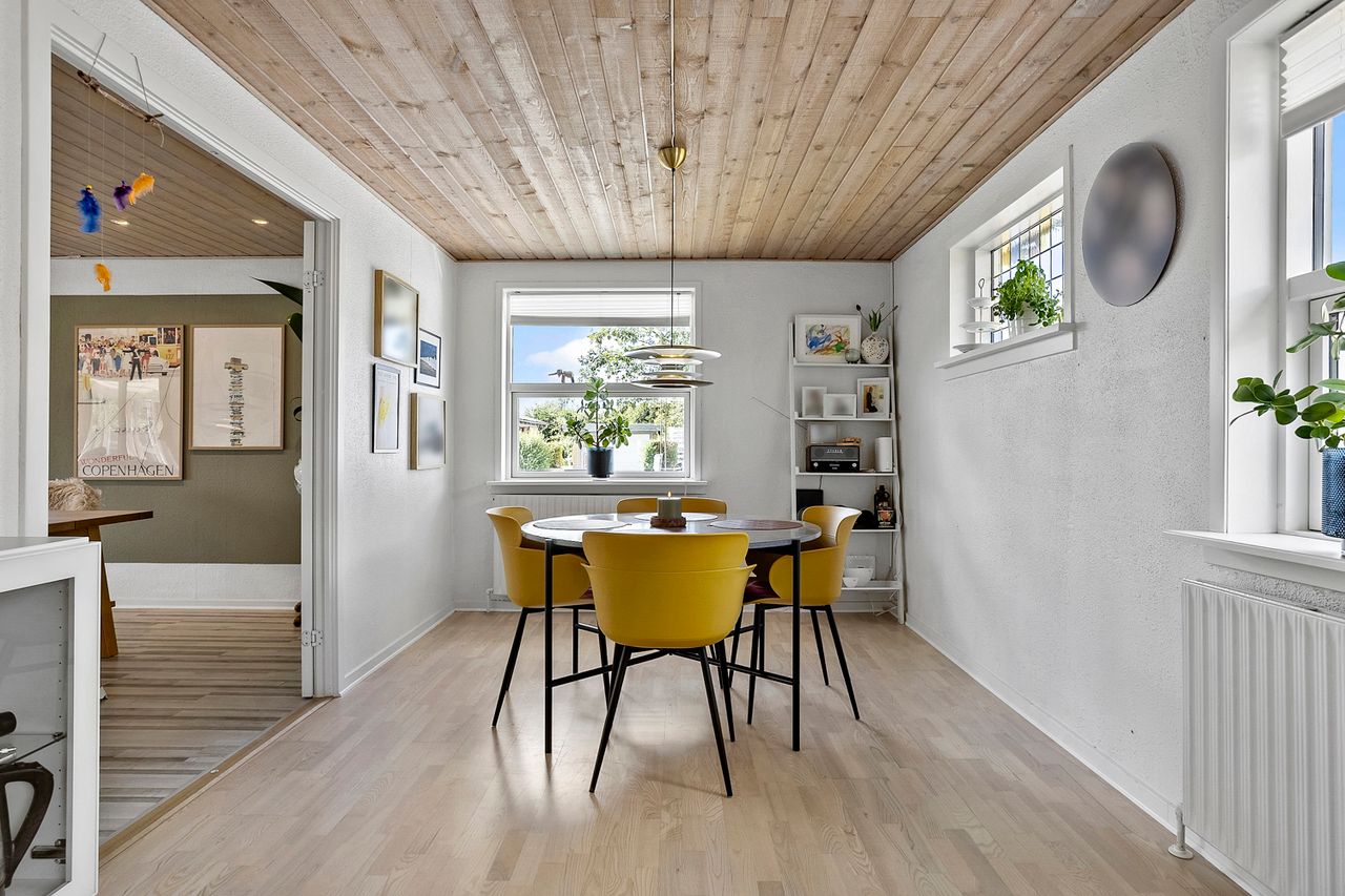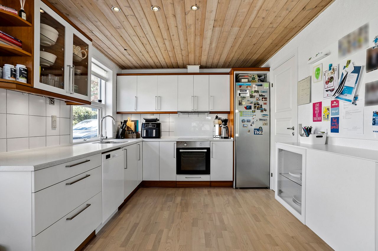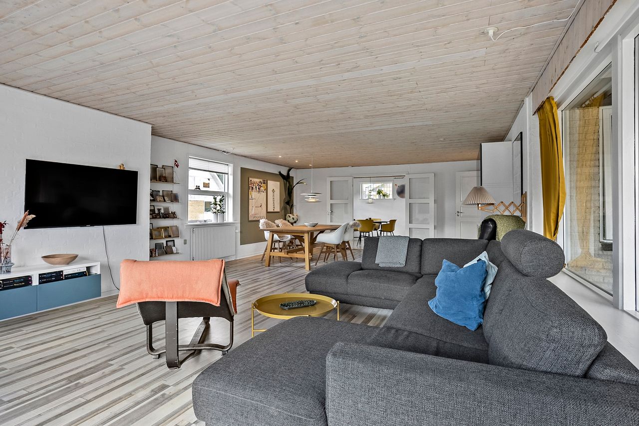 Husets hjerte er det store, åbne køkken-alrum, som ligger i direkte forbindelse med den lyse og indbydende stue. Her er der god plads til både hverdagsliv og større sammenkomster. Fra stuen er der udgang til en hyggelig udestue, som forlænger sæsonen og giver mulighed for at nyde haven året rundt.
