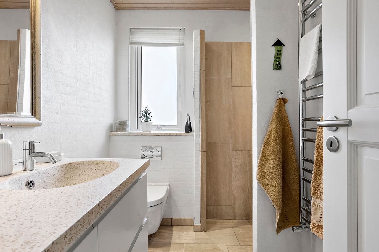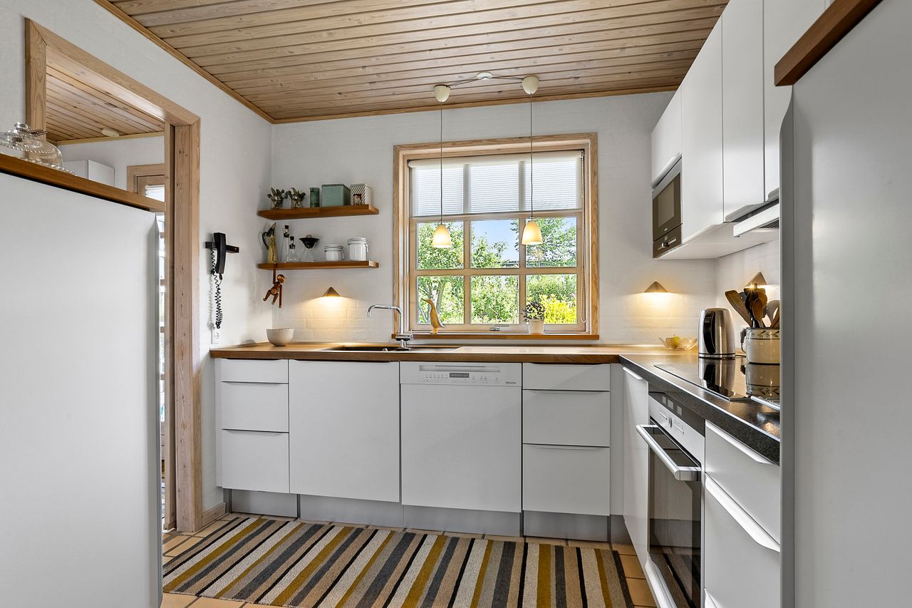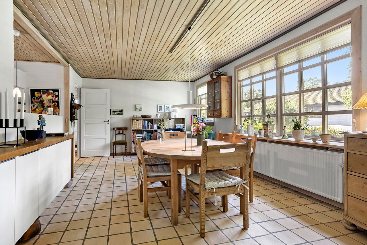 Fra entréen er der adgang til et flot og velholdt badeværelse, som blev renoveret i 2008 og stadig fremstår moderne og indbydende. En fordelergang fører videre til et stort og lyst værelse, og herefter åbner hjemmet sig op i den lyse spisestue, der er integreret med det lækre Invita-køkken fra 2011. Køkkenet er praktisk indrettet med sokkelskuffer og gennemtænkte detaljer i skabsarrangementet – ideelt til både hverdag og gæstebesøg. Huset har gulvvarme hvor der er klinker.