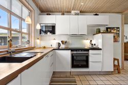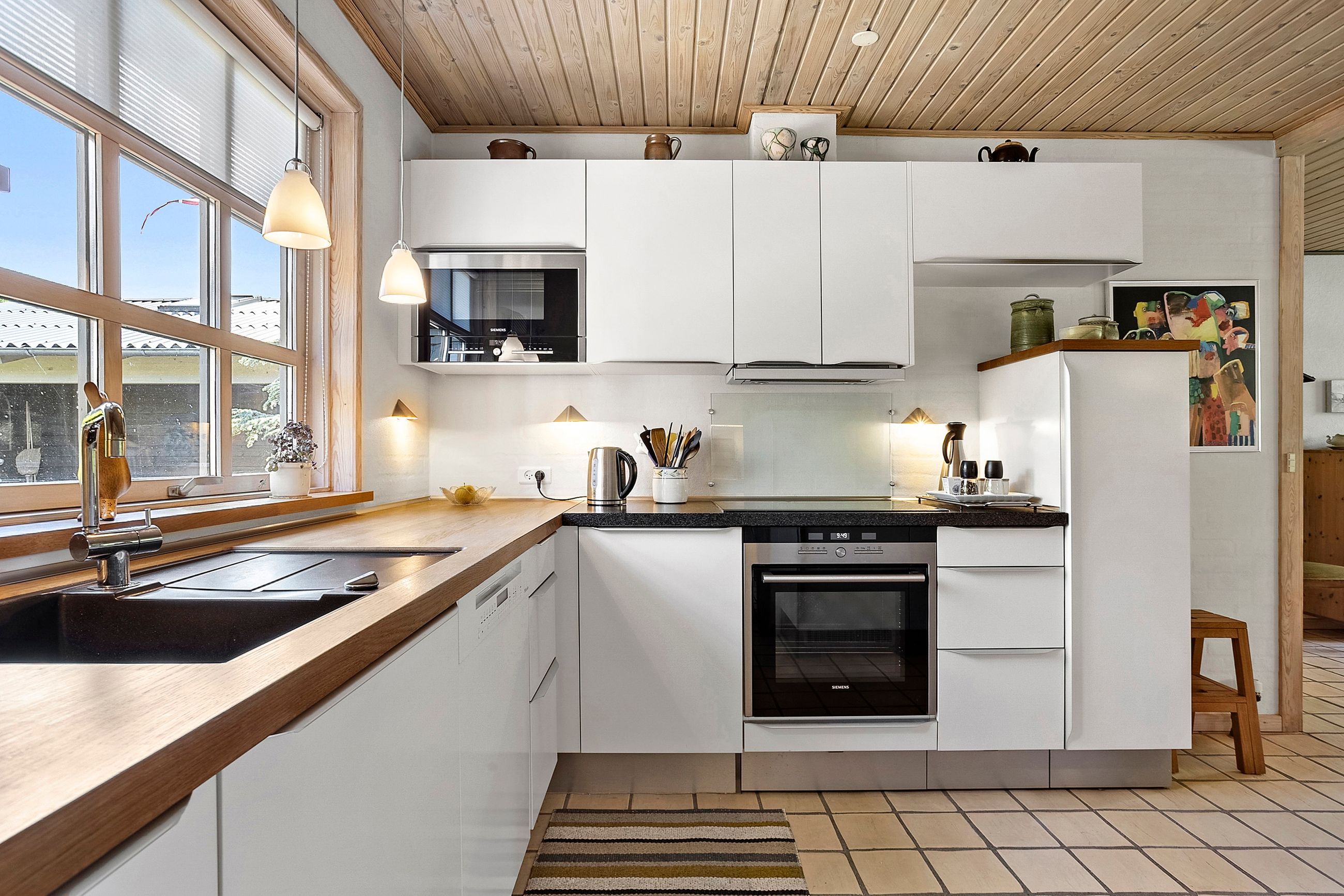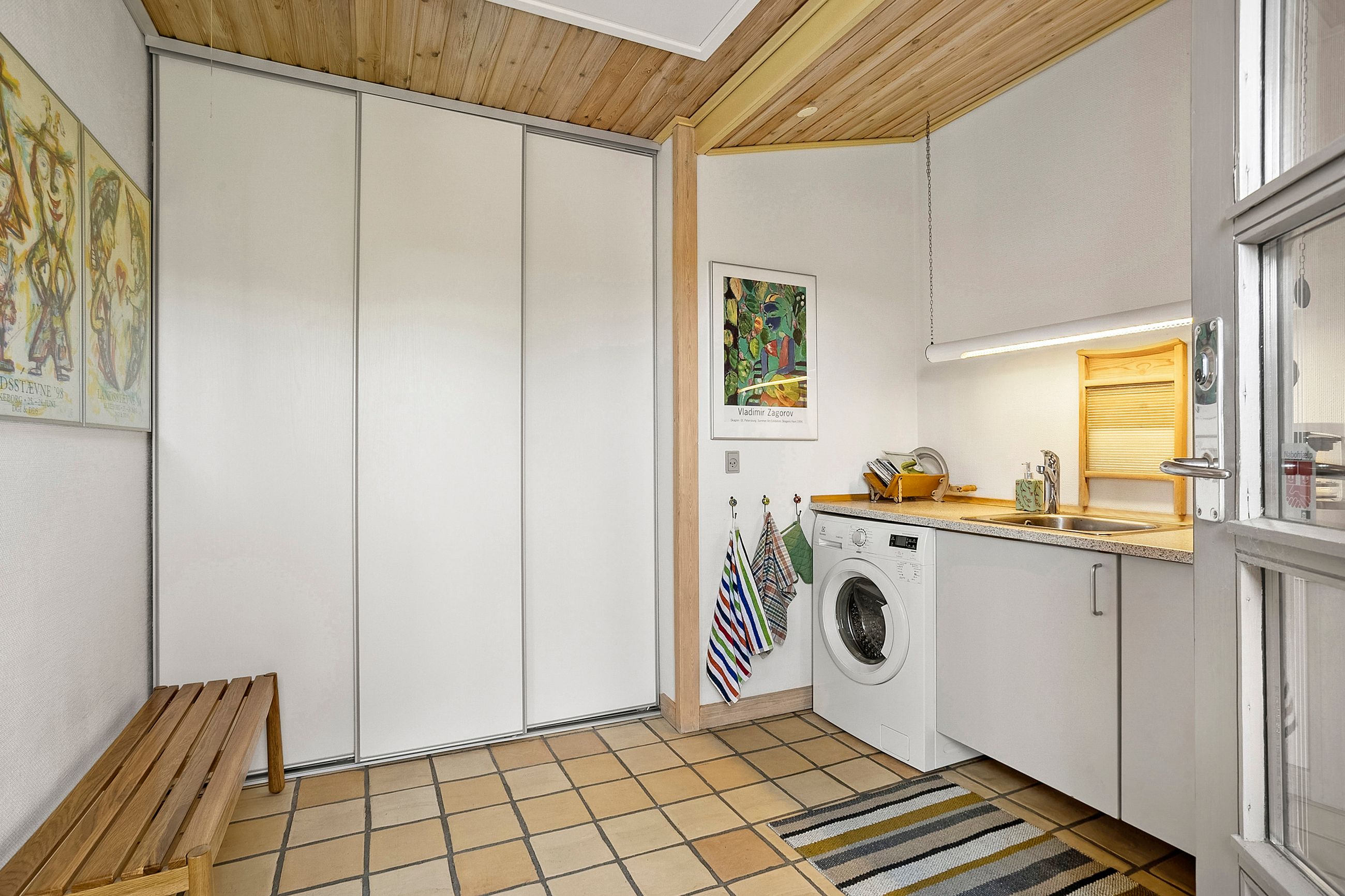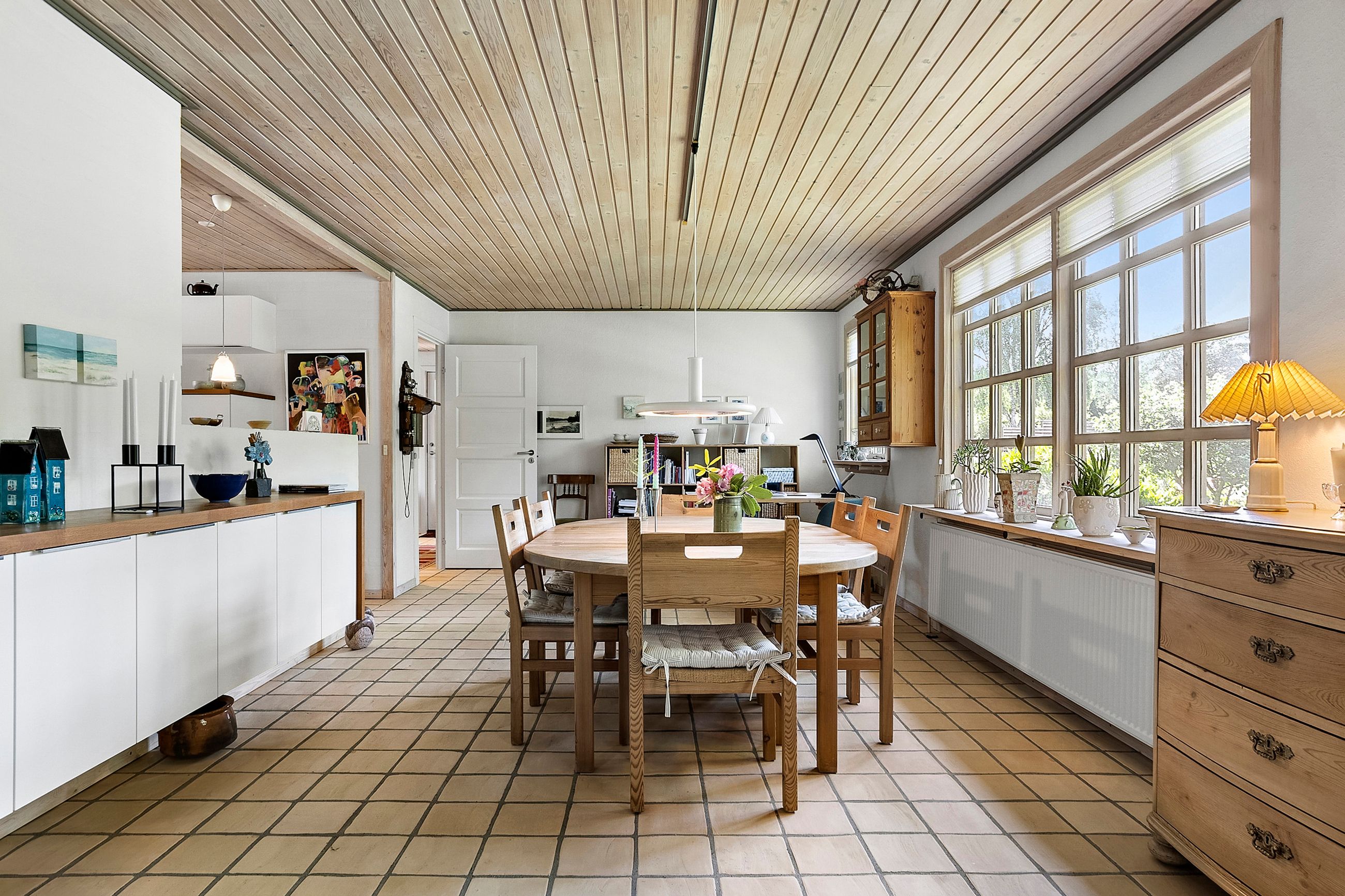 Fra entréen er der adgang til et flot og velholdt badeværelse, som blev renoveret i 2008 og stadig fremstår moderne og indbydende. En fordelergang fører videre til et stort og lyst værelse, og herefter åbner hjemmet sig op i den lyse spisestue, der er integreret med det lækre Invita-køkken fra 2011. Køkkenet er praktisk indrettet med sokkelskuffer og gennemtænkte detaljer i skabsarrangementet – ideelt til både hverdag og gæstebesøg. Huset har gulvvarme hvor der er klinker.