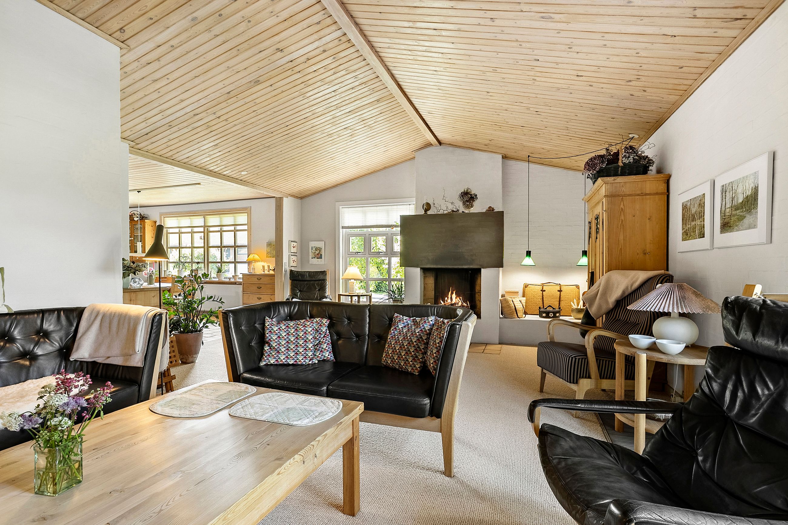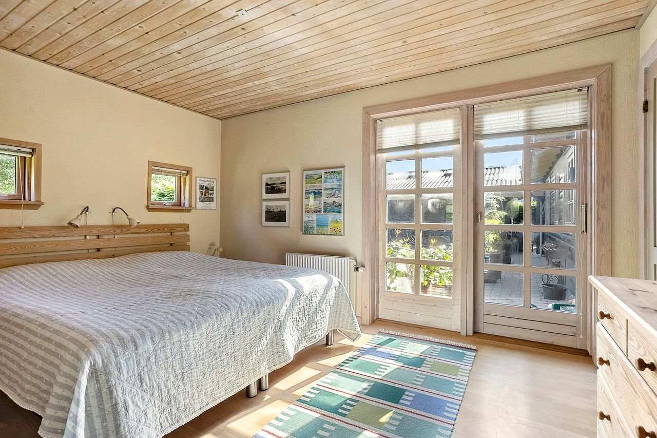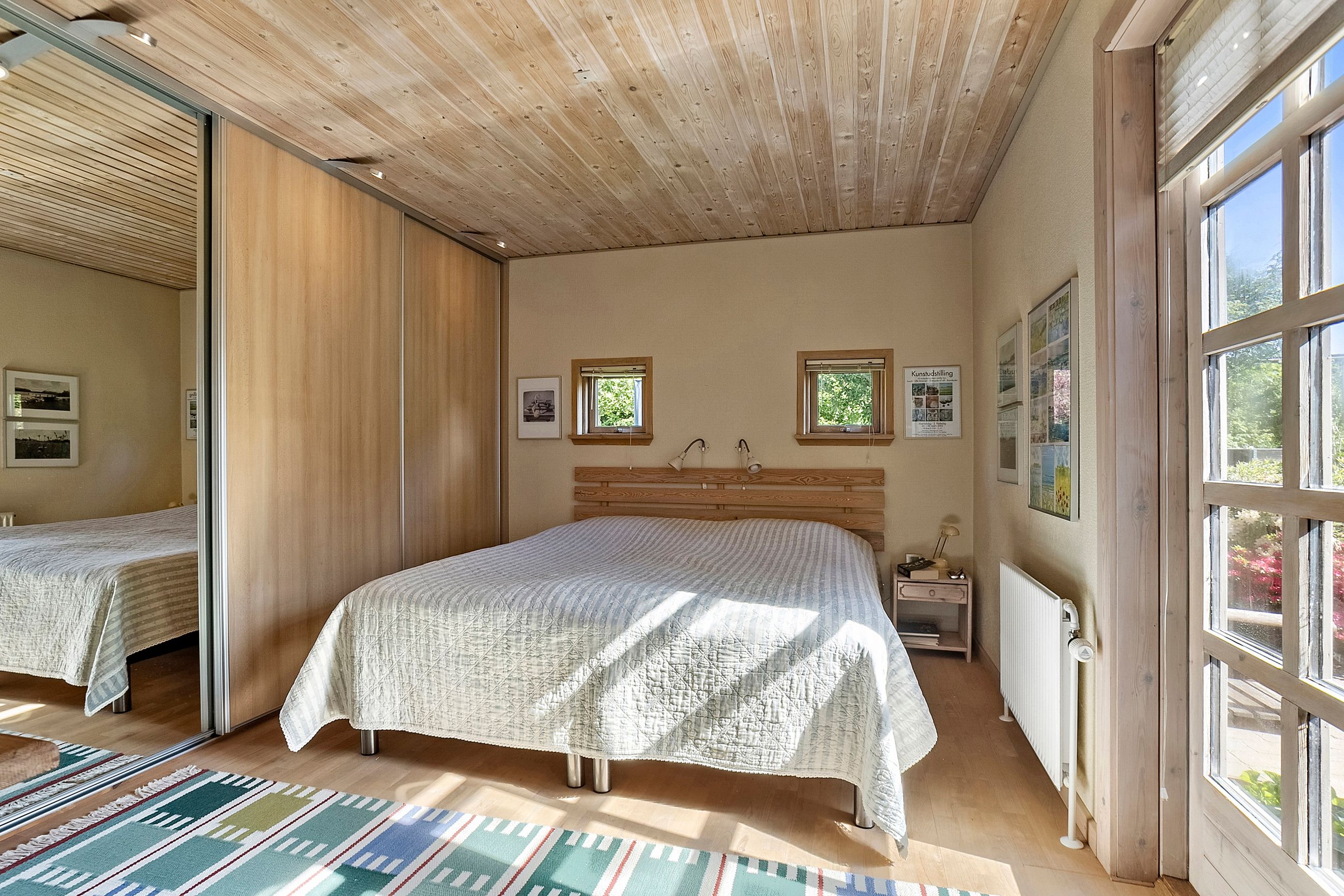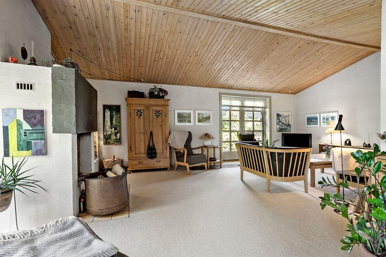 Spisestuen fører videre til husets hyggelige pejsestue, hvor en åben pejs skaber varme og stemning. Denne del af huset blev tilbygget i 1979 sammen med det rummelige soveværelse hvor der er skabe med skydelåger og foruden det, så er der eget walk-in garderobe.