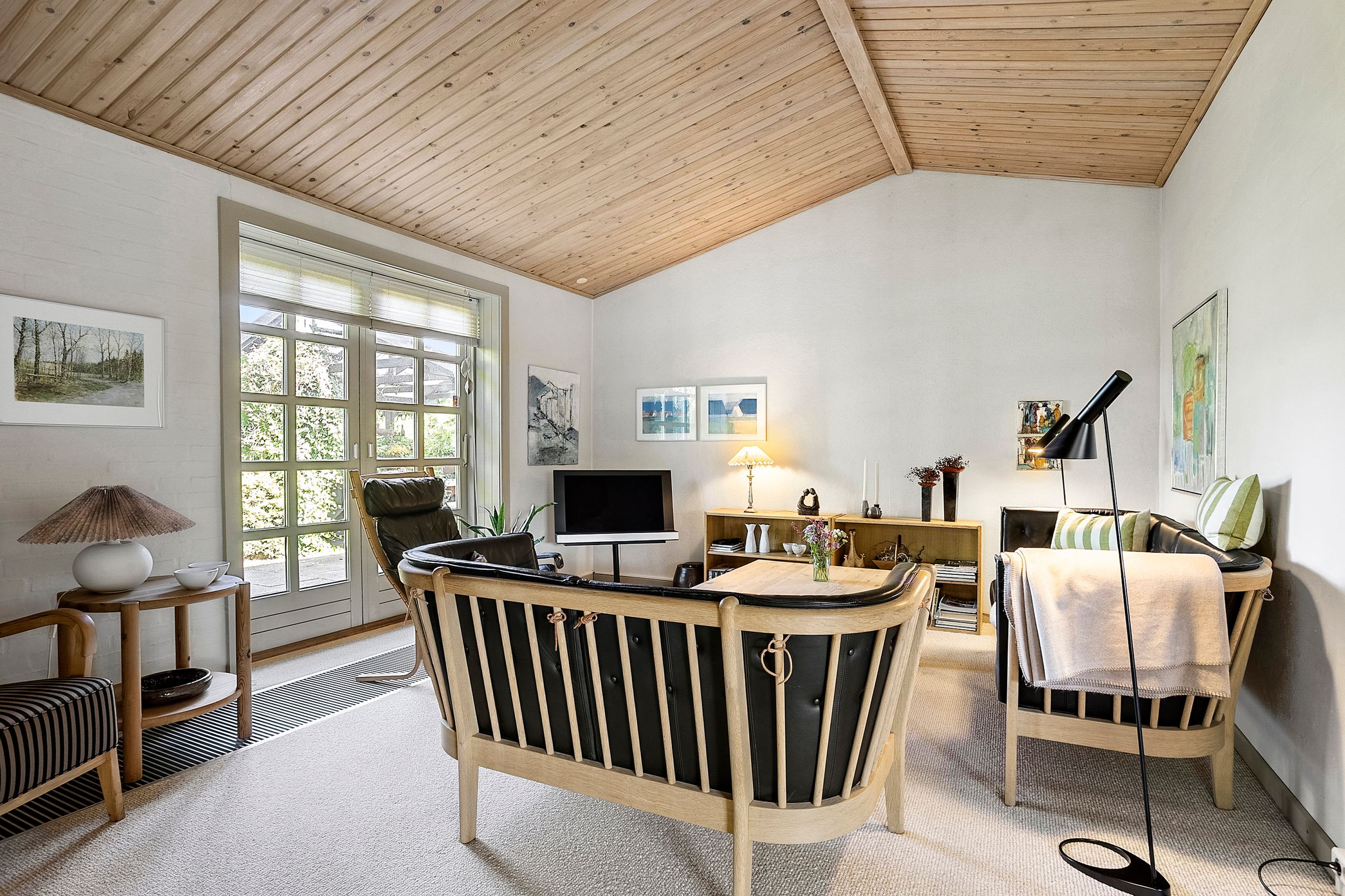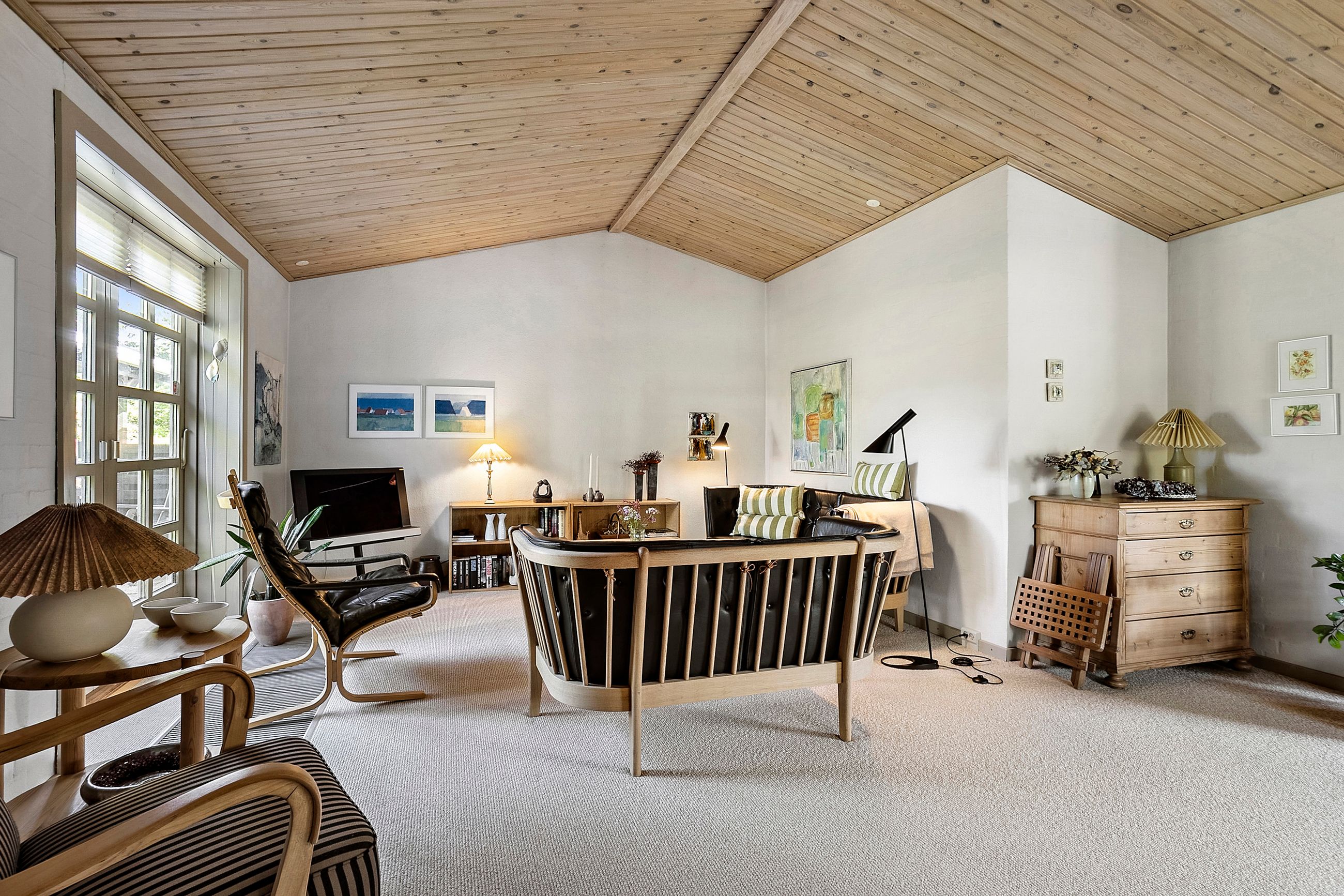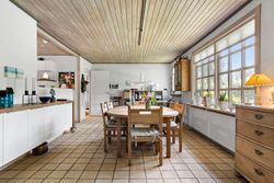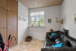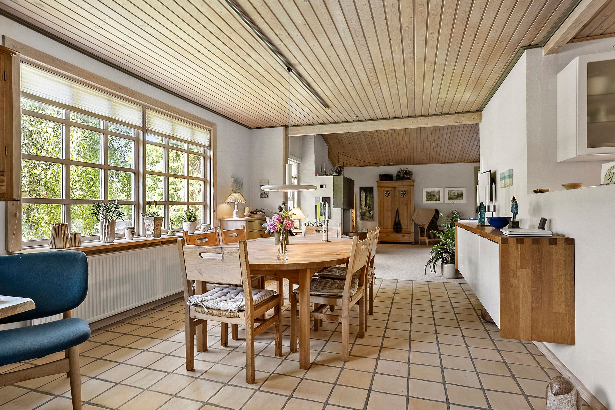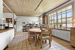 Spisestuen fører videre til husets hyggelige pejsestue, hvor en åben pejs skaber varme og stemning. Denne del af huset blev tilbygget i 1979 sammen med det rummelige soveværelse hvor der er skabe med skydelåger og foruden det, så er der eget walk-in garderobe.