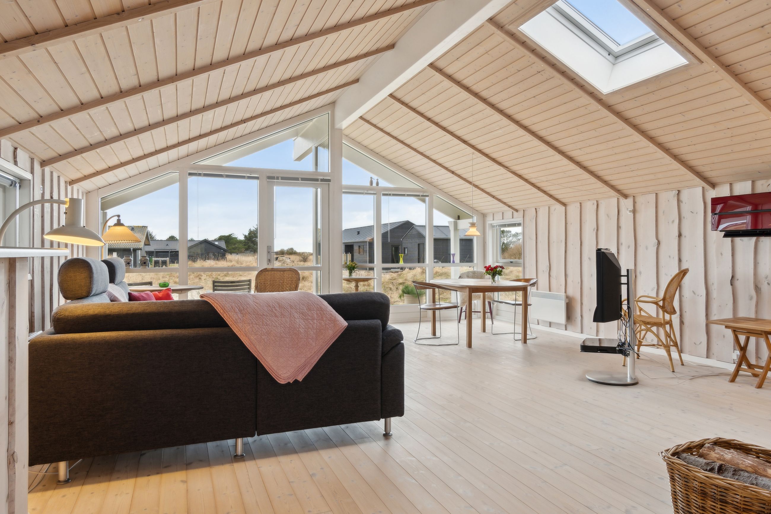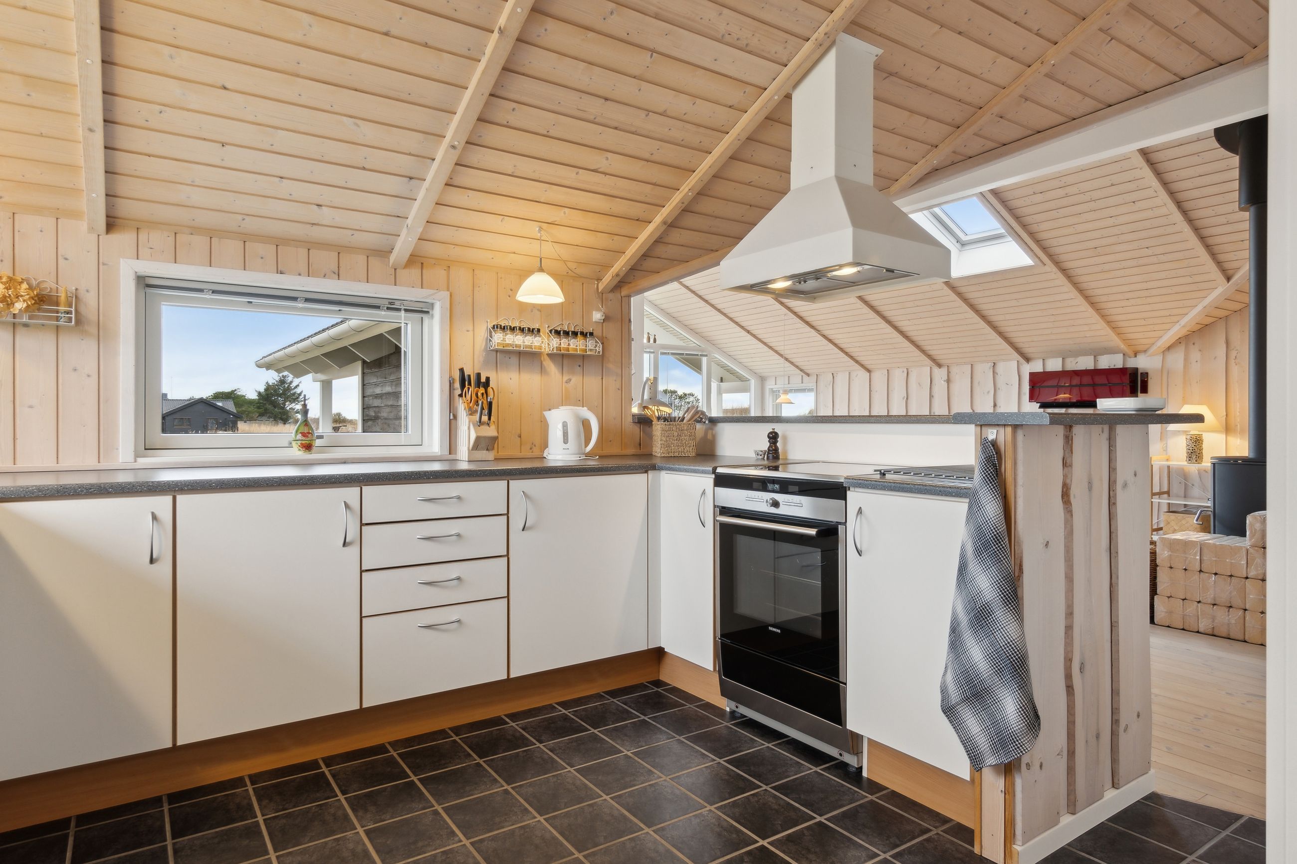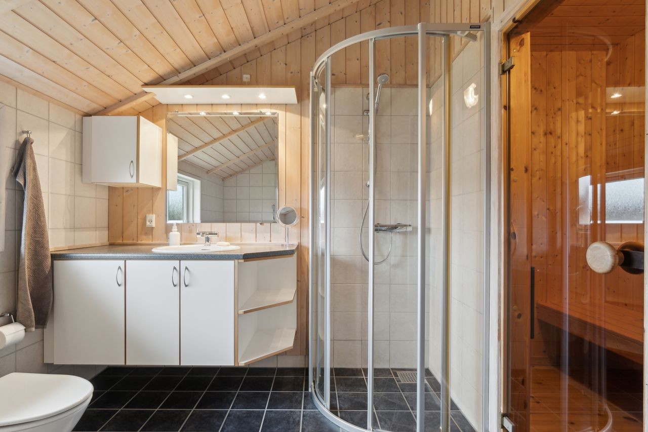 Boligen rummer 98 velindrettede kvadratmetern med tre gode værelser, badeværelser med badekar og sauna, gæstetoilet og et åbent opholdsrum, hvor køkken, spiseplads og stue smelter sammen i ét lyst og hyggeligt rum. Store vinduespartier inviterer naturen indenfor og giver et smukt lysindfald hele dagen, mens brændeovnen sørger for varme og stemning året rundt. Her er plads til både afslapning og samvær – hvad end du søger fredelige weekender, sommerferier med familien eller et sted at invitere gode venner til en weekend i naturens tegn.