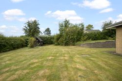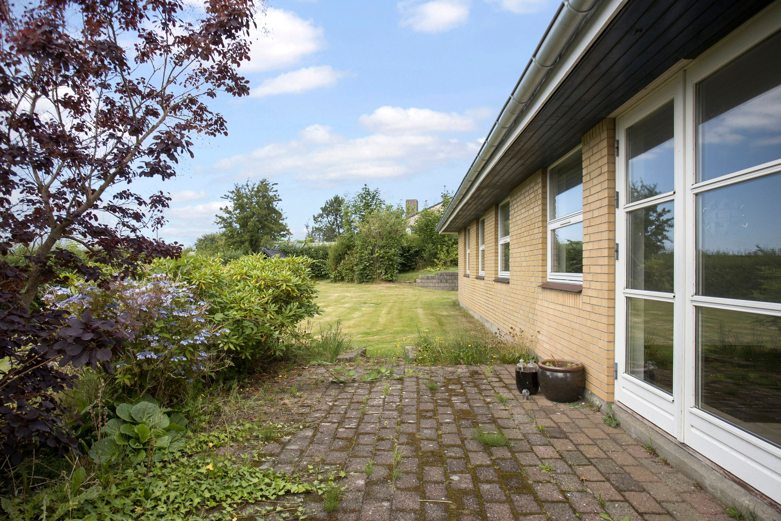 Haven er overskuelig og nem at holde, og til ejendommen hører også en solid garage med udhus.