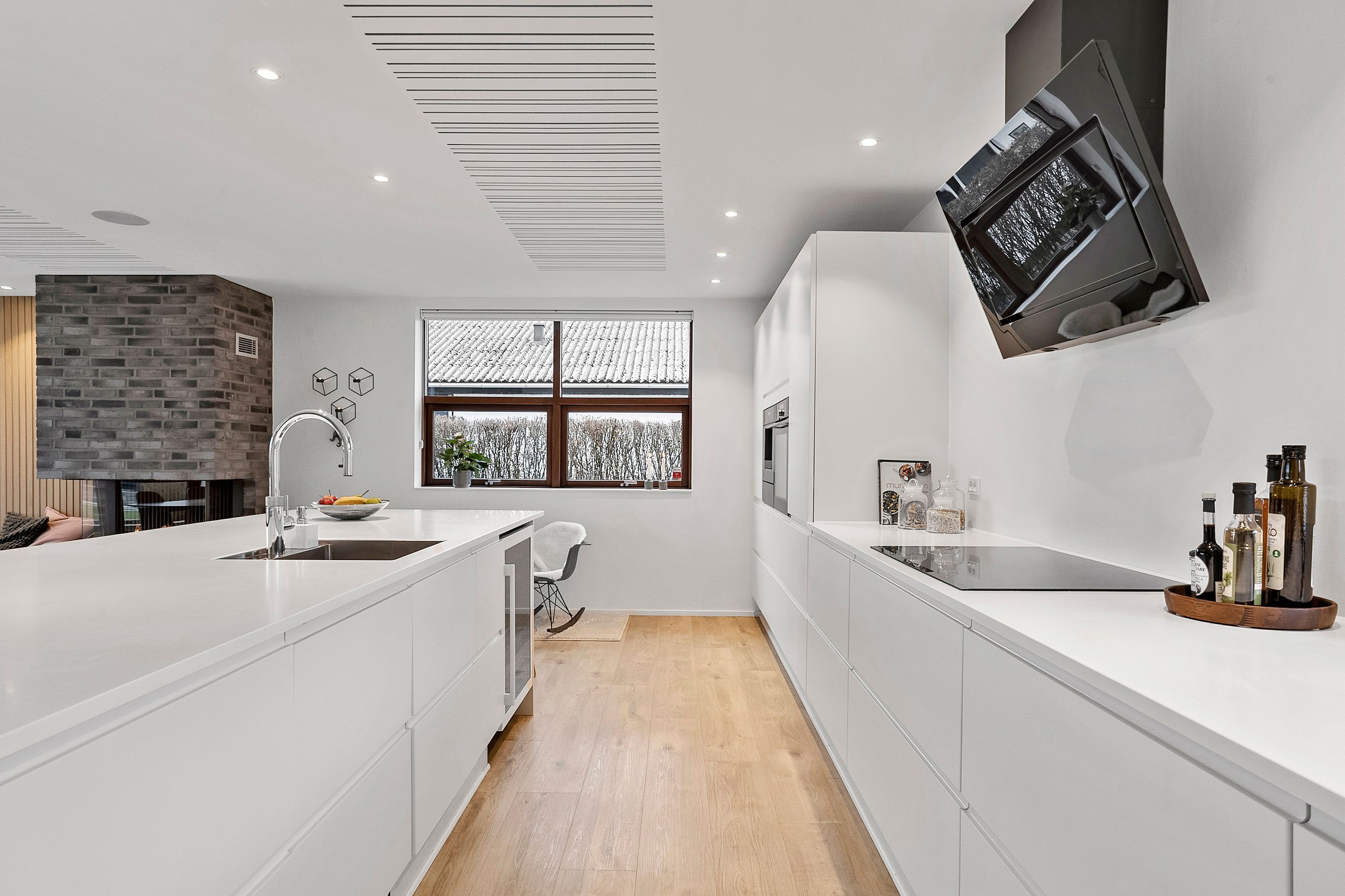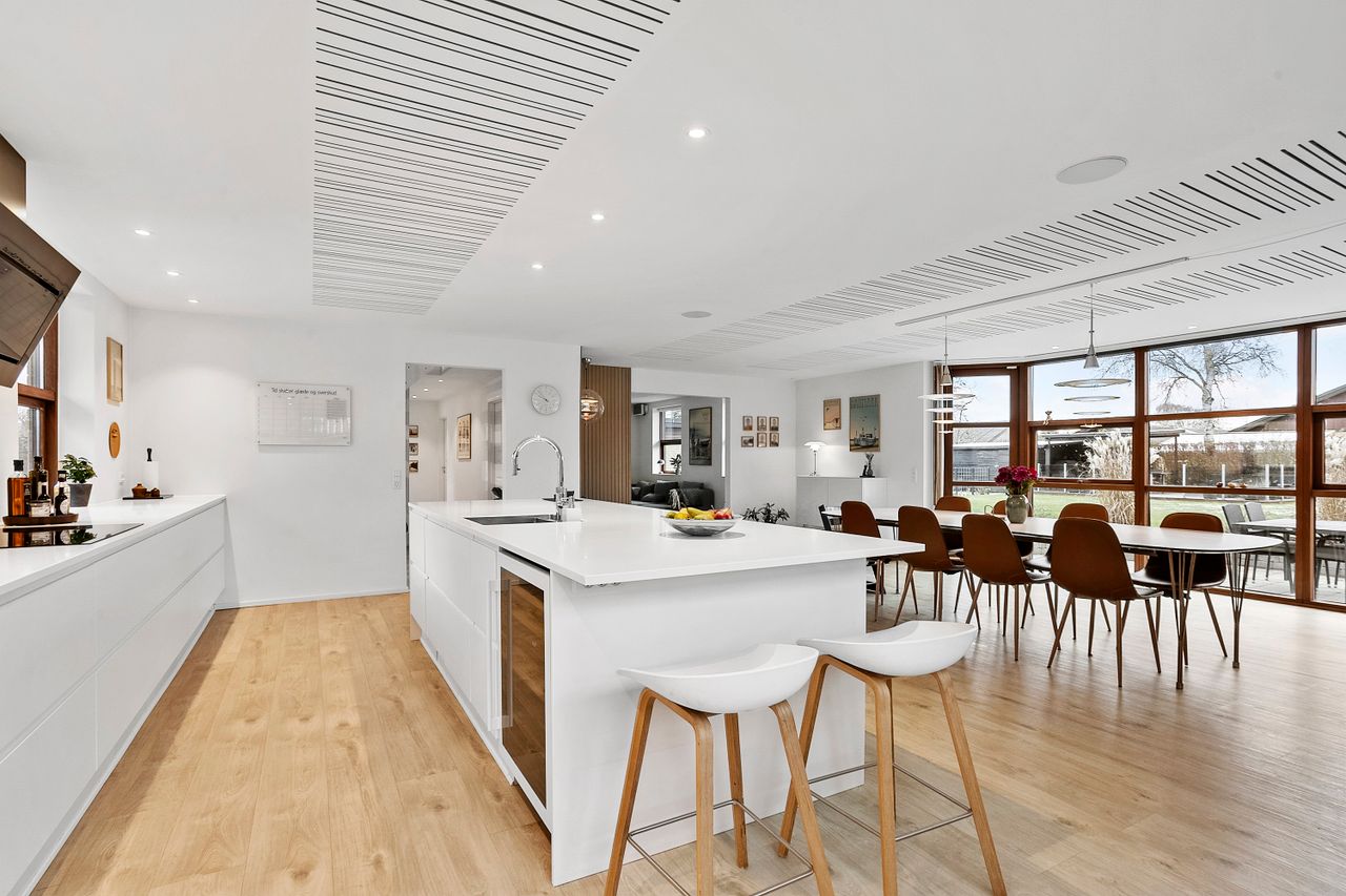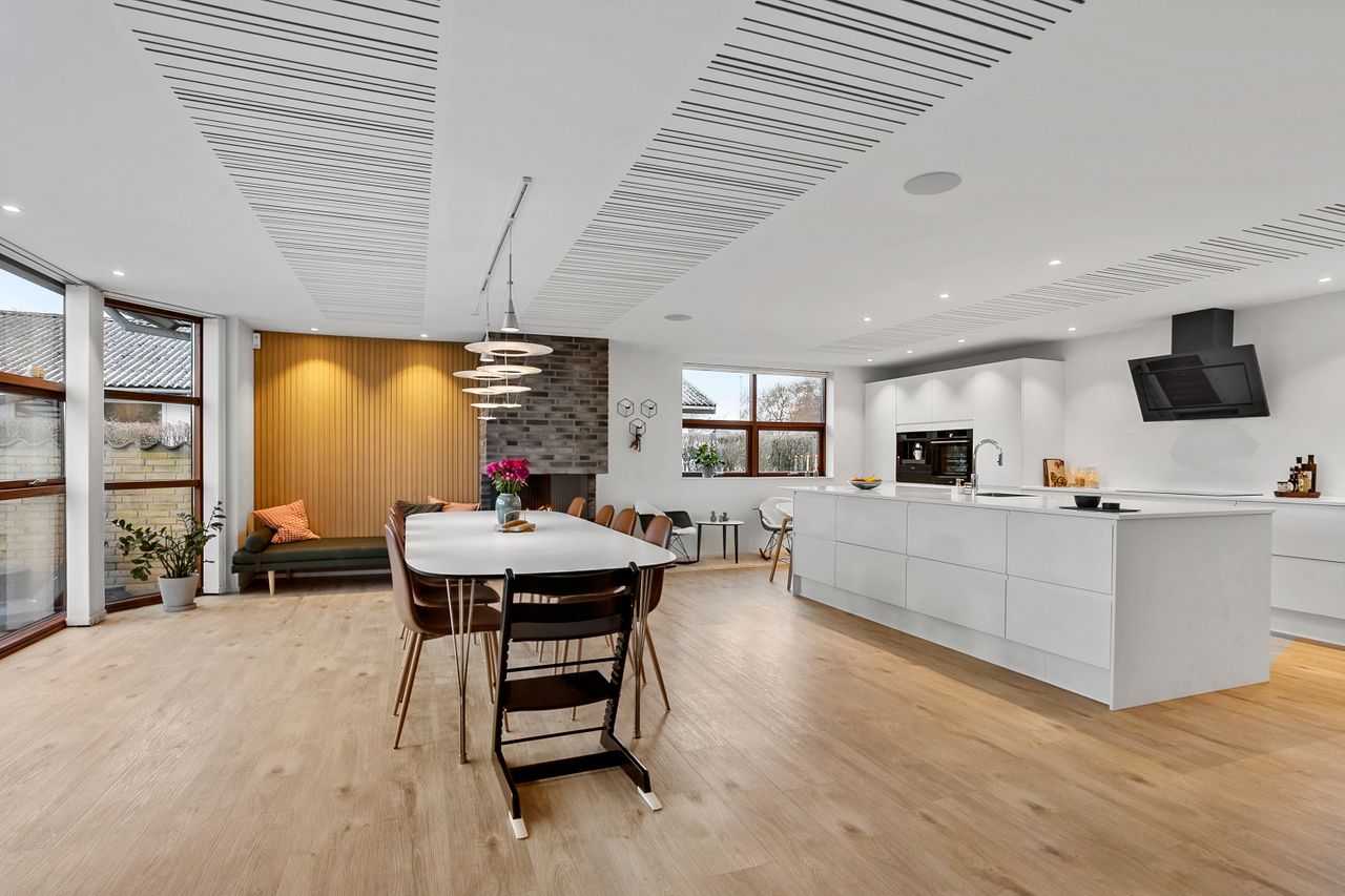 Villaen er opført i 1971, og i 2005 kom den rummelige overetage til. Hele underetagen blev renoveret i 2017 og fremstår moderne og indbydende, blandt andet med et flot Designa-køkken med masser af skuffeplads. Man ankommer i en lys entré, som åbner ind til et stort og indbydende køkken/alrum, hvor en elegant gaspejs skaber både atmosfære og varme. Herfra er der udgang til en sydvendt terrasse og en lukket, ugeneret have, som indbyder til afslapning og sommerhygge. Underetagen rummer desuden en hyggelig tv-stue, et stort værelse, et badeværelse og et praktisk bryggers. Der er i hele underetagen etableret gulvvarme.
