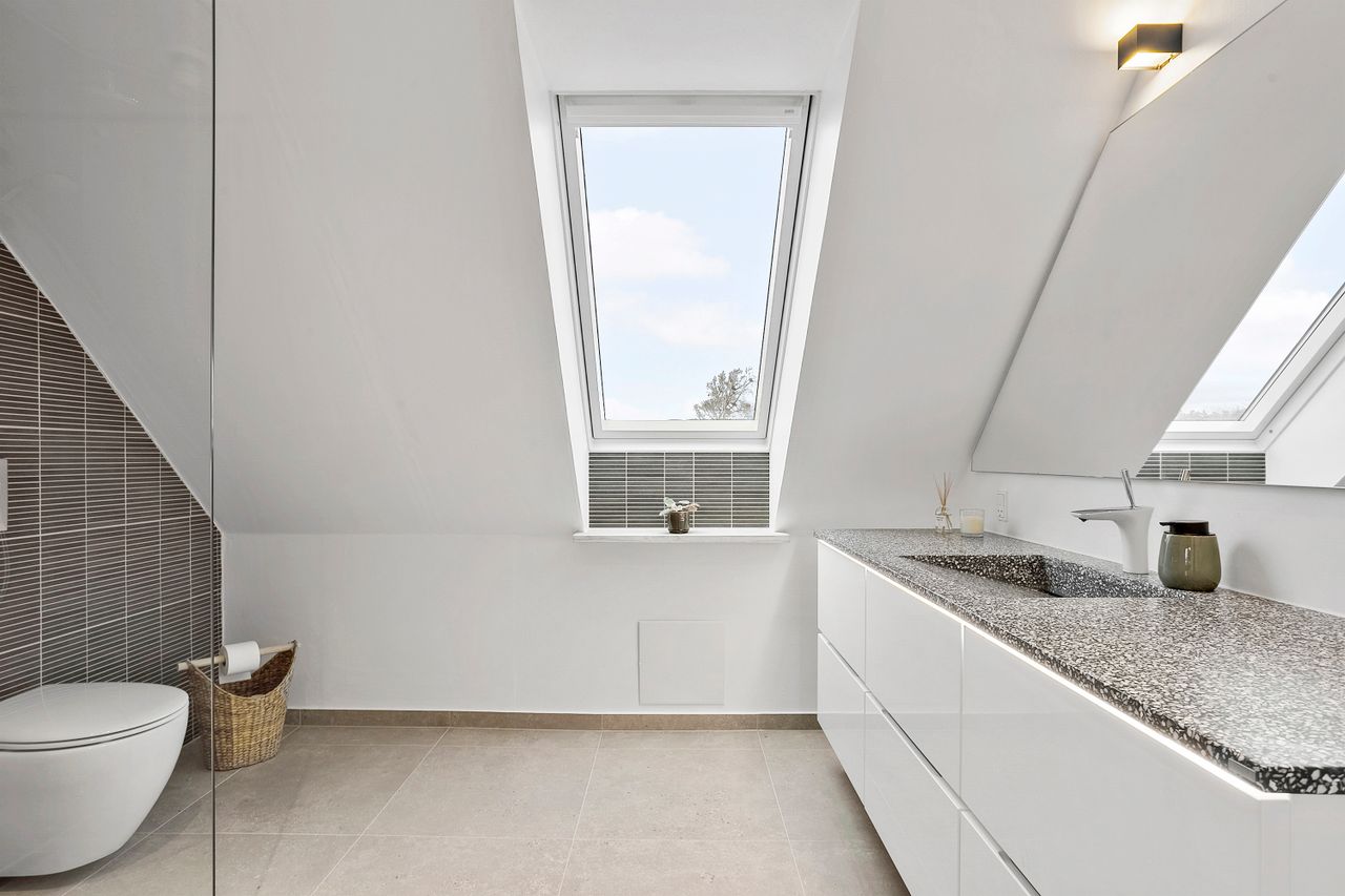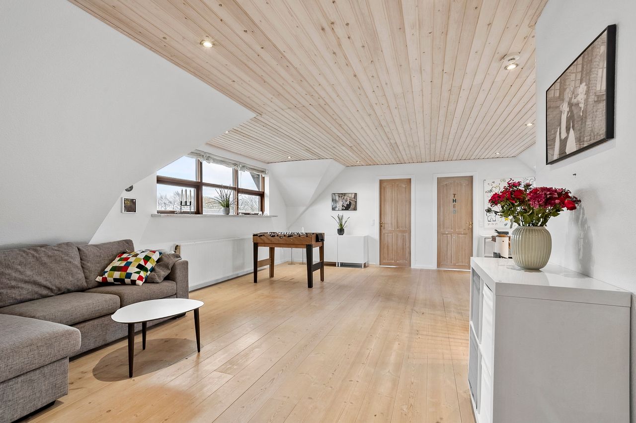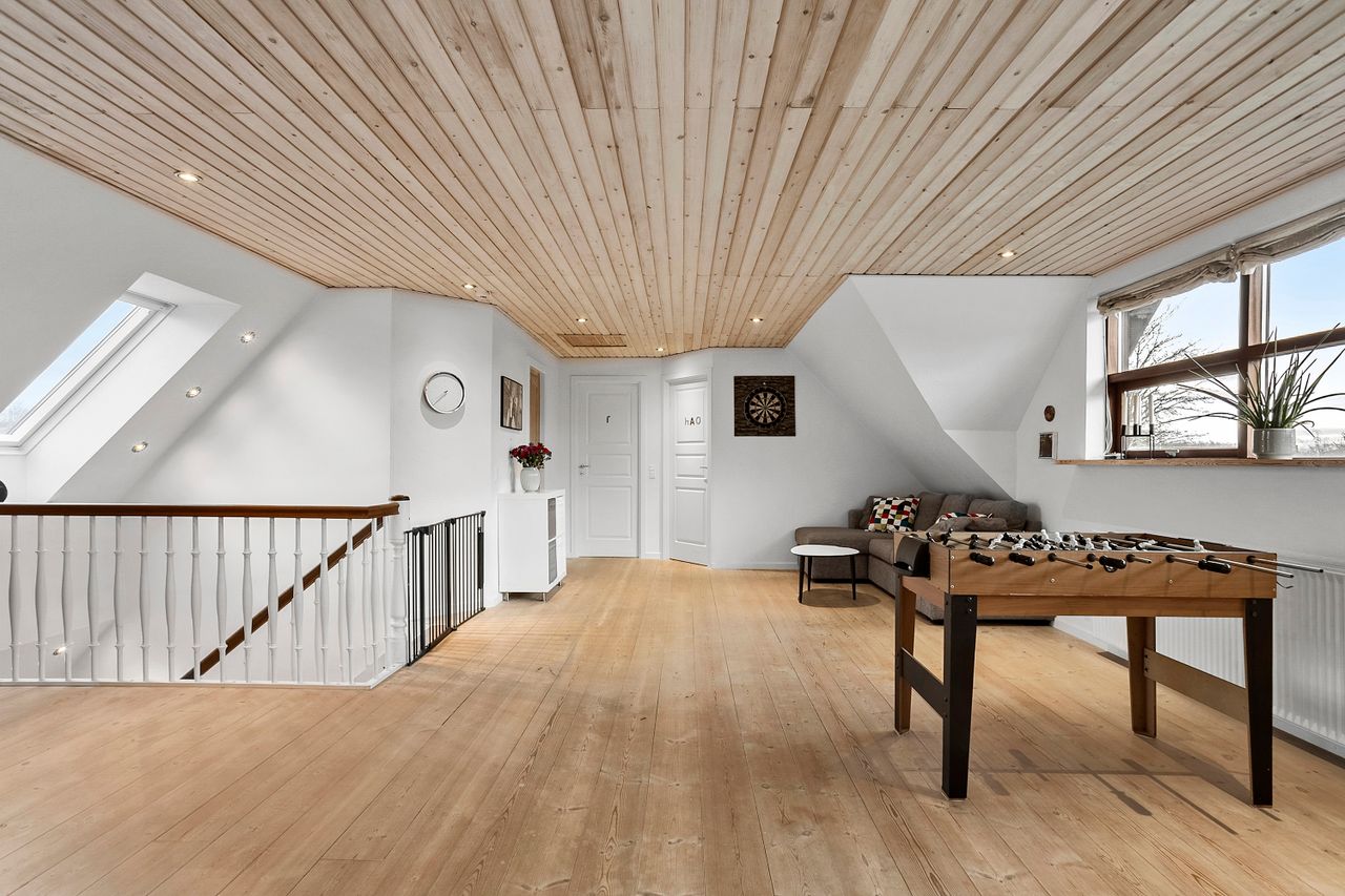 Overetagen består af et lyst og rummeligt repos, der kan bruges som ekstra opholdsstue, multirum eller legerum afhængigt af familiens behov. Hertil kommer fire store værelser samt et badeværelse, som er gennemgribende renoveret i 2025 og fremstår helt nyt og tidssvarende. Det giver et moderne og komfortabelt supplement til boligens øvrige faciliteter.