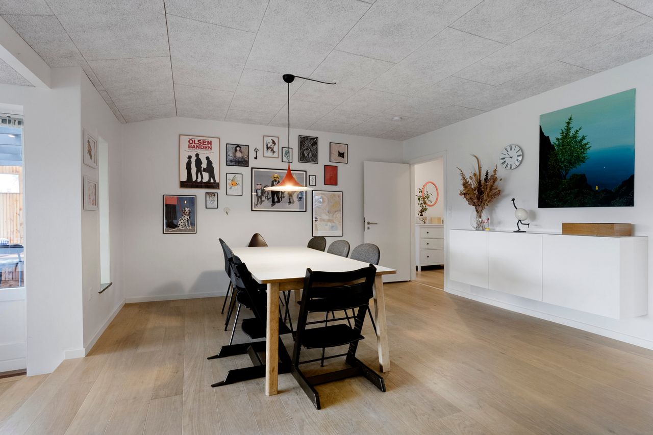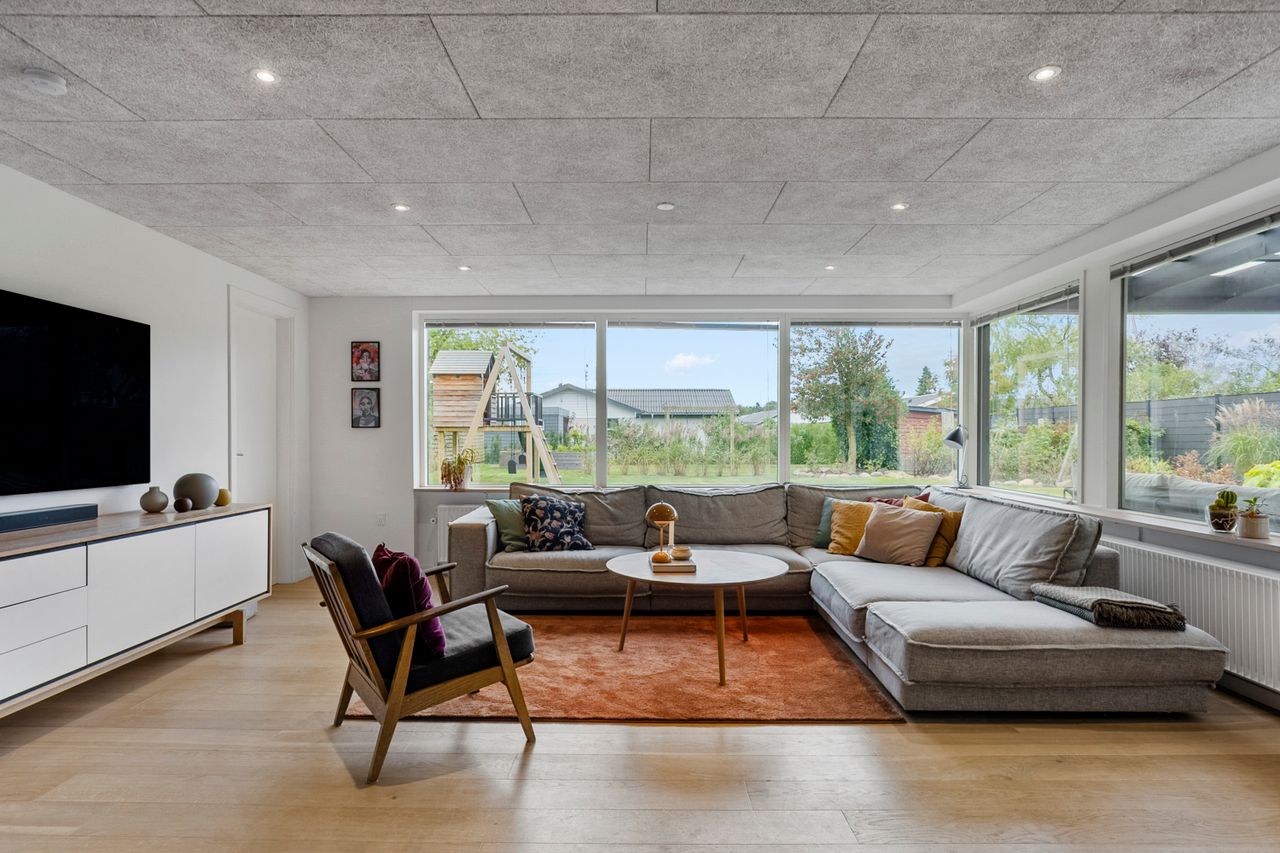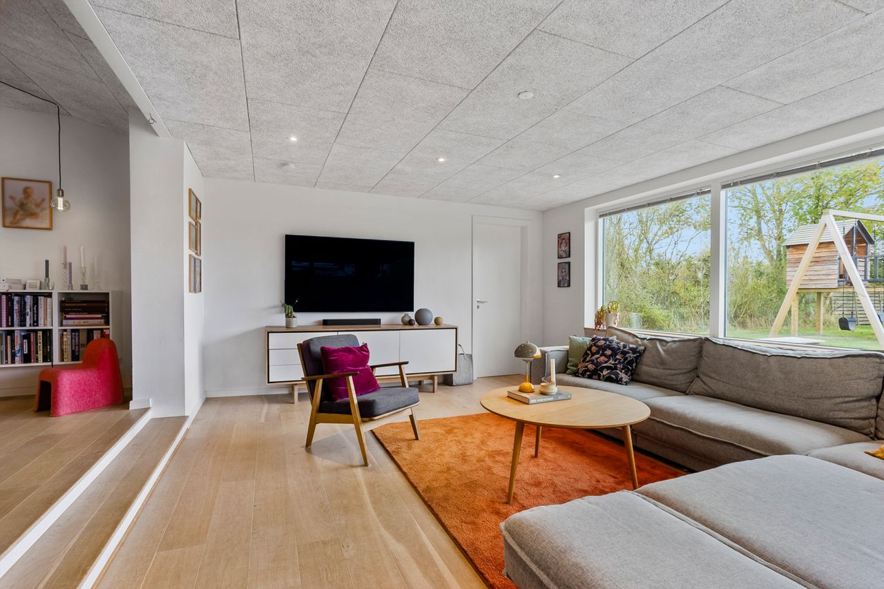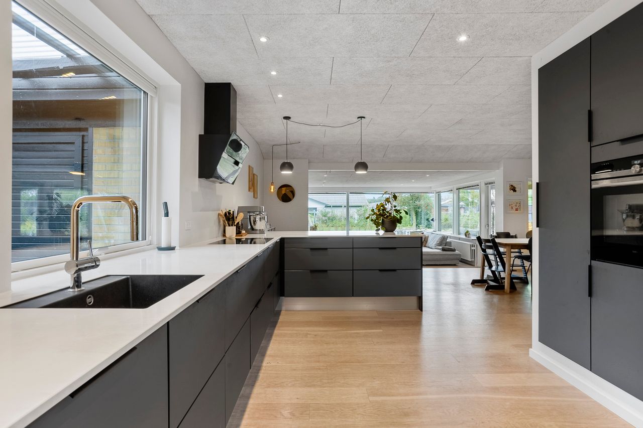 Når du træder ind, bydes du velkommen af et lyst og praktisk bryggers med god opbevaringsplads og plads til vaskesøjle. Herfra ledes du videre ind i husets naturlige samlingspunkt – det store, åbne køkken-alrum. Køkkenet fra HTH fremstår moderne og funktionelt, med masser af skabsplads og en indretning, der indbyder til fælles madlavning og samvær. Alrummet rummer en skøn spiseplads, hvor der let kan dækkes op til både hverdag og fest, og i forlængelse heraf finder du den nedsænkede stue med et dejligt lysindfald samt direkte udgang til den store, overdækkede terrasse.