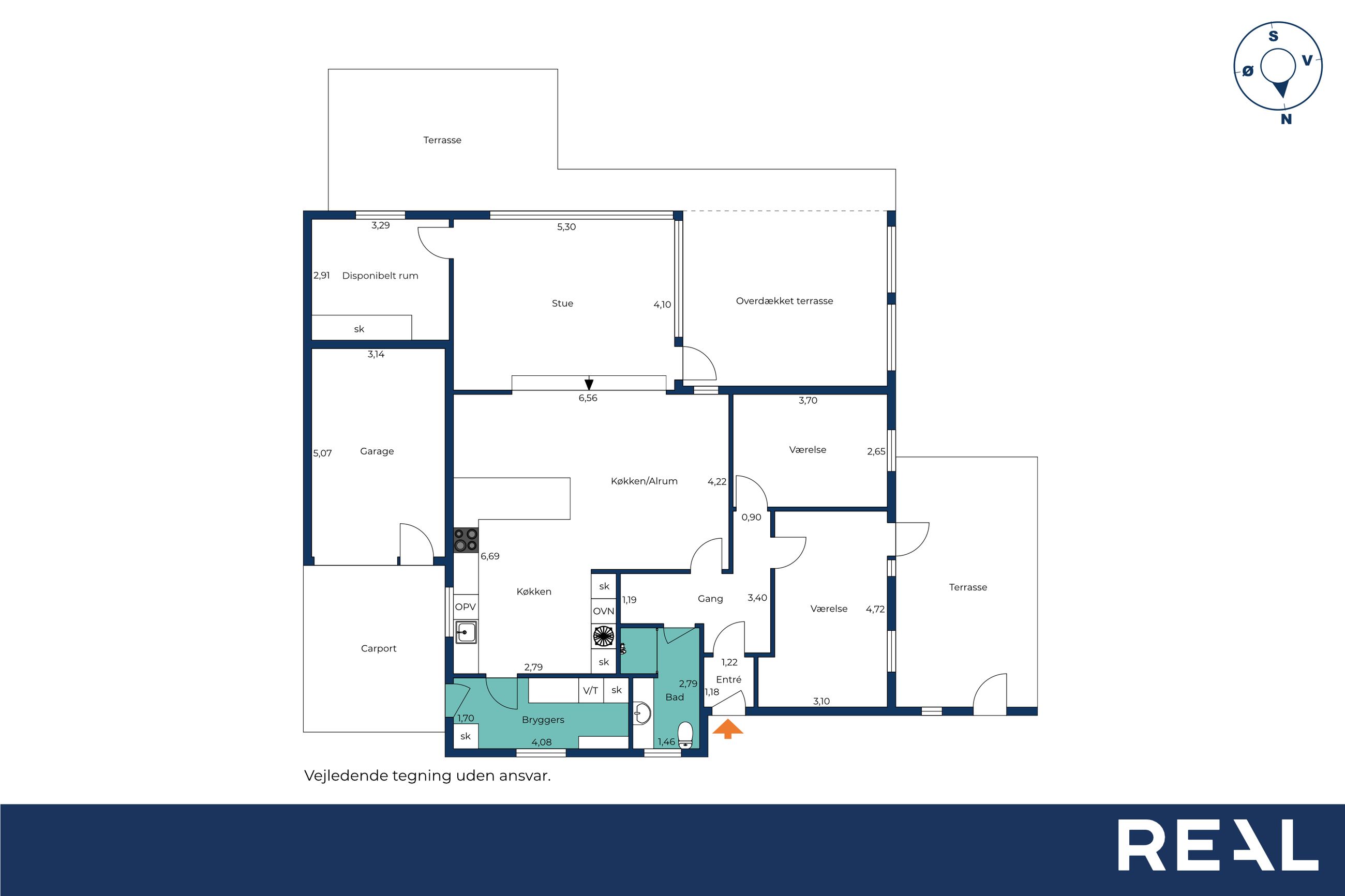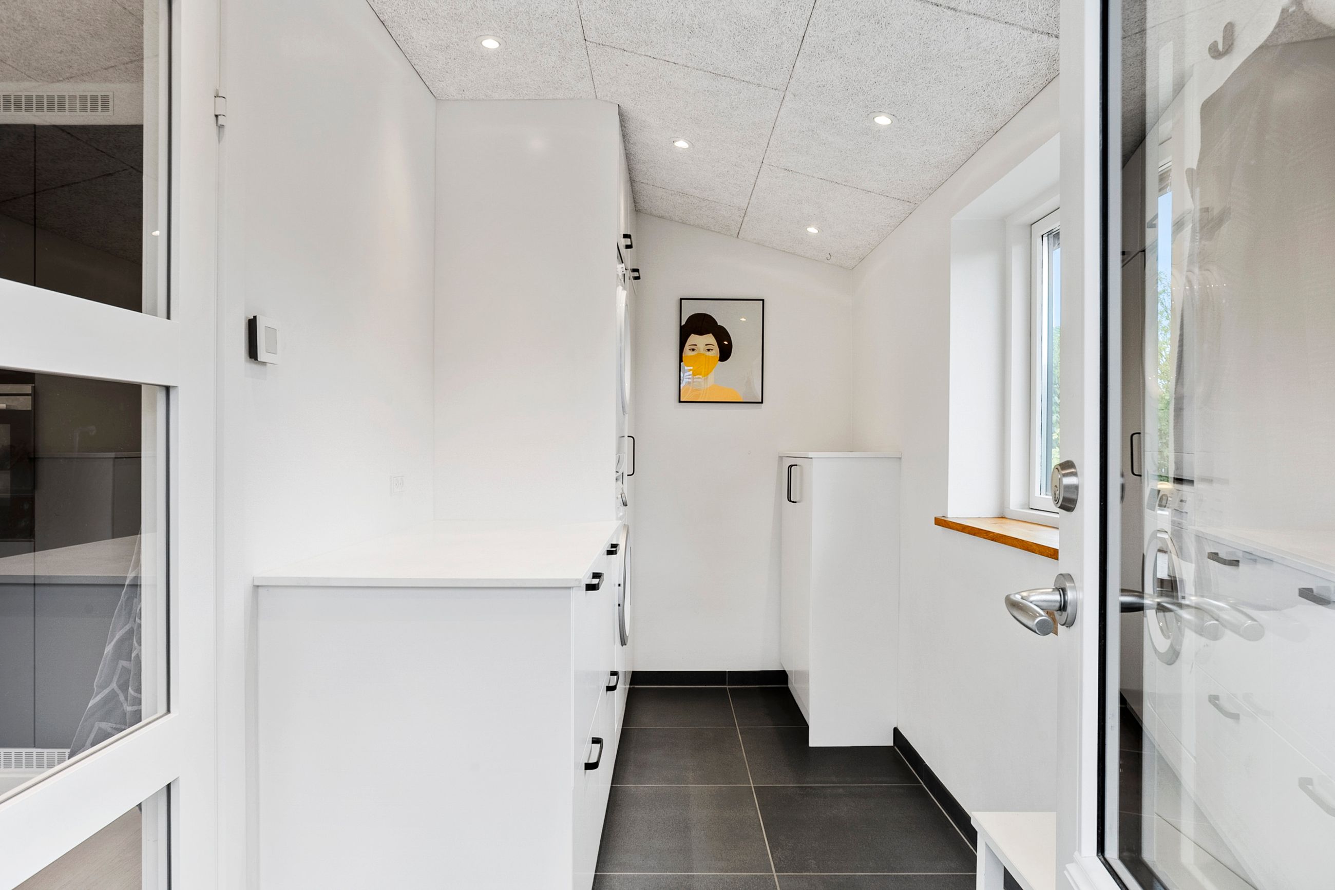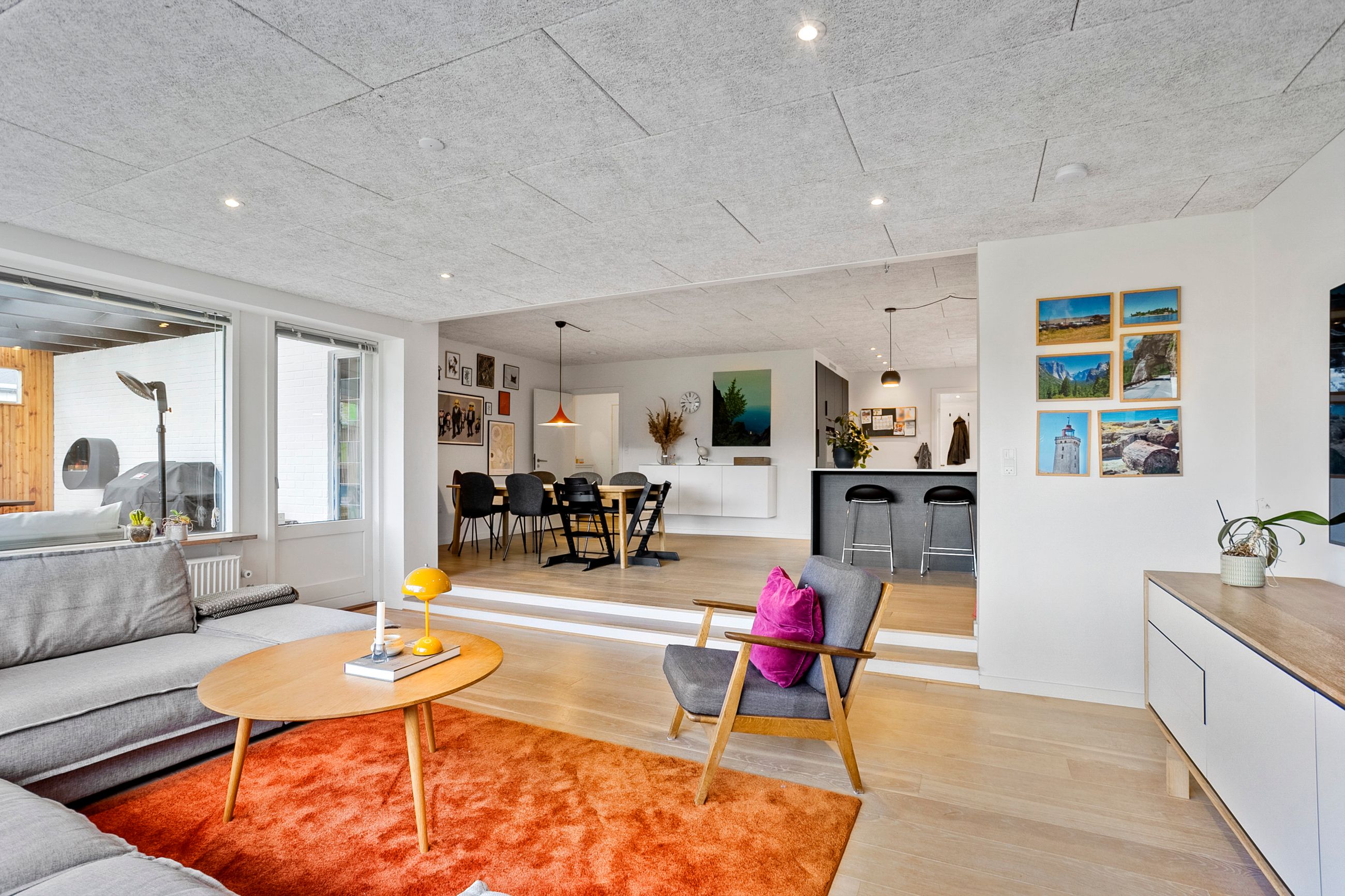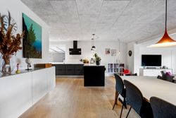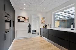 Når du træder ind, bydes du velkommen af et lyst og praktisk bryggers med god opbevaringsplads og plads til vaskesøjle. Herfra ledes du videre ind i husets naturlige samlingspunkt – det store, åbne køkken-alrum. Køkkenet fra HTH fremstår moderne og funktionelt, med masser af skabsplads og en indretning, der indbyder til fælles madlavning og samvær. Alrummet rummer en skøn spiseplads, hvor der let kan dækkes op til både hverdag og fest, og i forlængelse heraf finder du den nedsænkede stue med et dejligt lysindfald samt direkte udgang til den store, overdækkede terrasse.