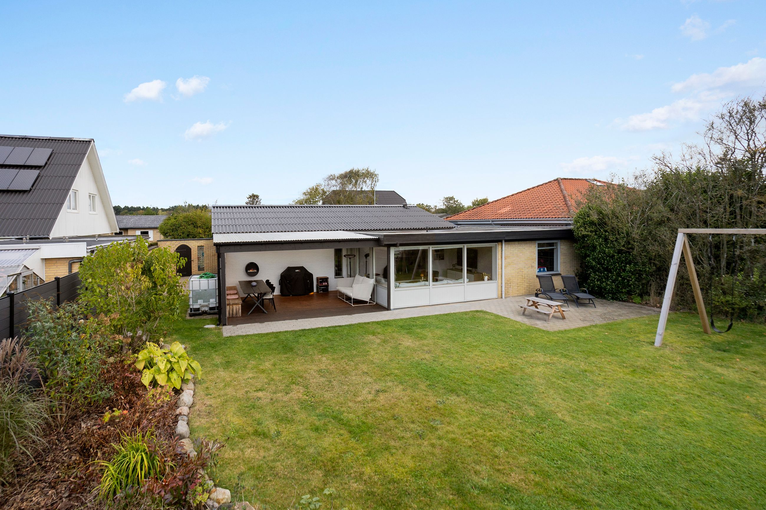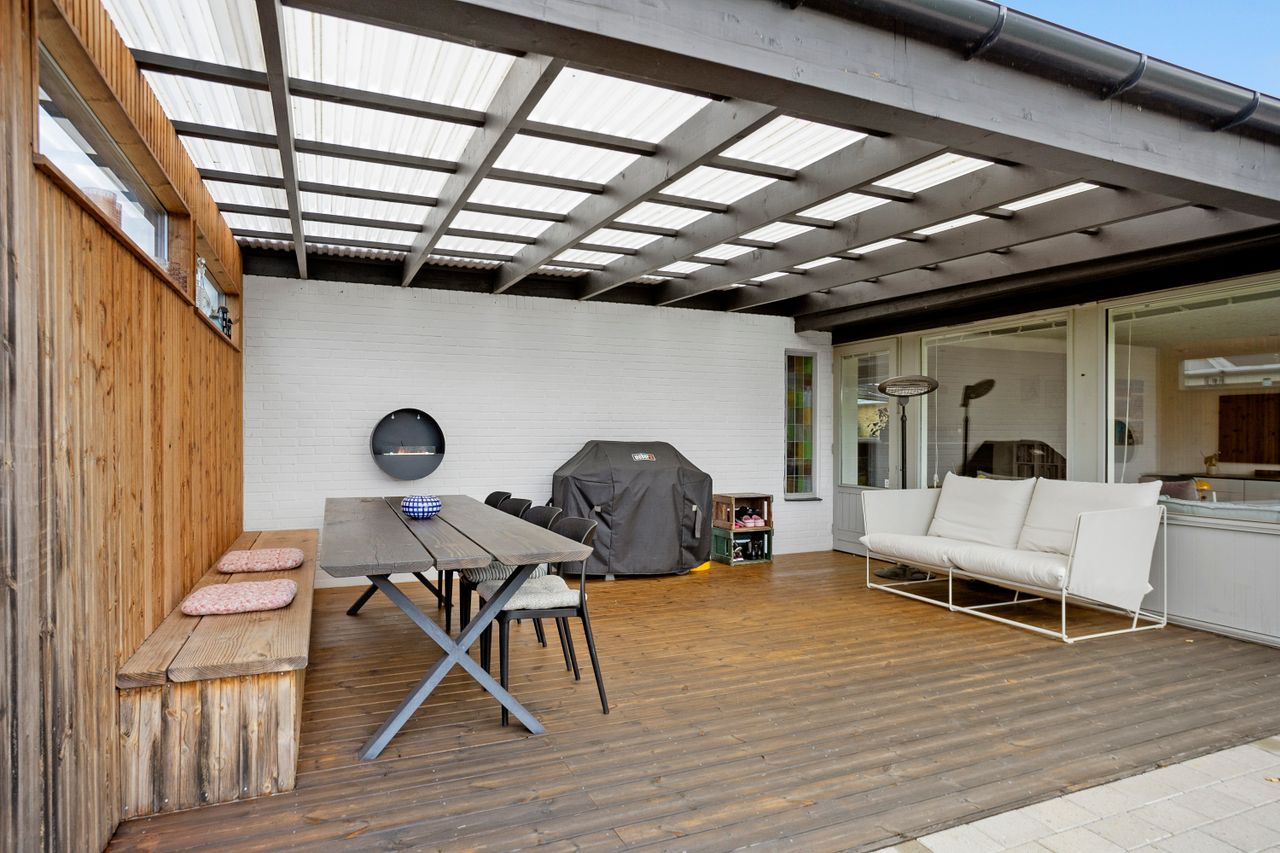 Udenfor venter en hyggelig og lukket have, som giver trygge rammer for leg og afslapning. Her er også en god terrasse, samt en carport og garage med plads til enten bil eller opbevaring.