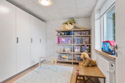 Huset indeholder desuden et soveværelse, et børneværelse, et flot og velholdt badeværelse, samt et ekstra disponibelt rum, der kan anvendes som kontor eller hobbyrum alt efter behov.