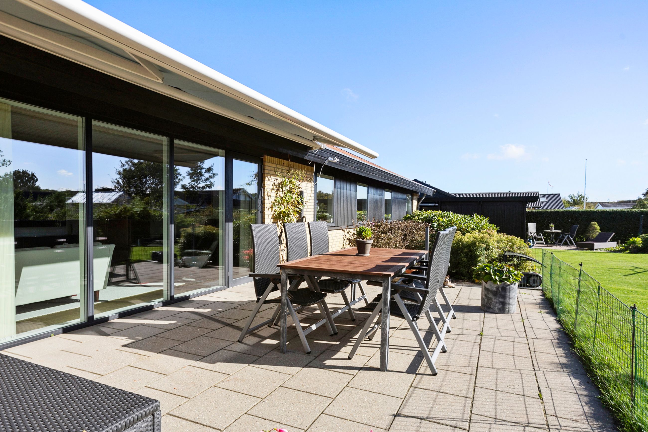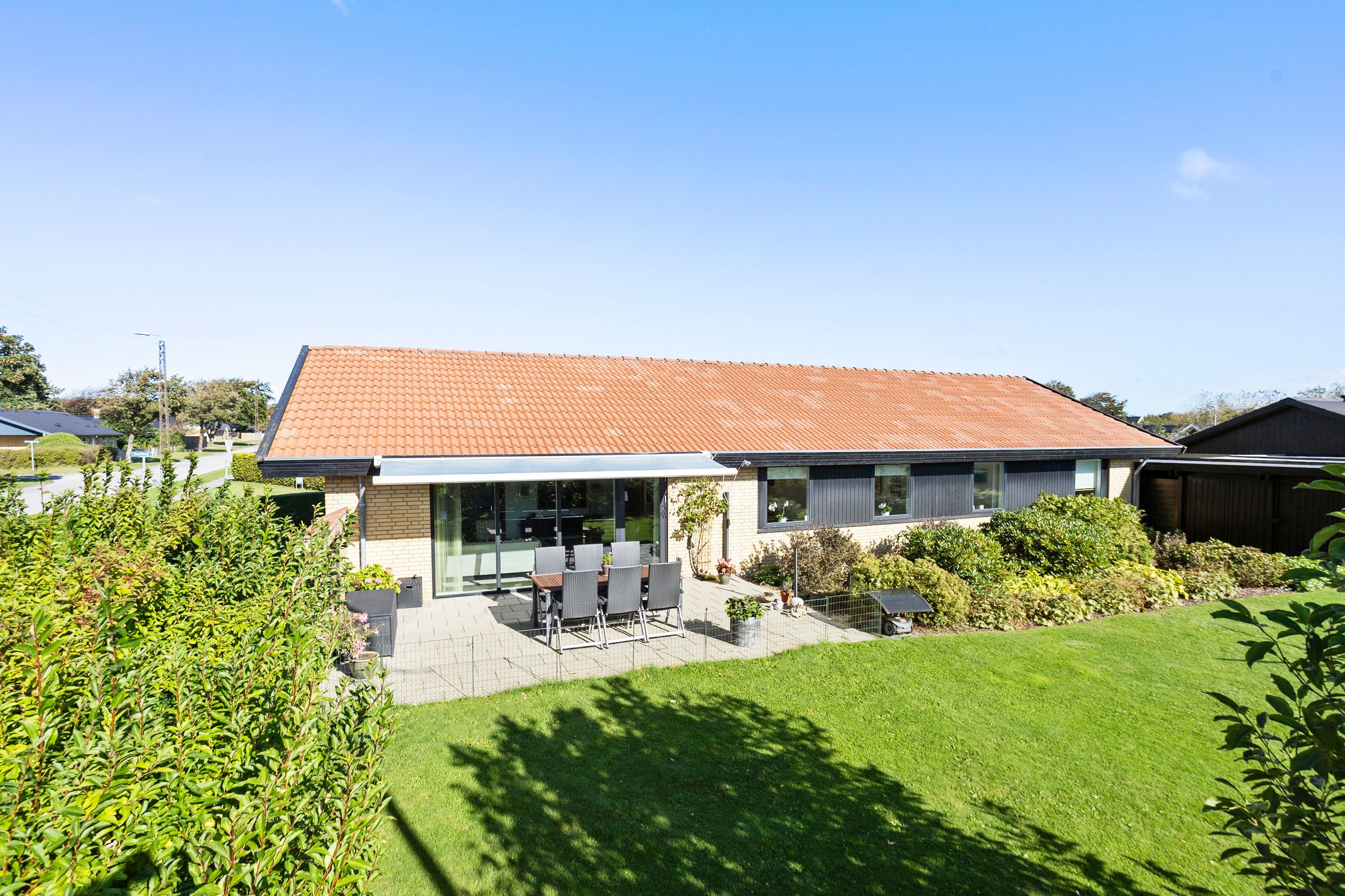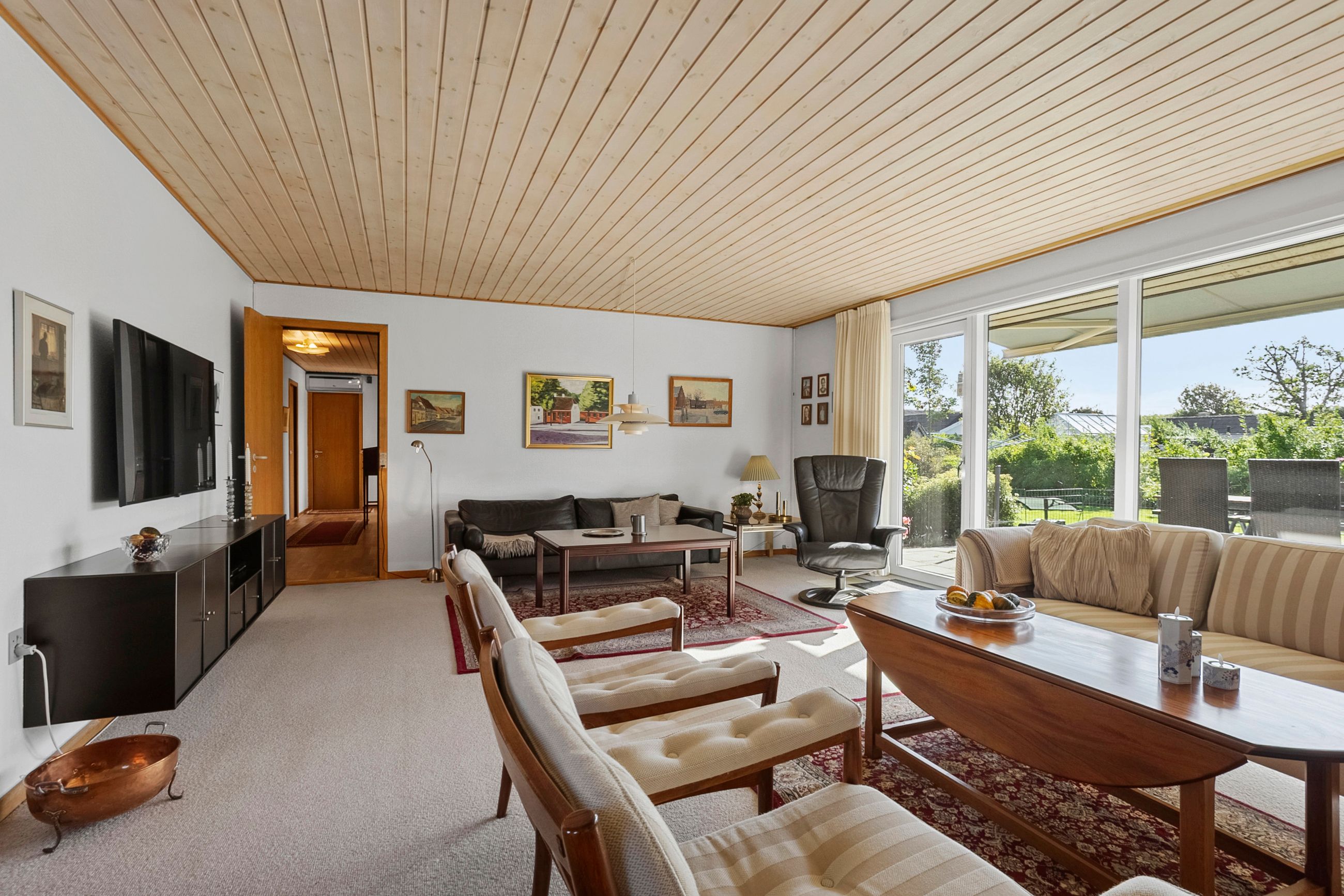 Villaen er opført i 1972 og rummer 132 kvadratmeter bolig fordelt på en gennemtænkt planløsning. Her finder du en entré, en fordelergang til soveværelse og to værelser – alle med indbyggede skabe. Boligens hjerte er den store, lyse vinkelstue, hvor solen strømmer ind gennem de store vinduespartier. Her er der plads til både spise- og opholdsområde, og med direkte udgang til den sydvendte terrasse forlænges sommeren nemt. På varme dage sørger en markise for sval skygge og et behageligt indeklima.