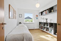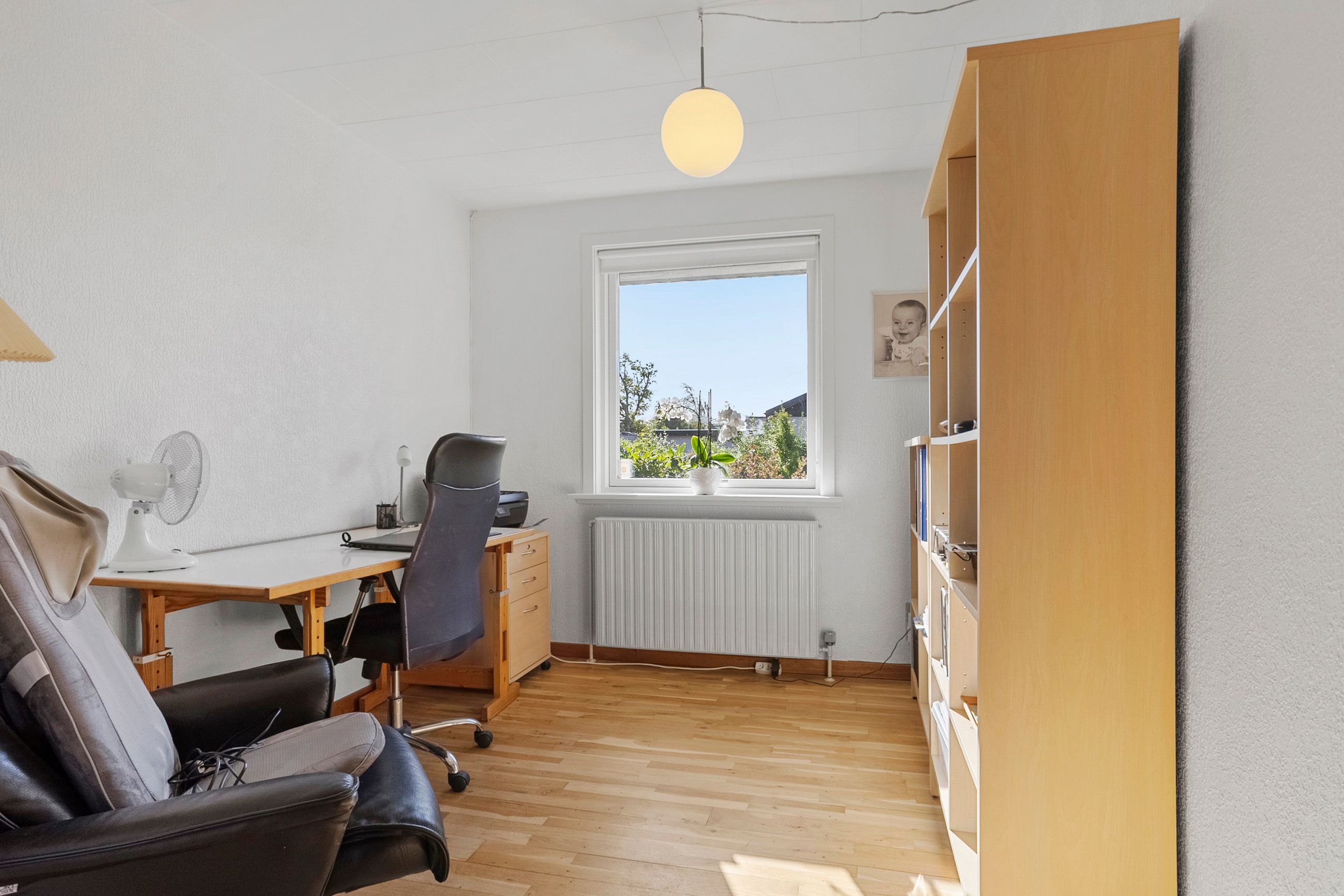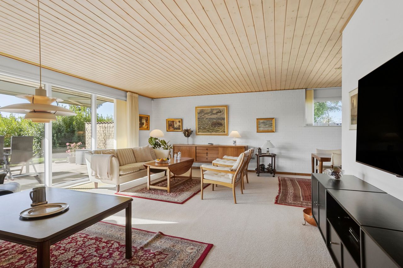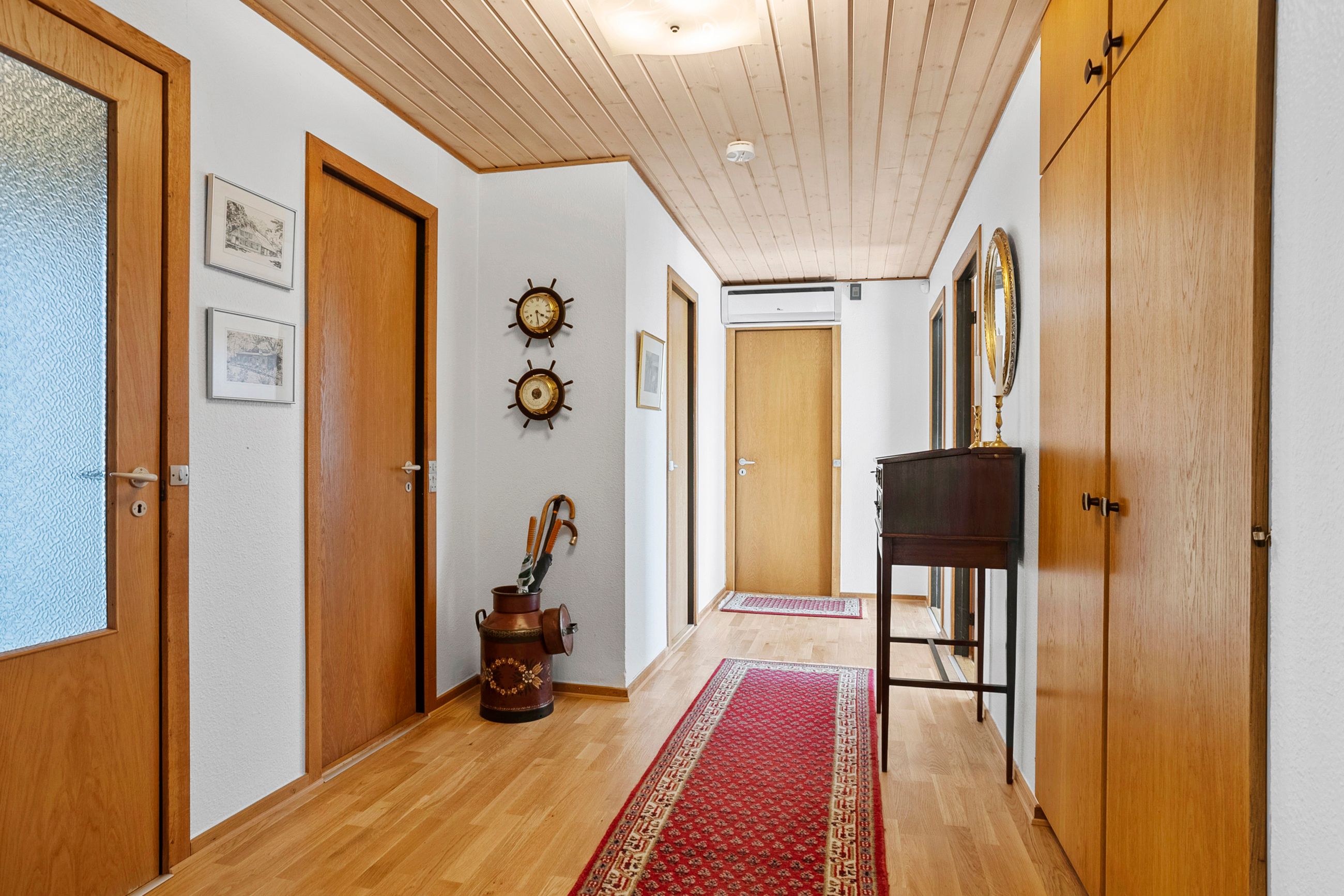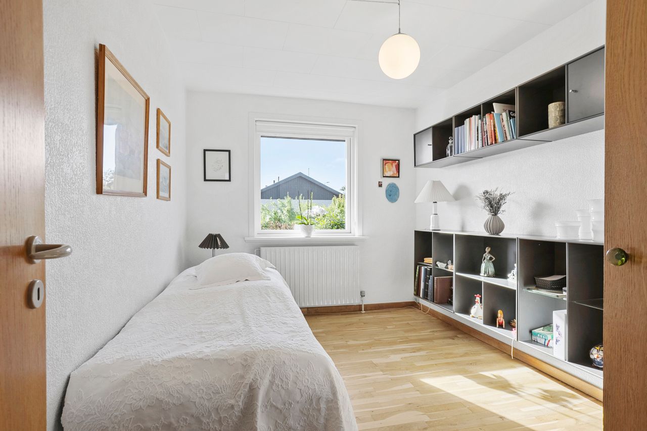 Villaen er opført i 1972 og rummer 132 kvadratmeter bolig fordelt på en gennemtænkt planløsning. Her finder du en entré, en fordelergang til soveværelse og to værelser – alle med indbyggede skabe. Boligens hjerte er den store, lyse vinkelstue, hvor solen strømmer ind gennem de store vinduespartier. Her er der plads til både spise- og opholdsområde, og med direkte udgang til den sydvendte terrasse forlænges sommeren nemt. På varme dage sørger en markise for sval skygge og et behageligt indeklima.
