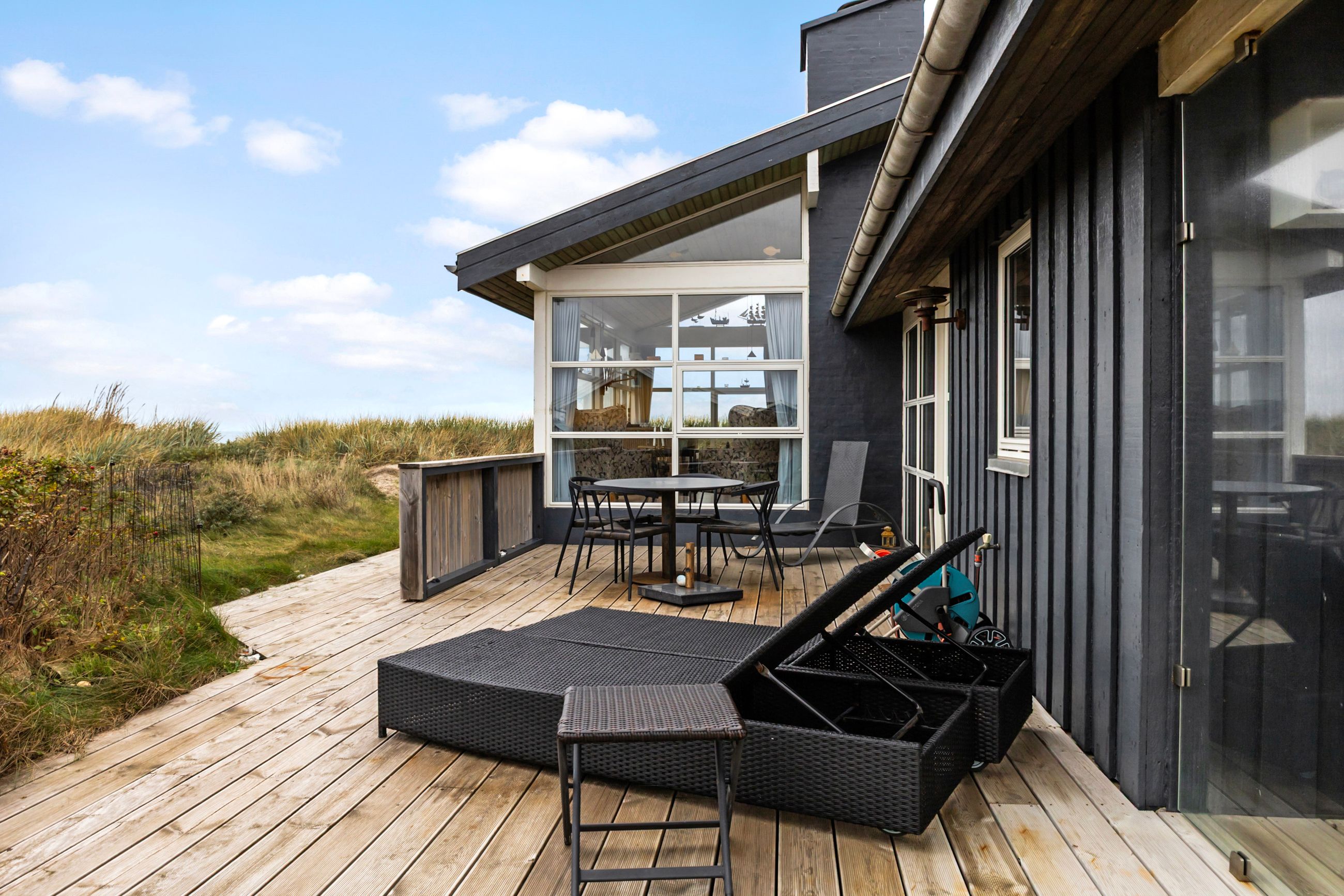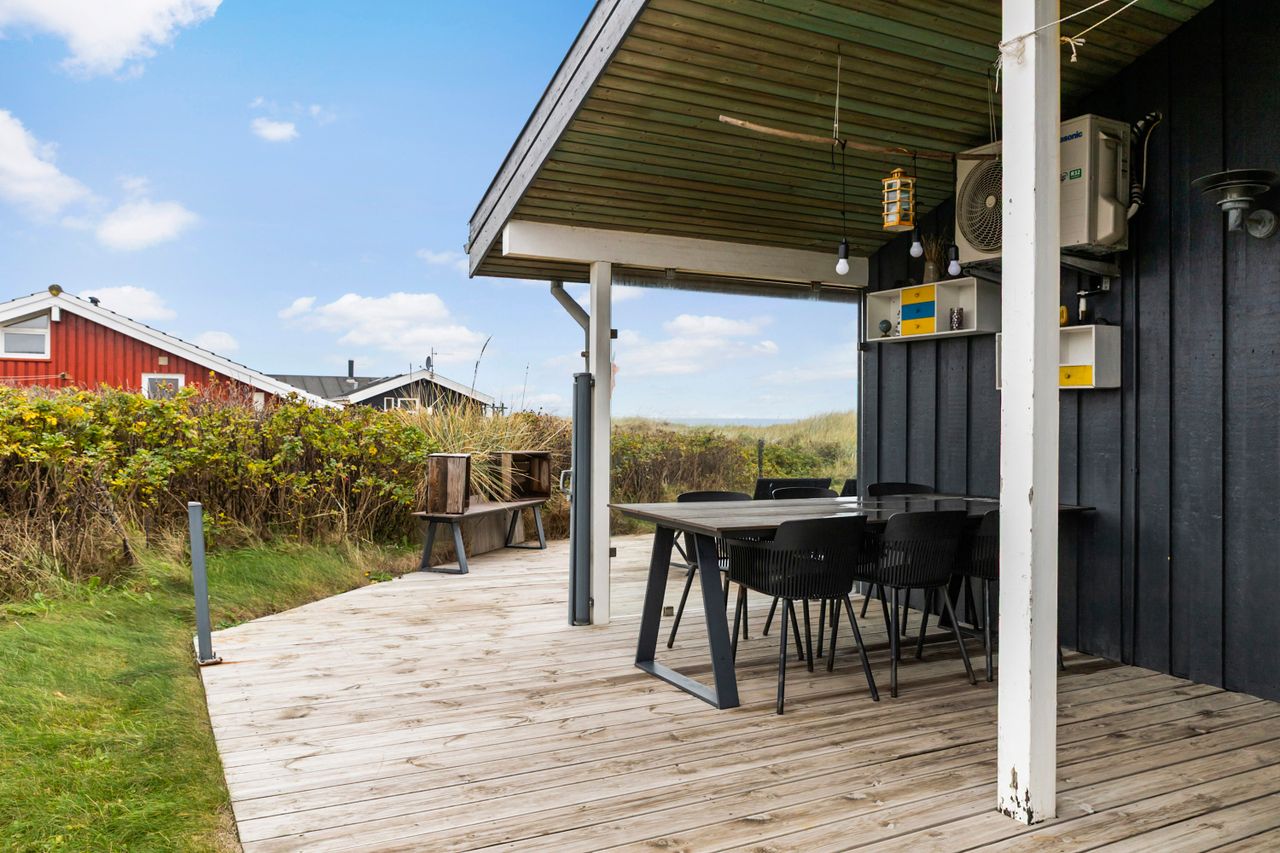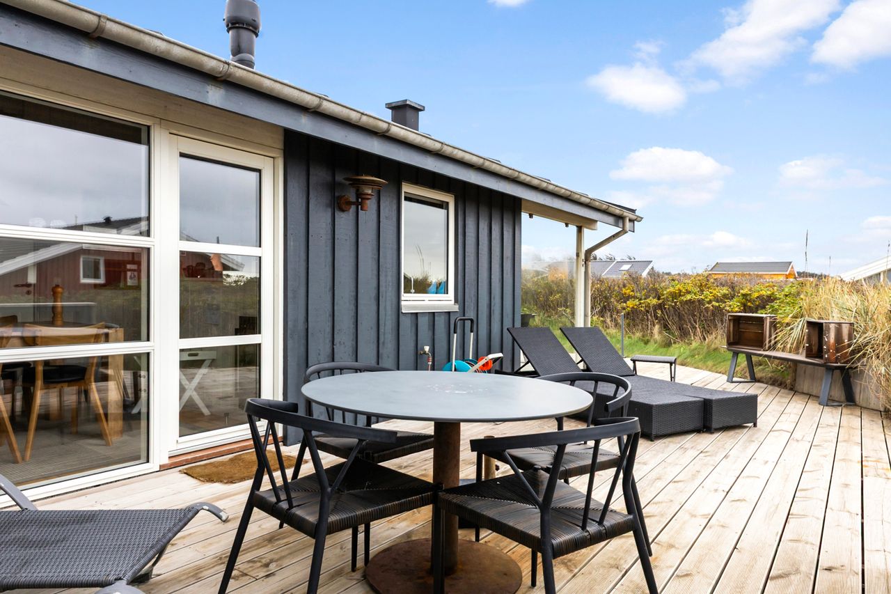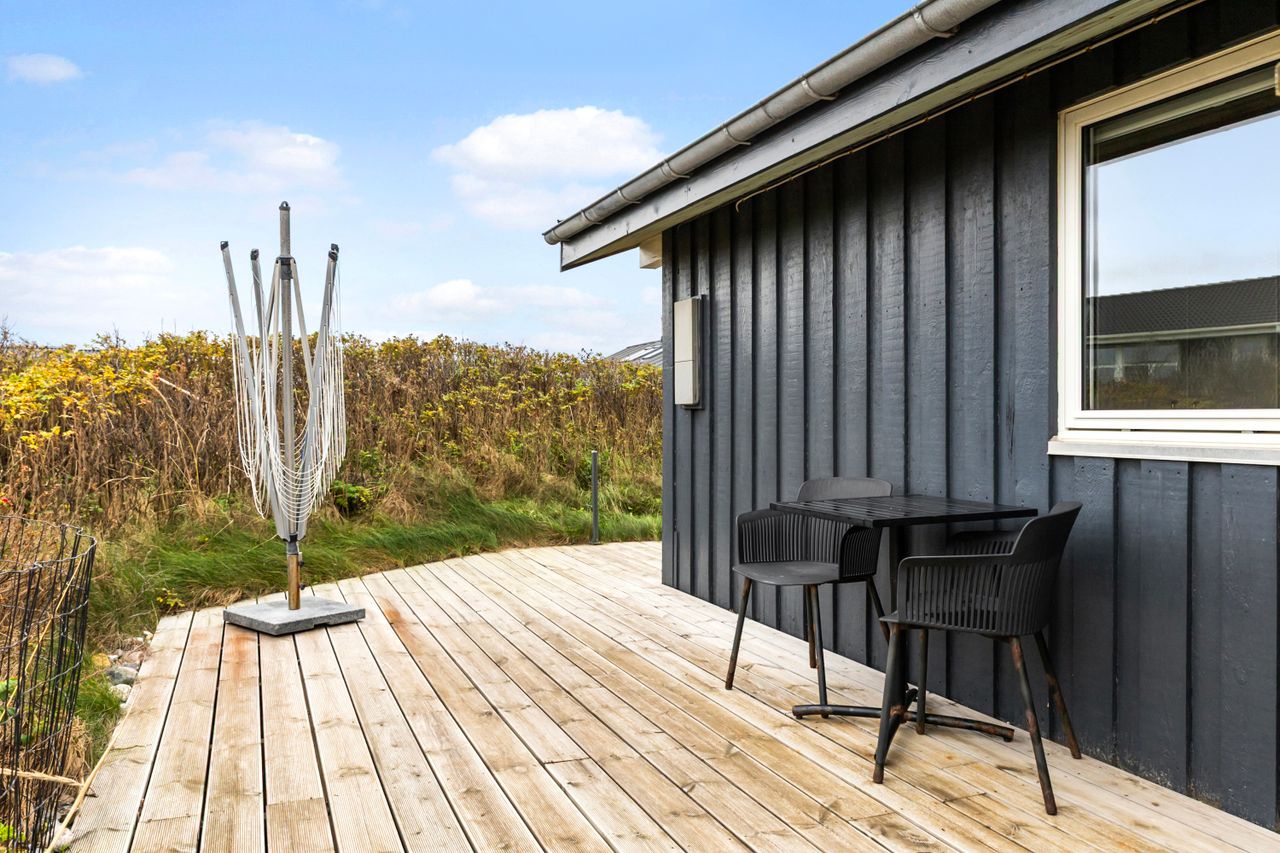 Grunden er en naturlig klitgrund, omkranset af hybenroser og havtorn, der giver læ og privatliv. Det store udendørsareal foran huset egner sig ideelt til boldspil og leg, og de mange terrasser med gode lækroge gør det muligt at nyde udelivet næsten hele året.