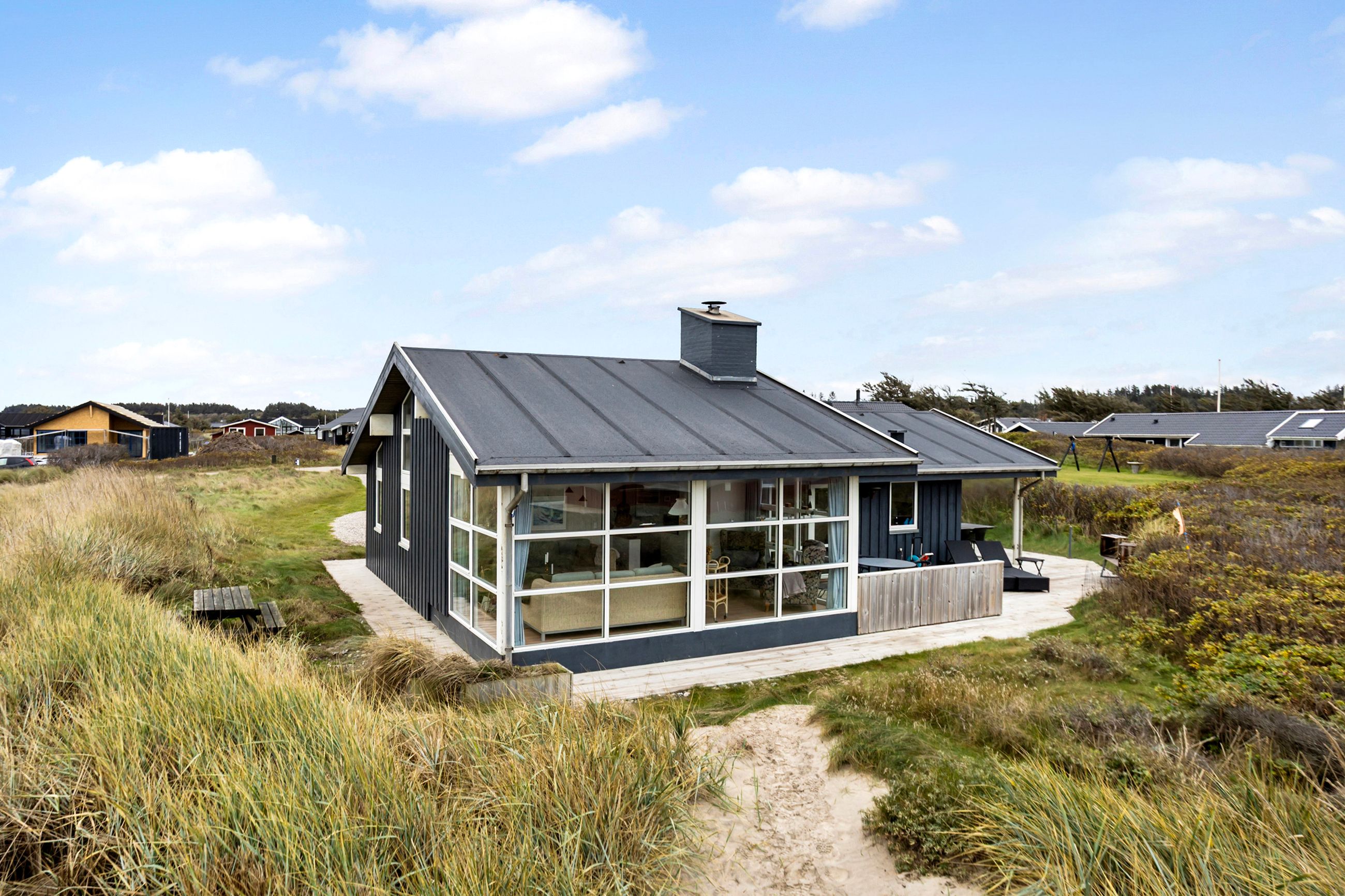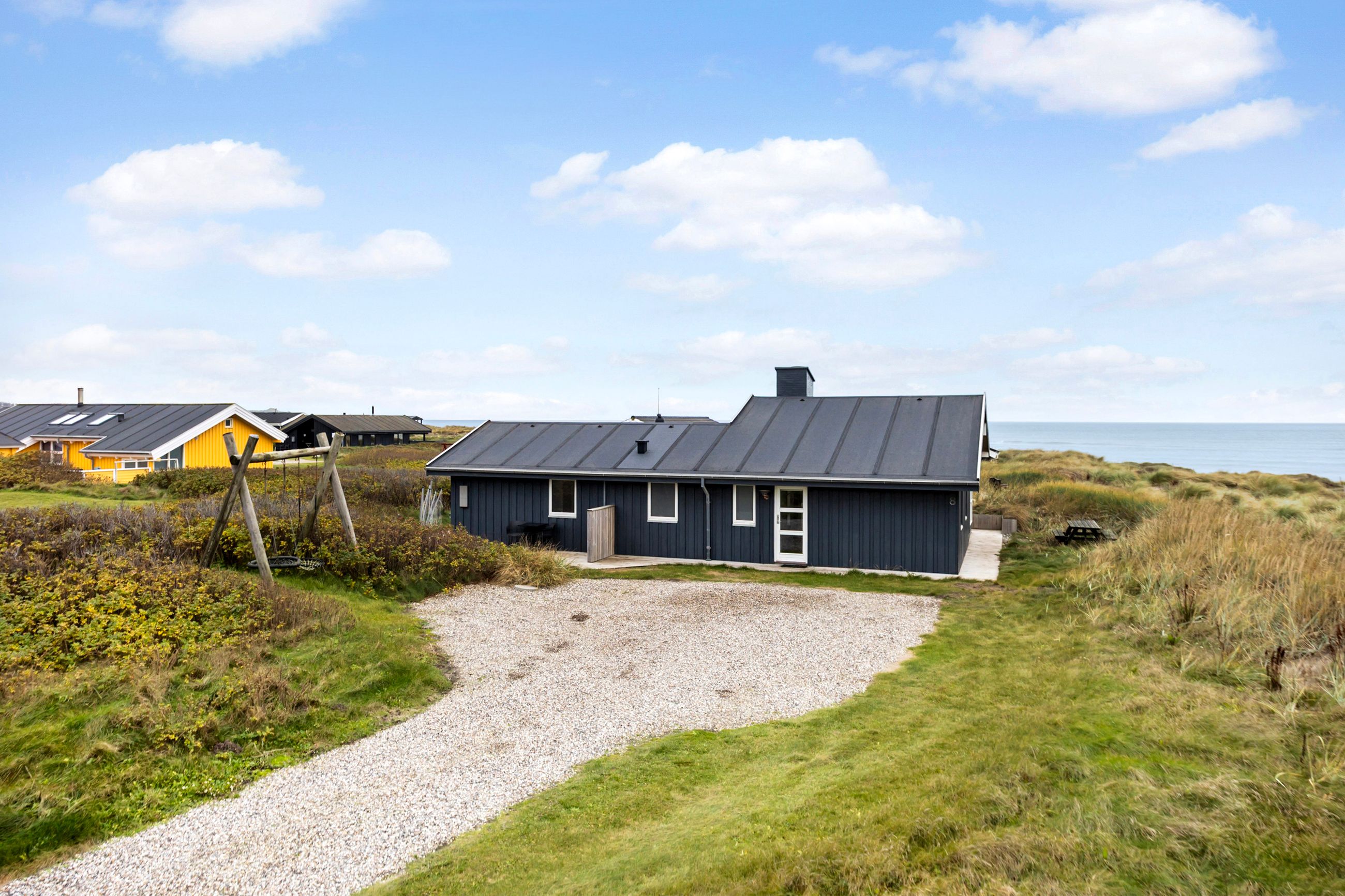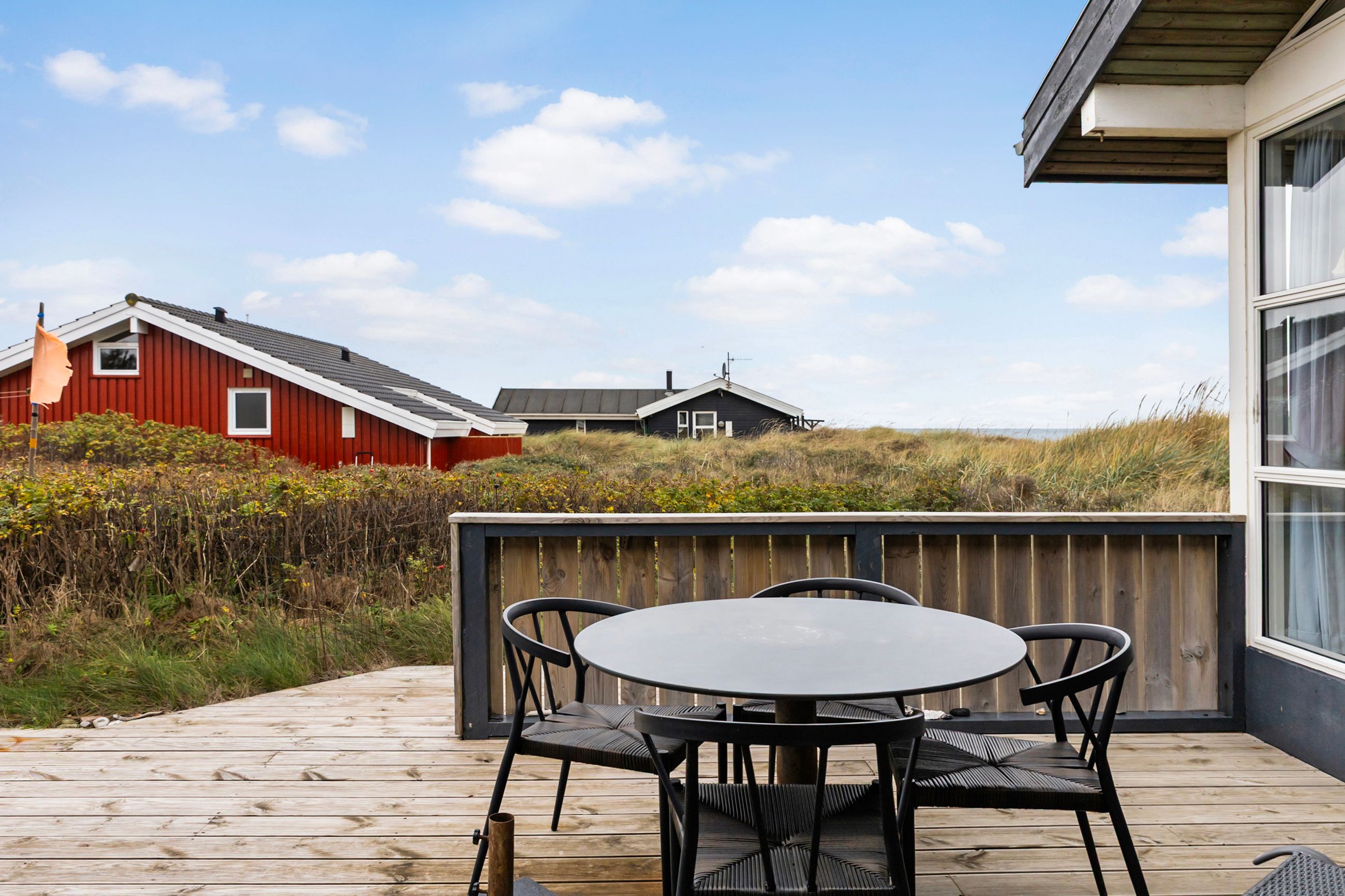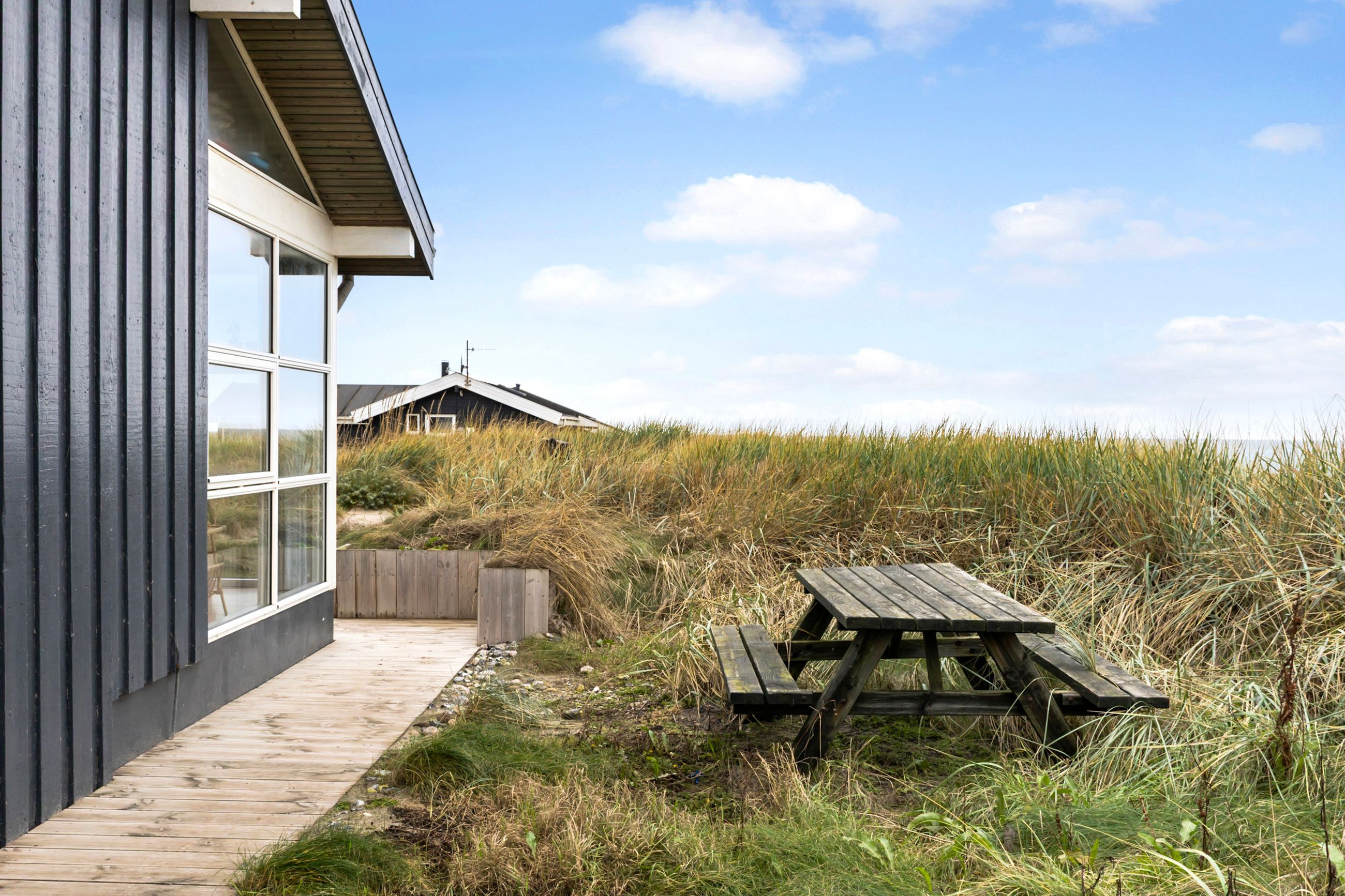 Grunden er en naturlig klitgrund, omkranset af hybenroser og havtorn, der giver læ og privatliv. Det store udendørsareal foran huset egner sig ideelt til boldspil og leg, og de mange terrasser med gode lækroge gør det muligt at nyde udelivet næsten hele året.