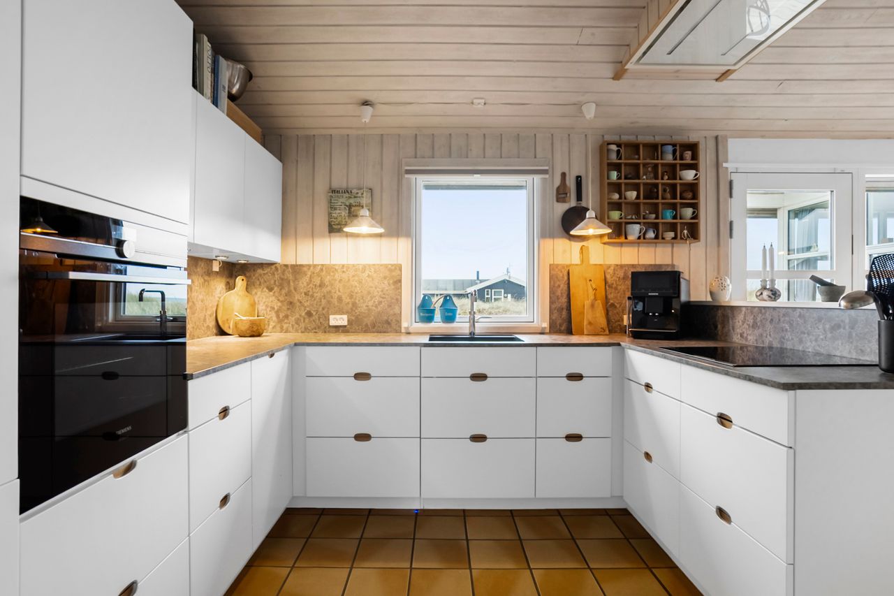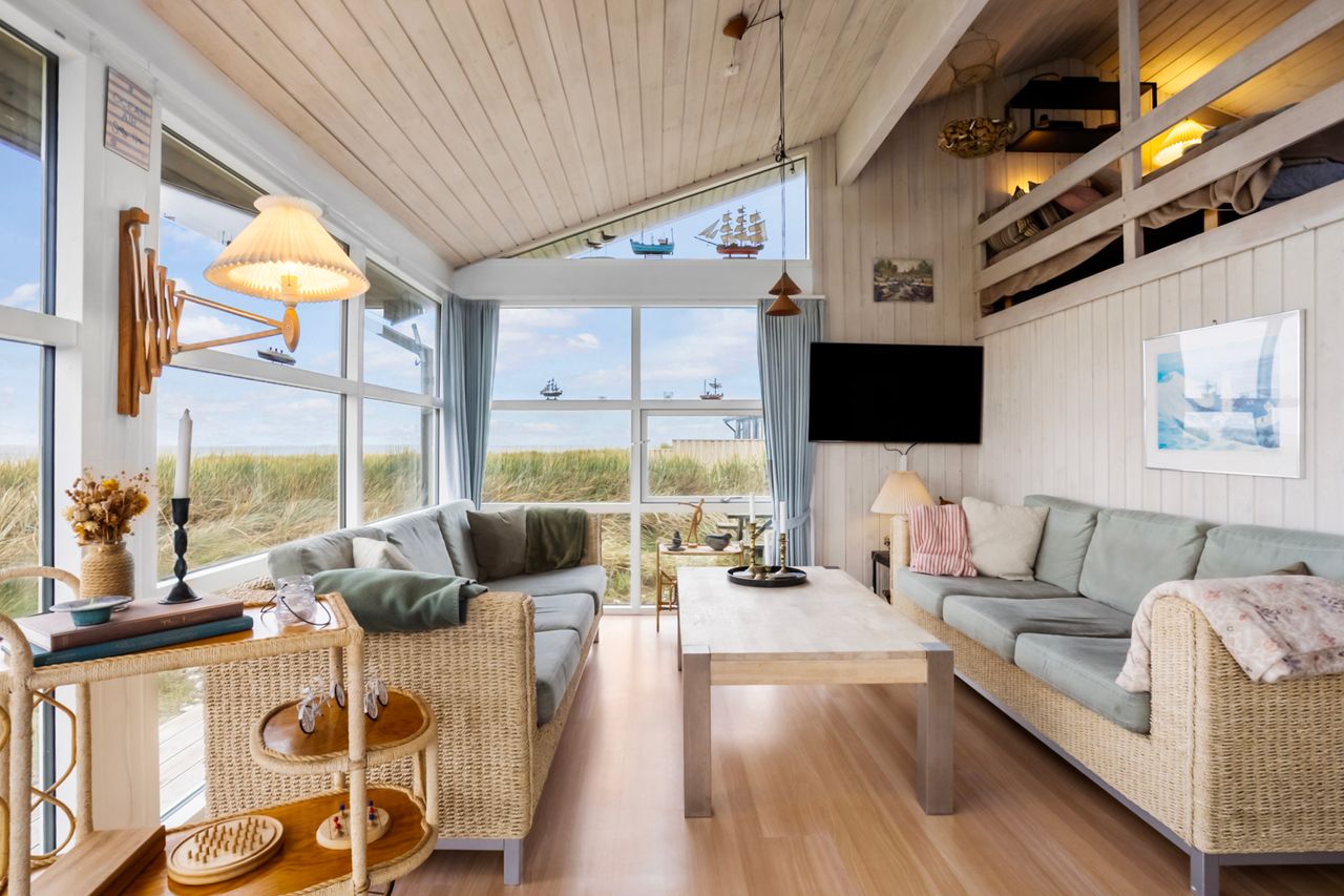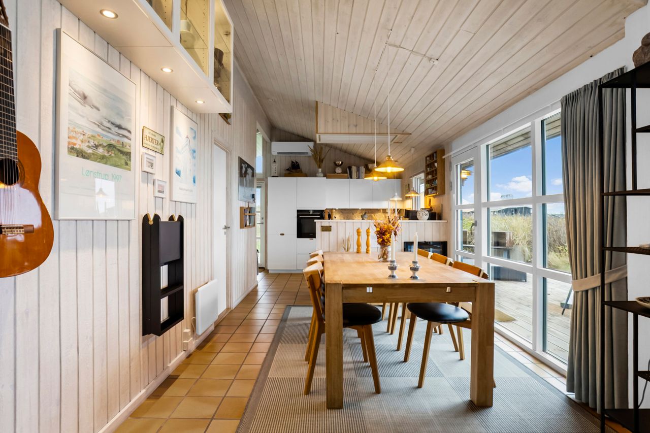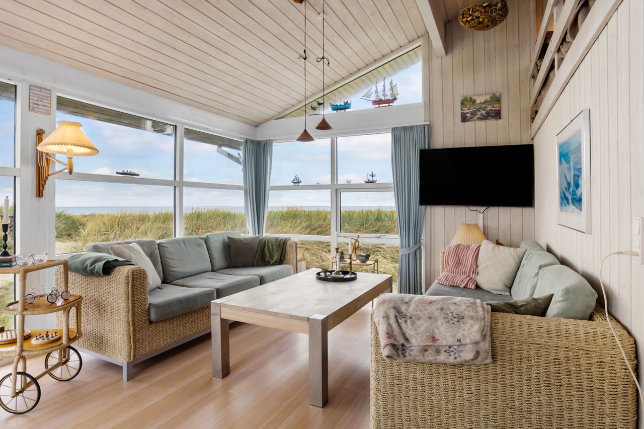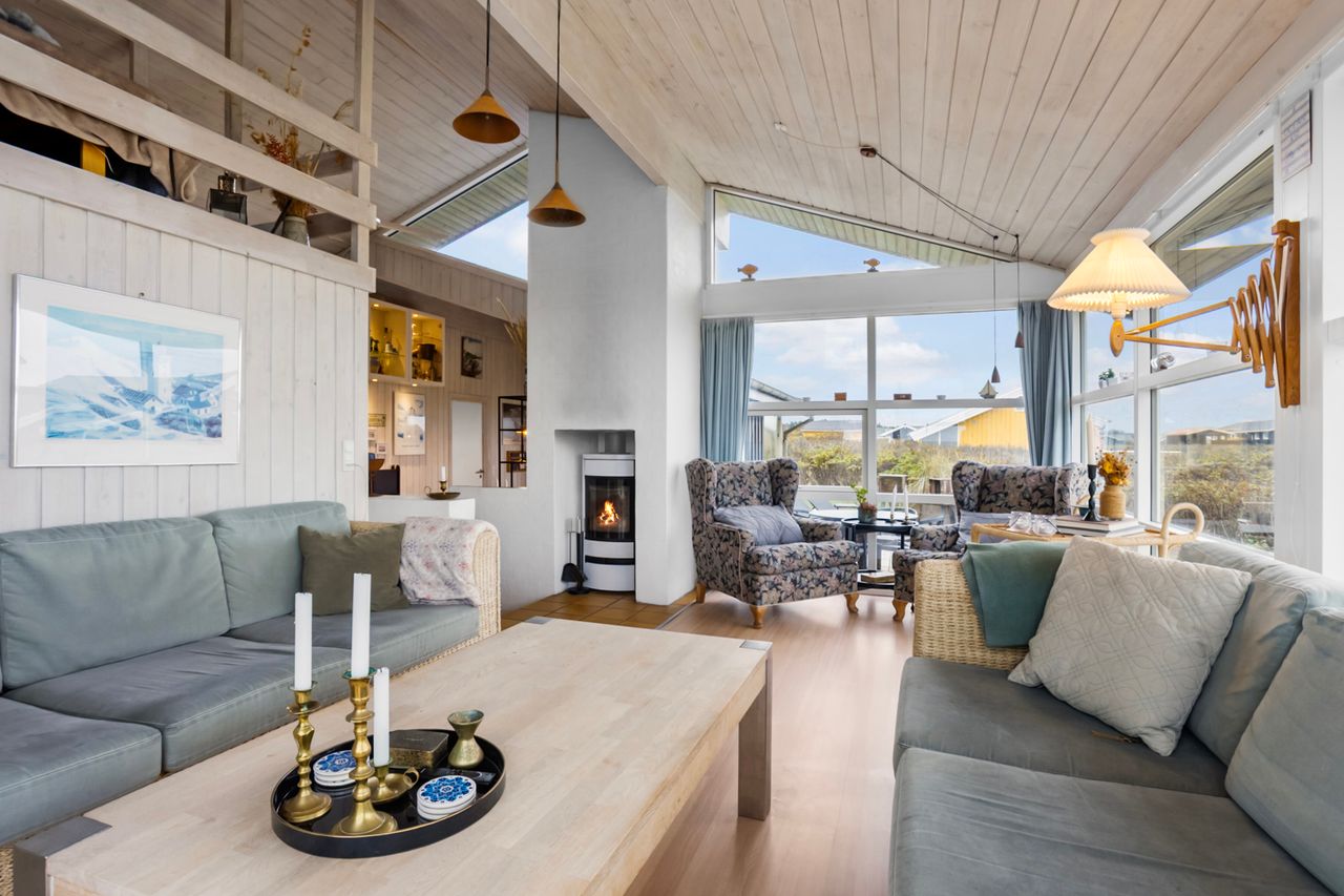 Huset byder på 89 m2 og er placeret på en 1.250 m2 stor klitgrund. Indretningen er både praktisk og indbydende med et lyst og åbent køkken-alrum, hvorfra der er forbindelse til opholdsstuen. Herfra fører to trin op til stuen med sofakrog og den fantastiske udsigt over havet. Mellem de to opholdsafdelinger finder du en hyggelig brændeovn, der skaber både varme og stemning på kølige aftener.