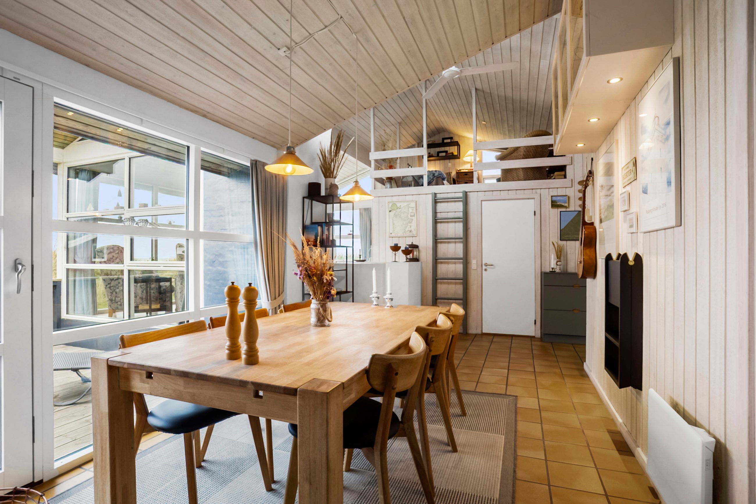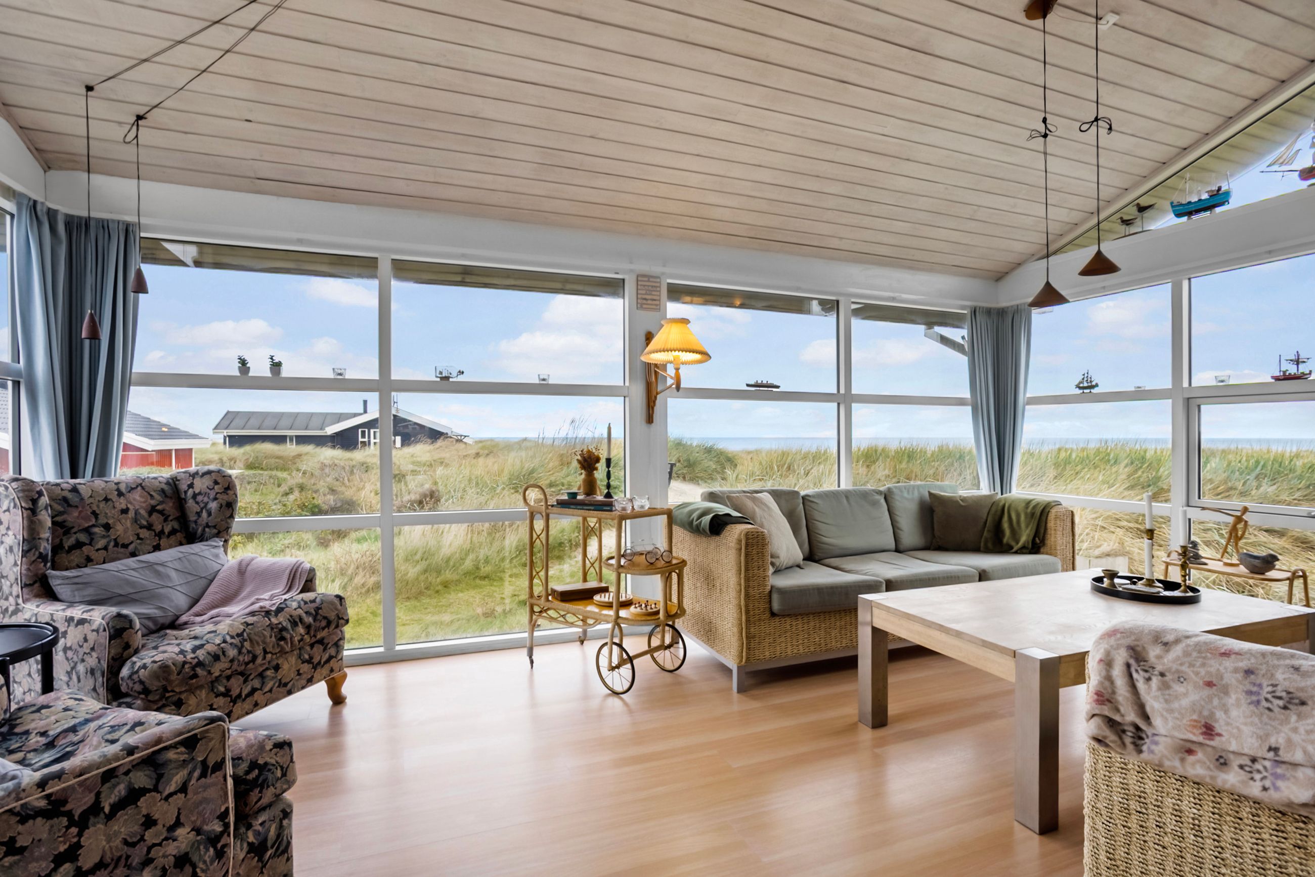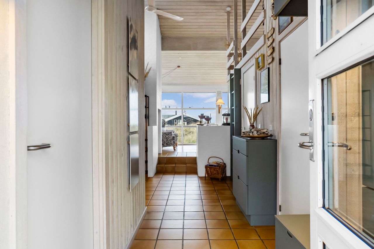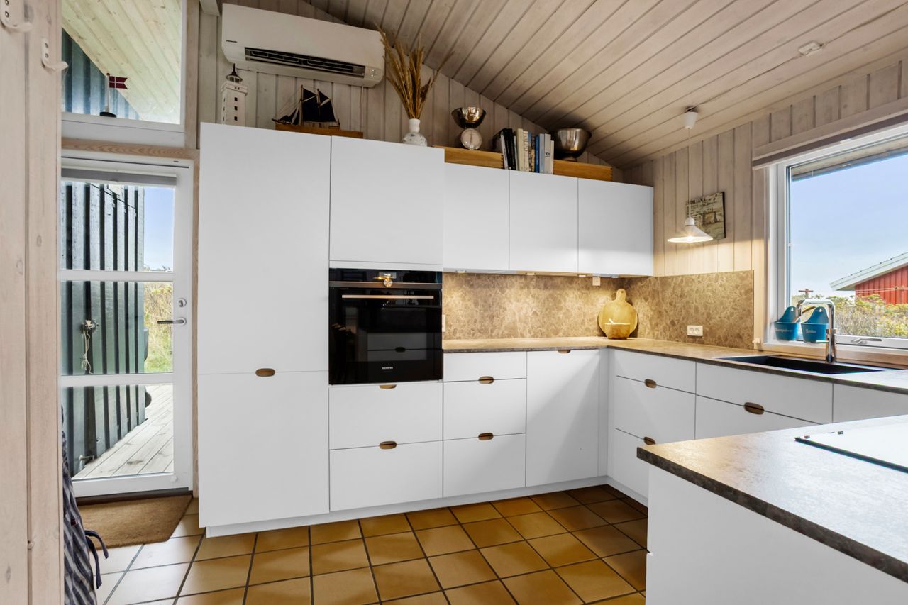 Huset byder på 89 m2 og er placeret på en 1.250 m2 stor klitgrund. Indretningen er både praktisk og indbydende med et lyst og åbent køkken-alrum, hvorfra der er forbindelse til opholdsstuen. Herfra fører to trin op til stuen med sofakrog og den fantastiske udsigt over havet. Mellem de to opholdsafdelinger finder du en hyggelig brændeovn, der skaber både varme og stemning på kølige aftener.