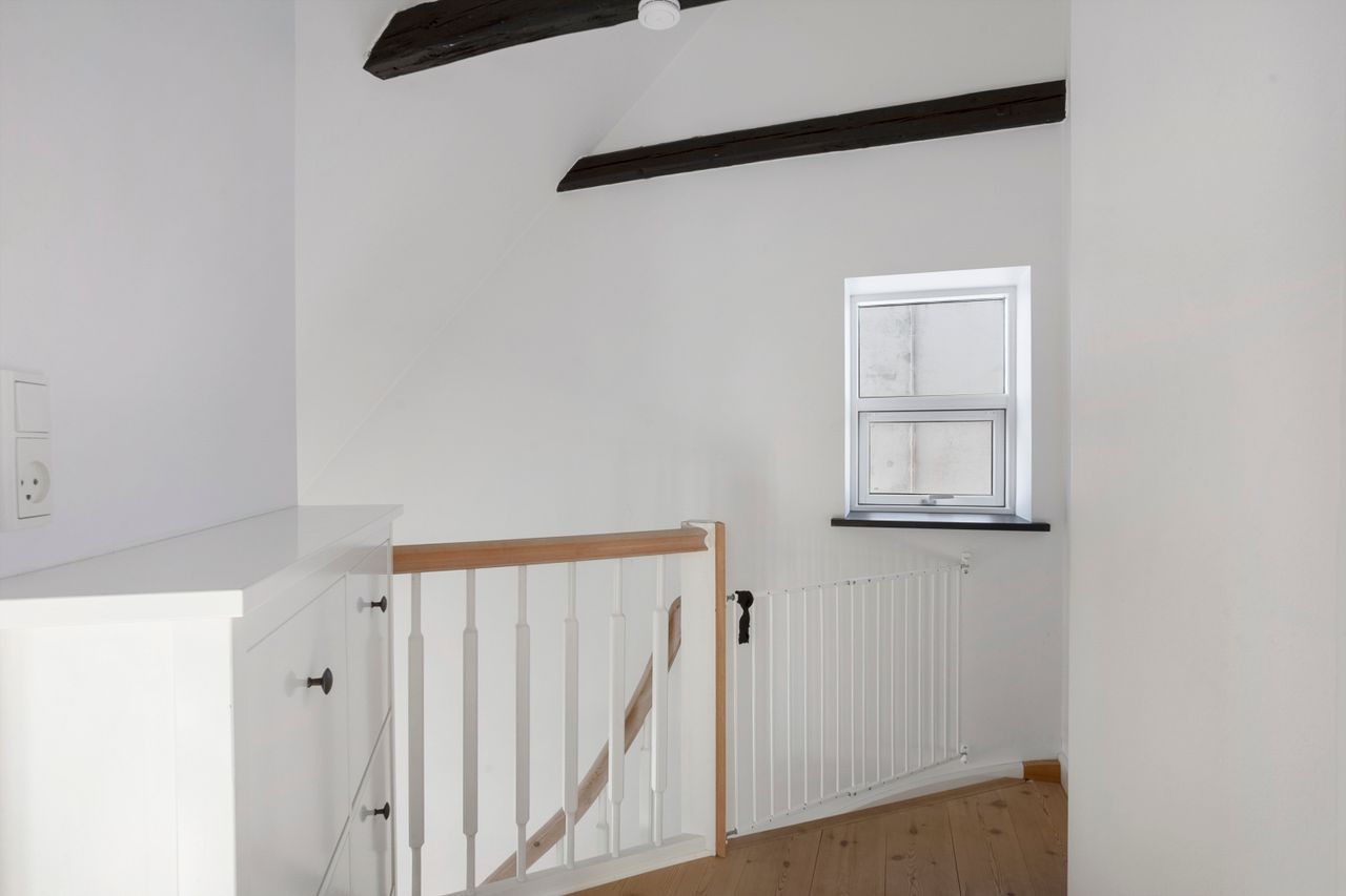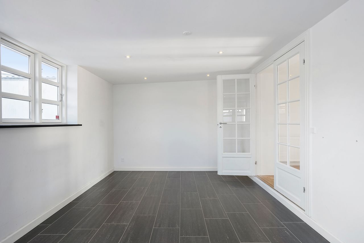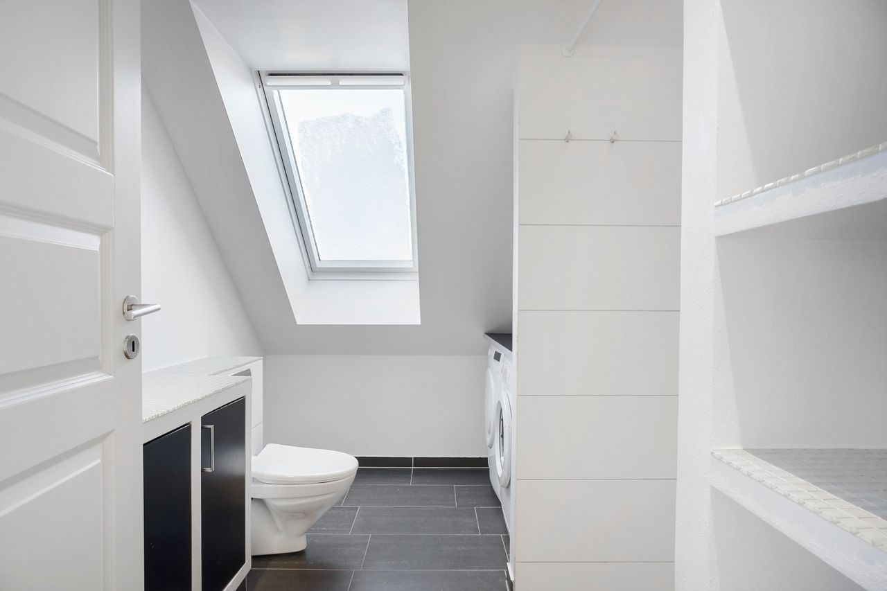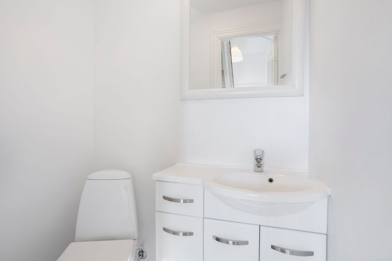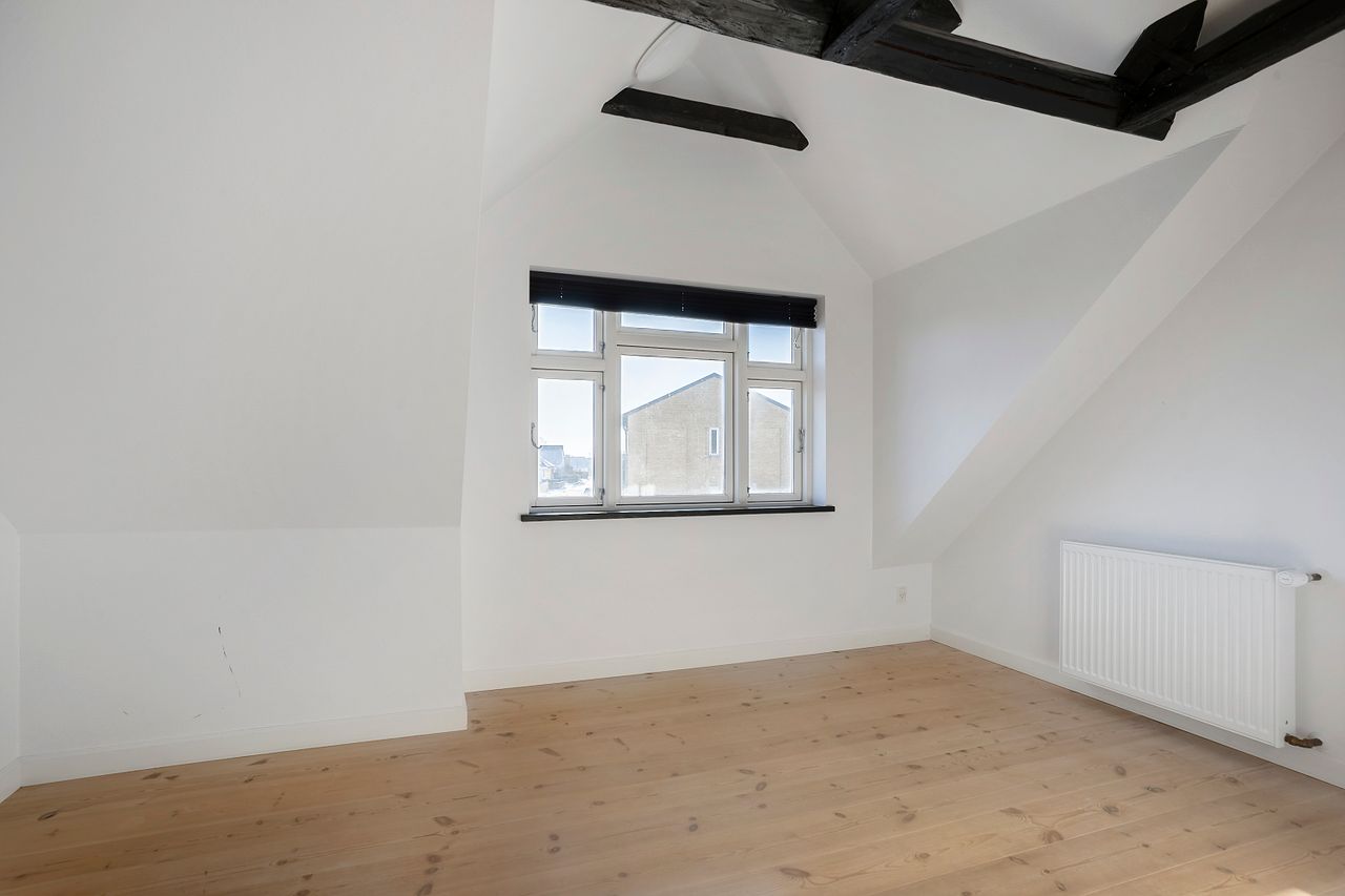 På 1. salen finder I et flot badeværelse med gulvvarme og rummelig bruseniche. Derudover rummer etagen et lyst soveværelse med god skabsplads samt et ekstra værelse, der oplagt kan indrettes som børneværelse, kontor eller hobbyrum – alt efter behov.