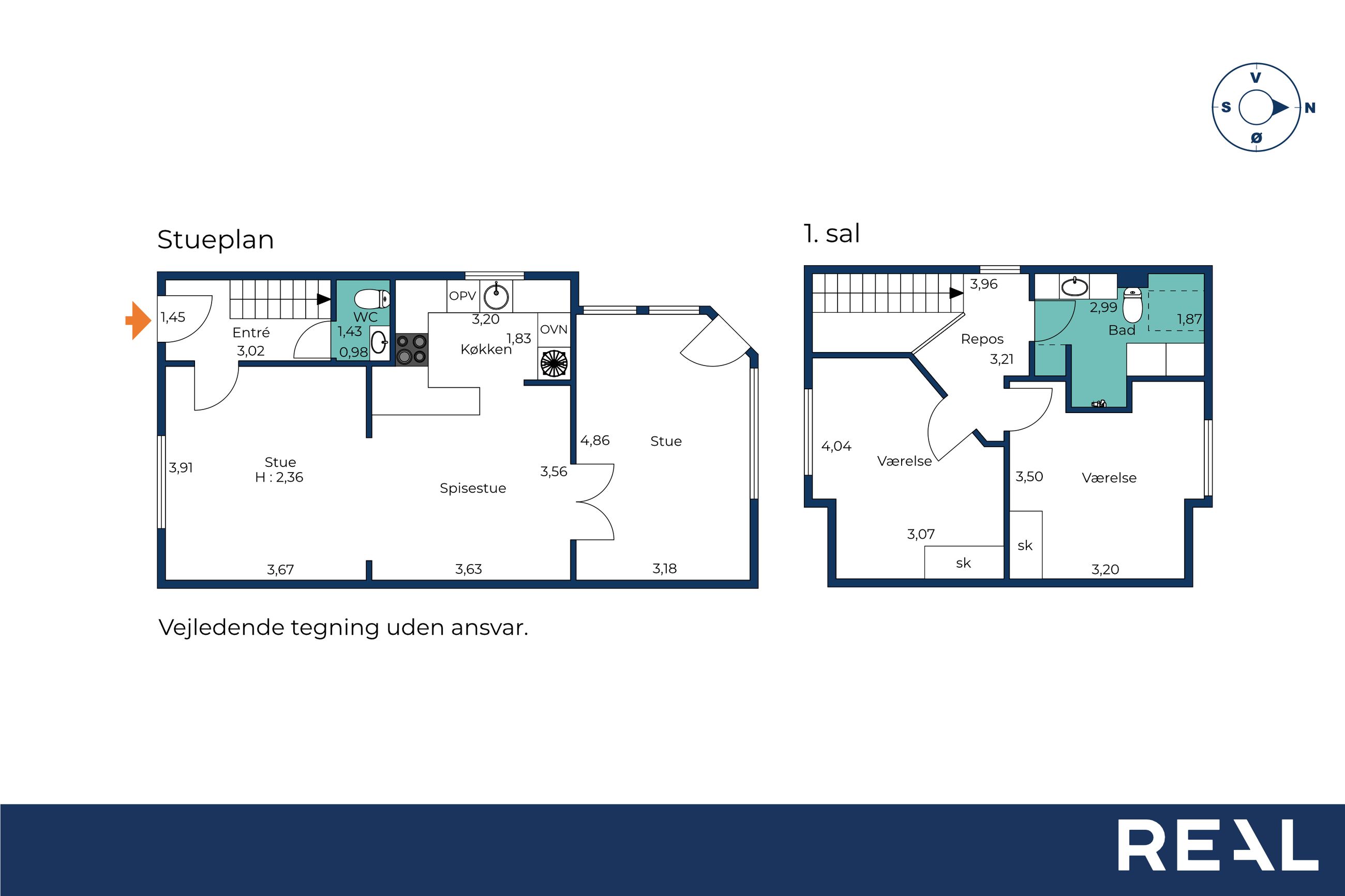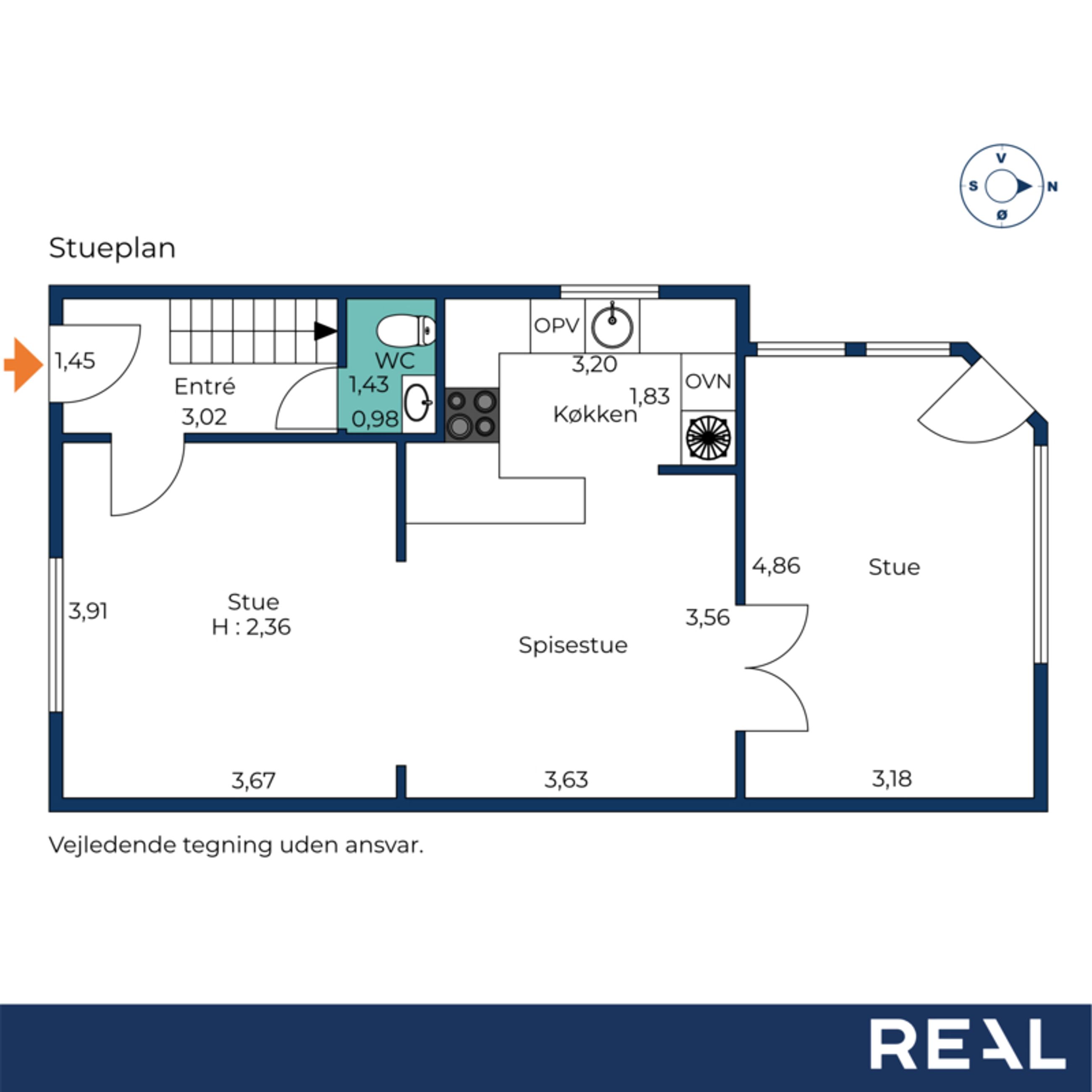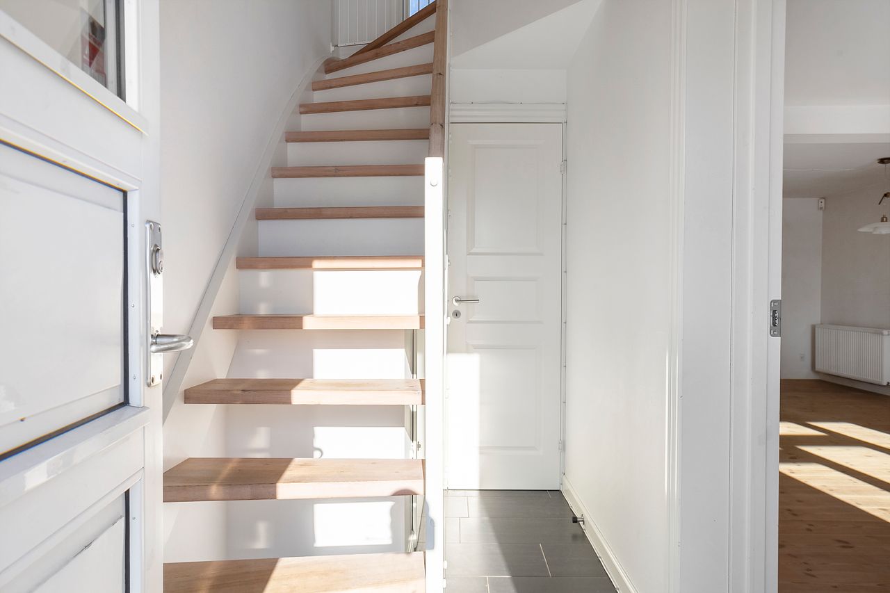 Boligen byder velkommen i entréen, hvor der er adgang til et pænt gæstetoilet. Herfra fordeler trappen sig til førstesalen, mens stueetagen åbner sig op med gode opholdsrum.