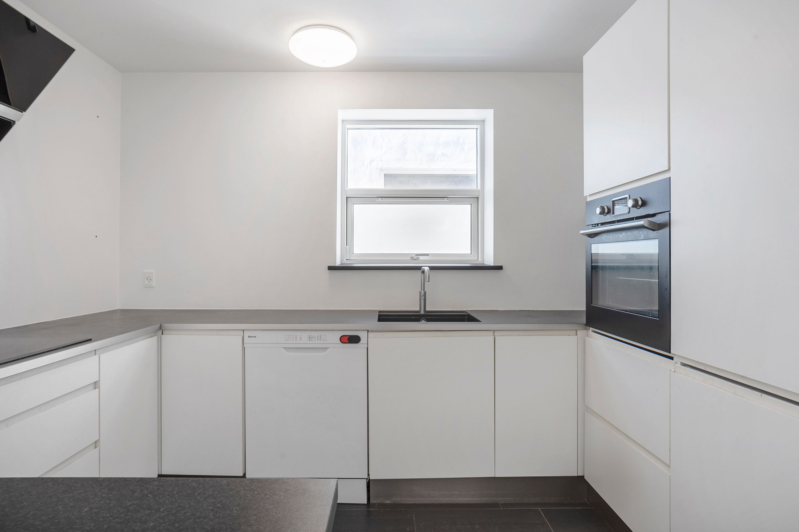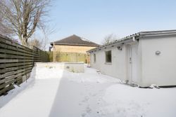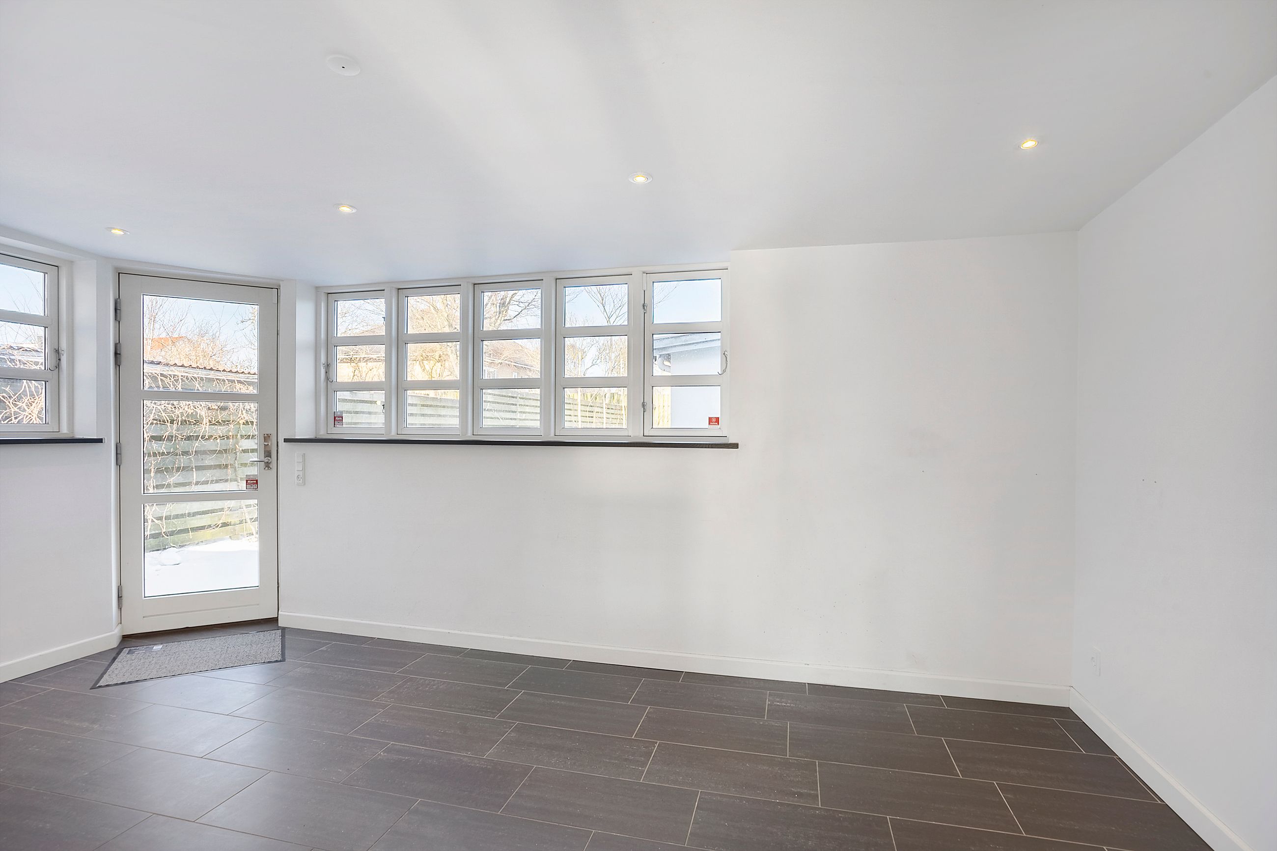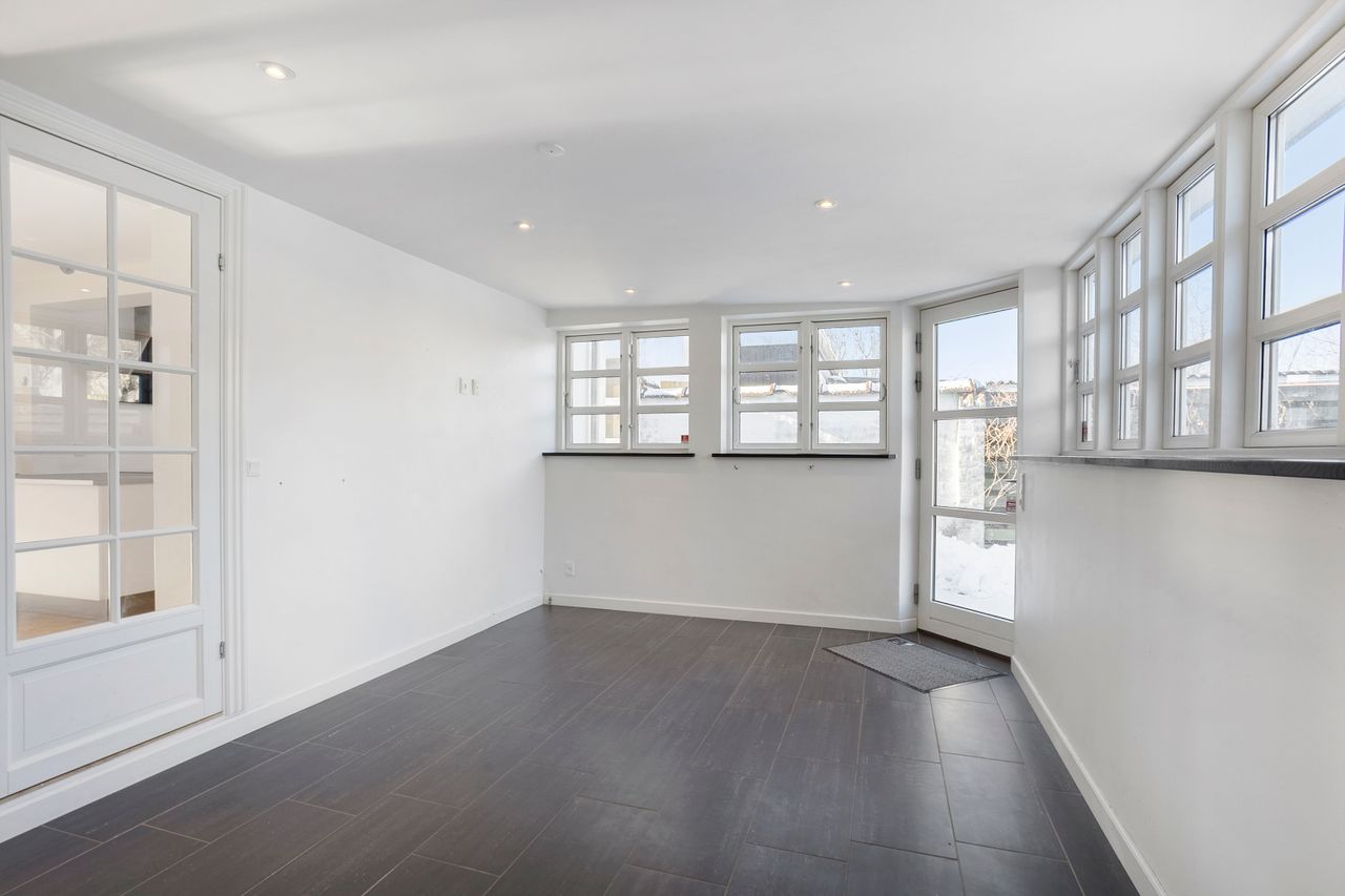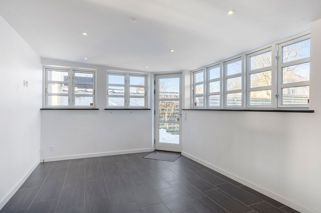 Udendørs venter en stor, flisebelagt gårdhave med terrassemiljø og minimal vedligeholdelse. Et par trin fører op til haven, som giver et hyggeligt og privat uderum – perfekt til både afslapning og samvær.