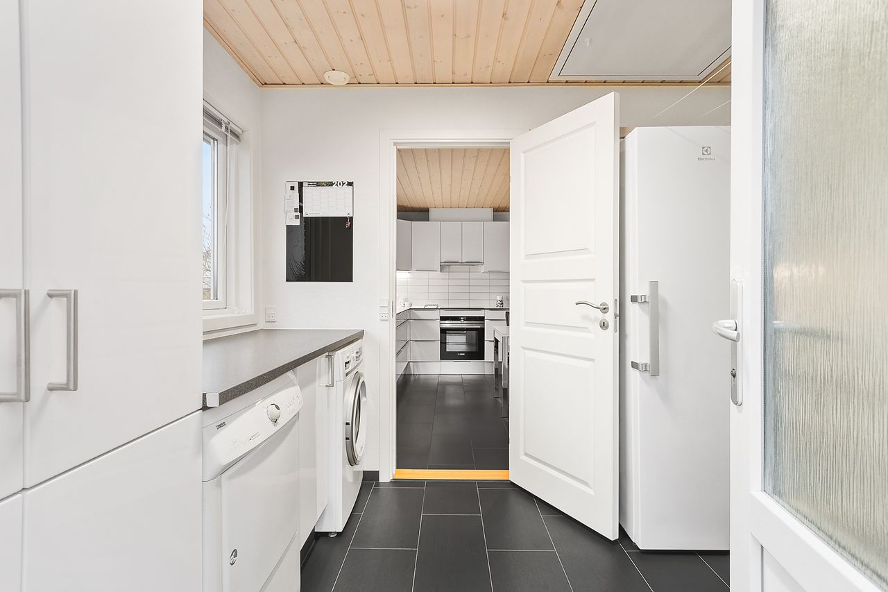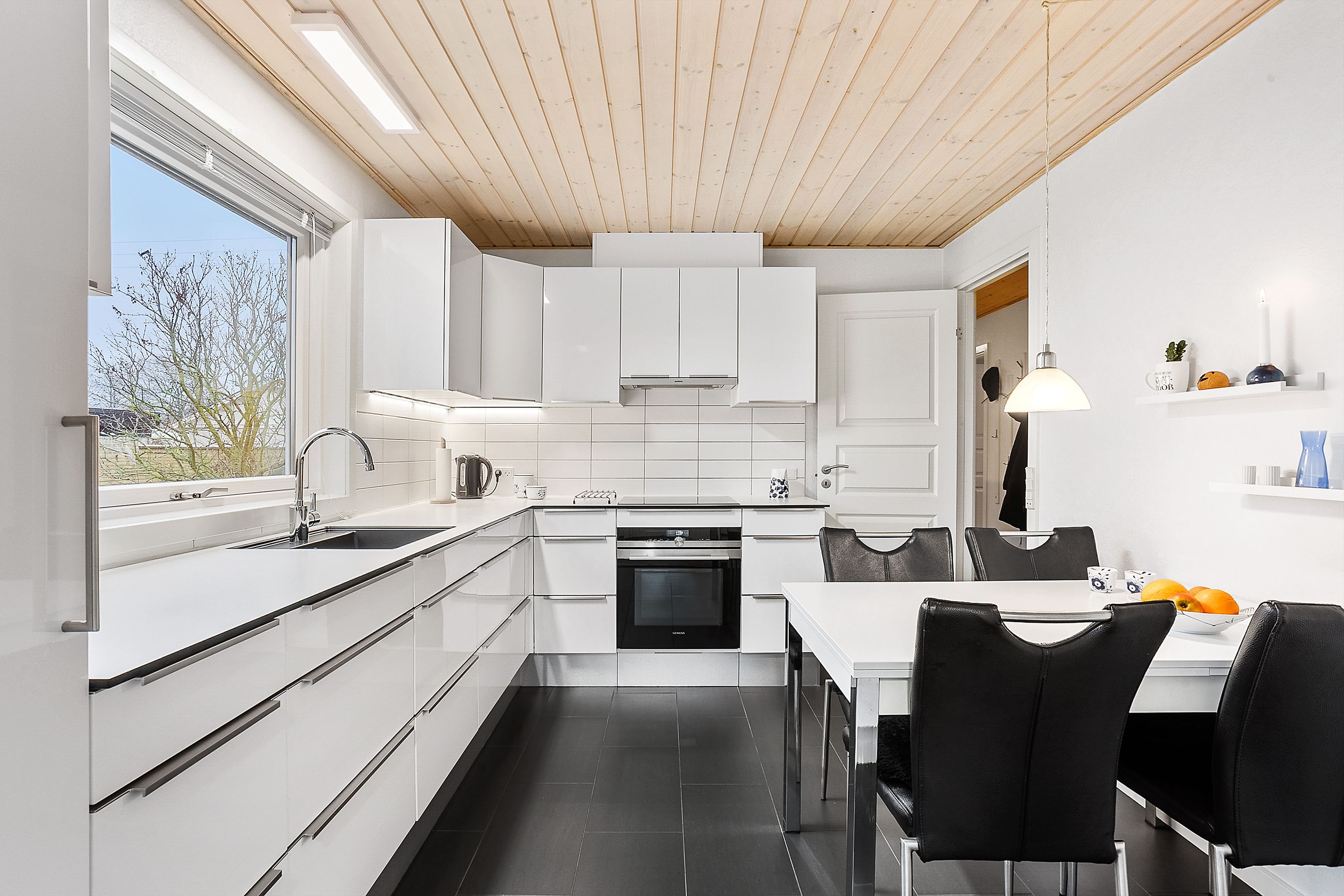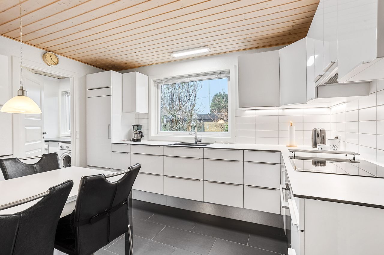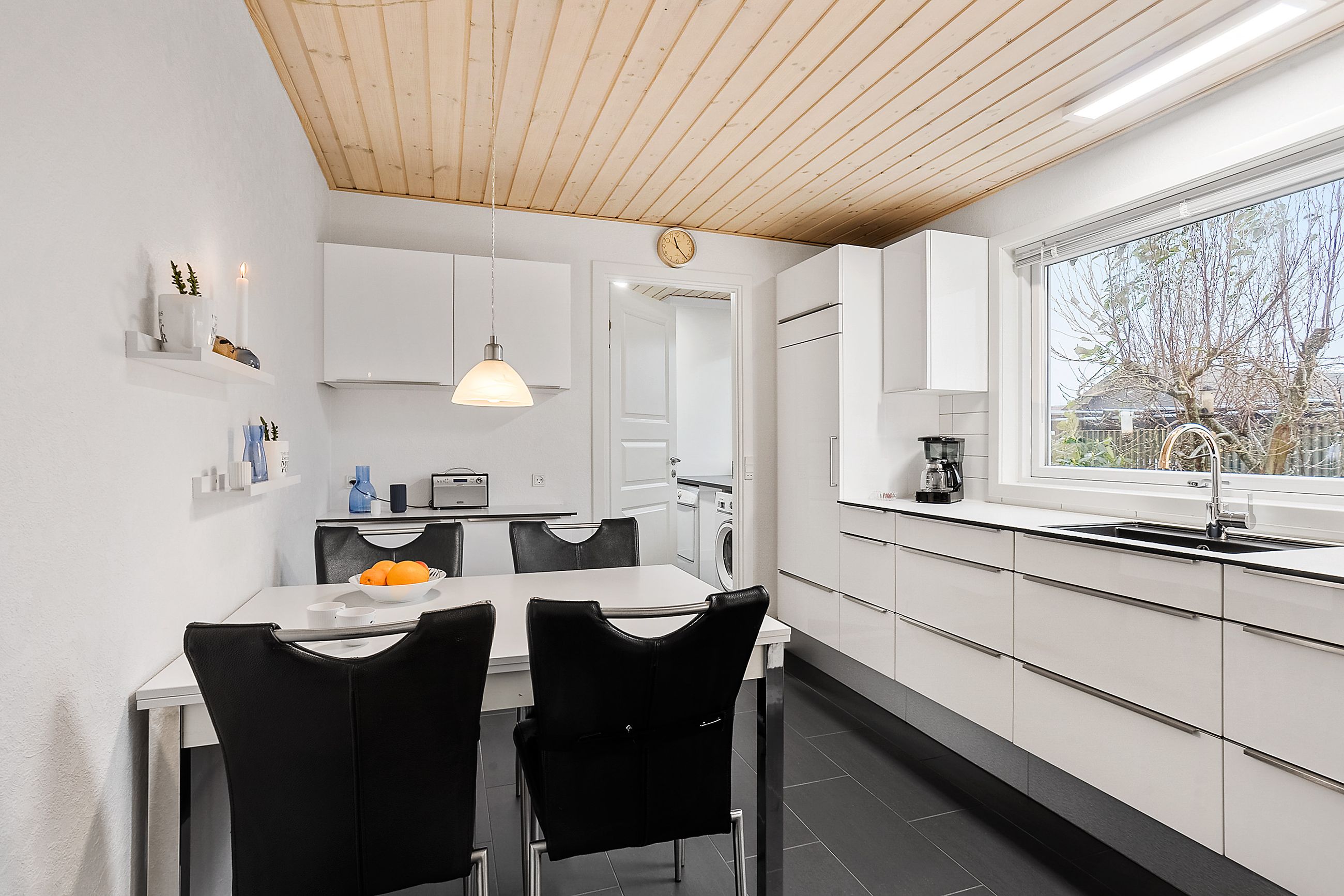 Køkkenet er et stilrent JKE-køkken fra 2015 med god skabsplads og moderne faciliteter, der gør hverdagen både praktisk og indbydende. Den store, lyse stue er husets samlingspunkt og har direkte udgang til en skøn terrasse, hvor du kan nyde solen og den velanlagte have.