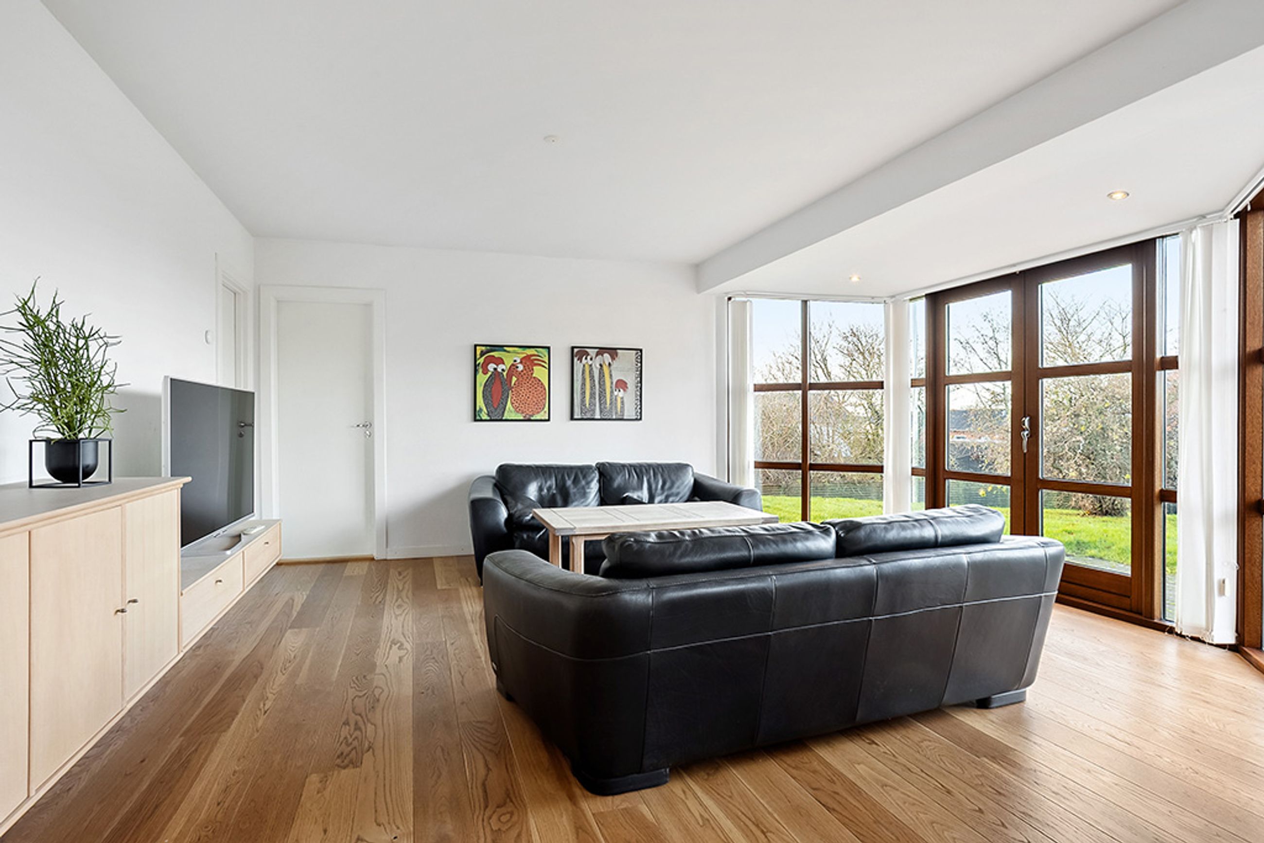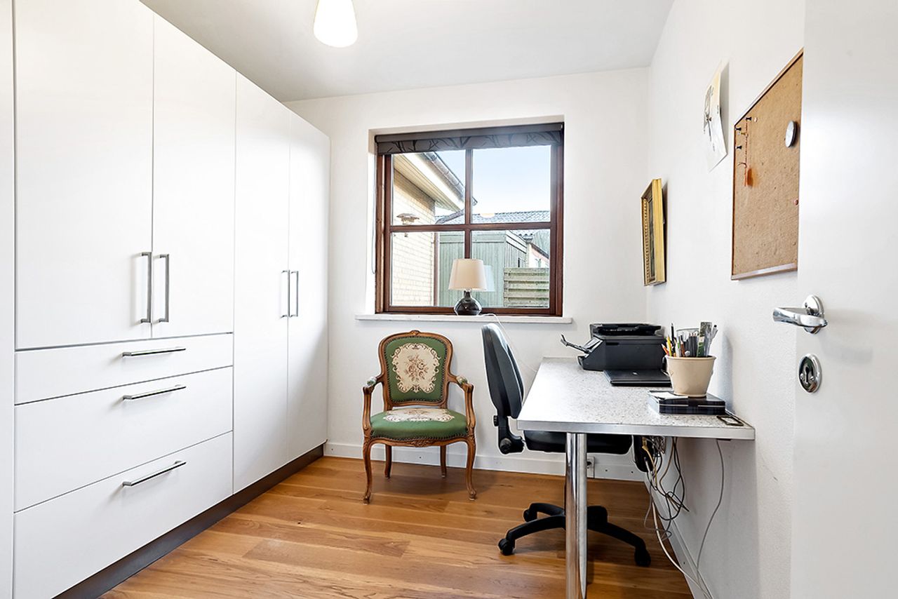 Fra stuen er der adgang til tre gode værelser, der ligger samlet og danner en naturlig børne- eller kontorafdeling. I forlængelse af stuen ligger den indbydende tv-stue hvor der i også er kommet en karnap på så der kommer et godt lys ind. Tv-stuen leder videre til forældreafdelingen, der ligger ugeneret for enden af huset og tilbyder et rummeligt soveværelse med eget badeværelse. Dette badeværelse er elegant udført og rummer en stor bruseniche, hvilket giver afdelingen et eksklusivt og privat præg.