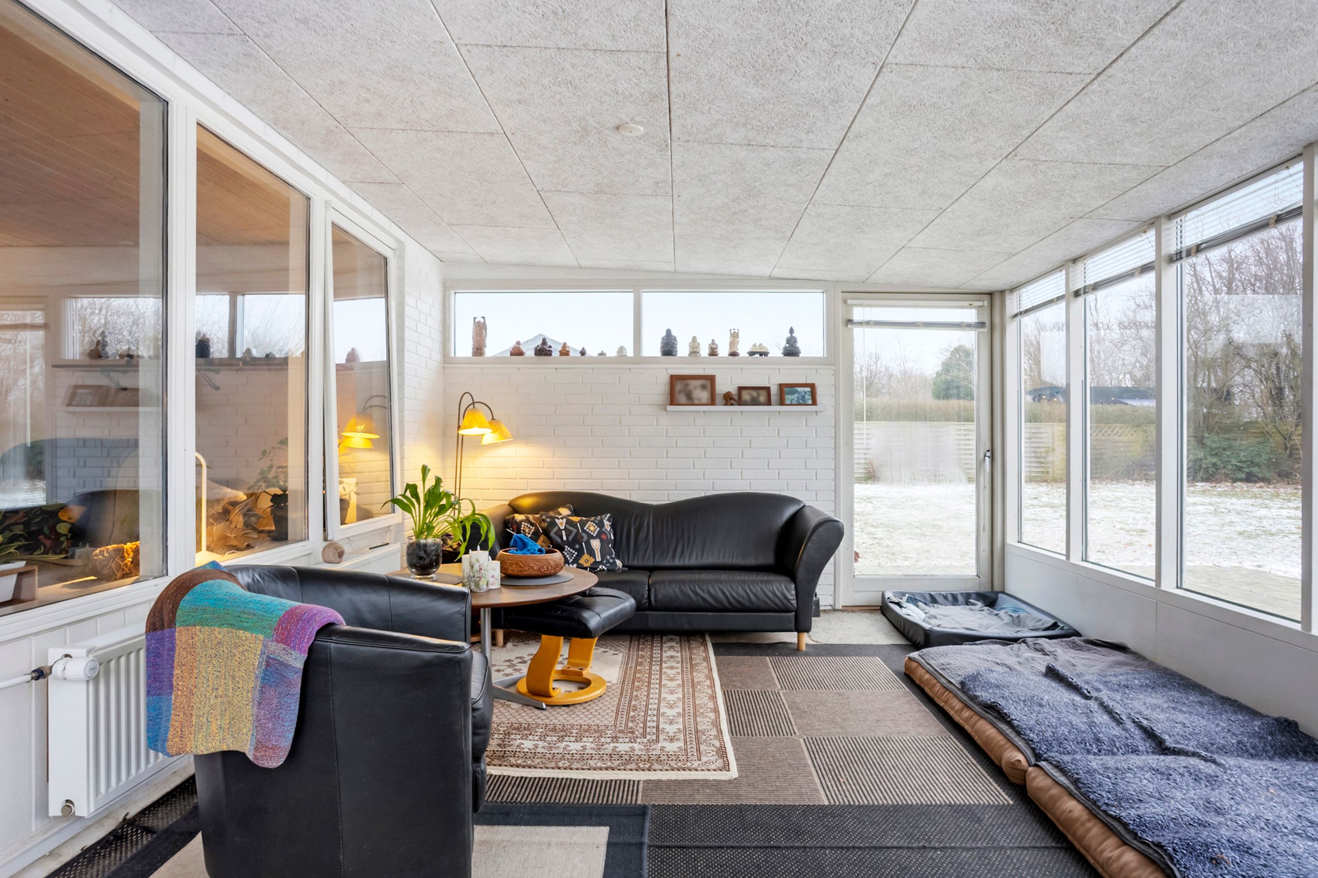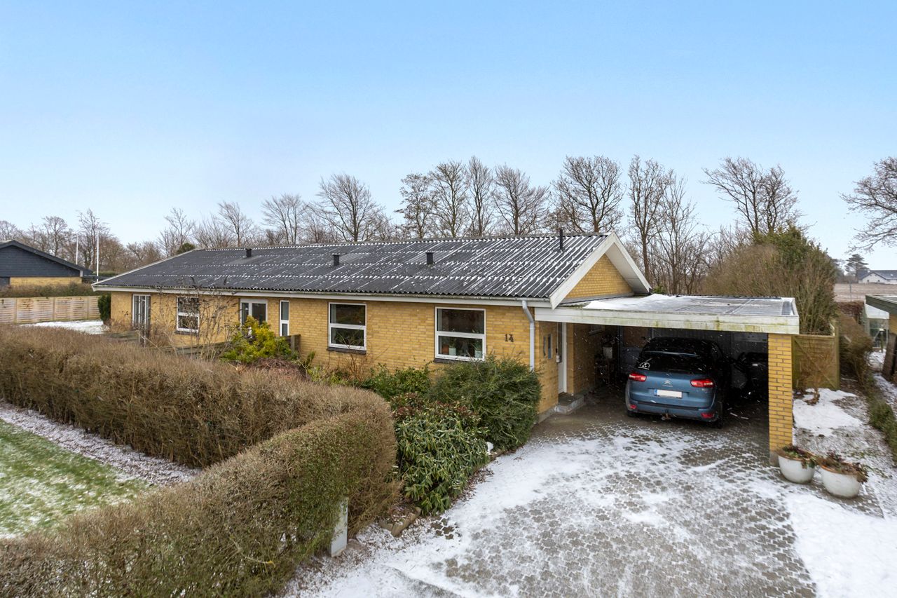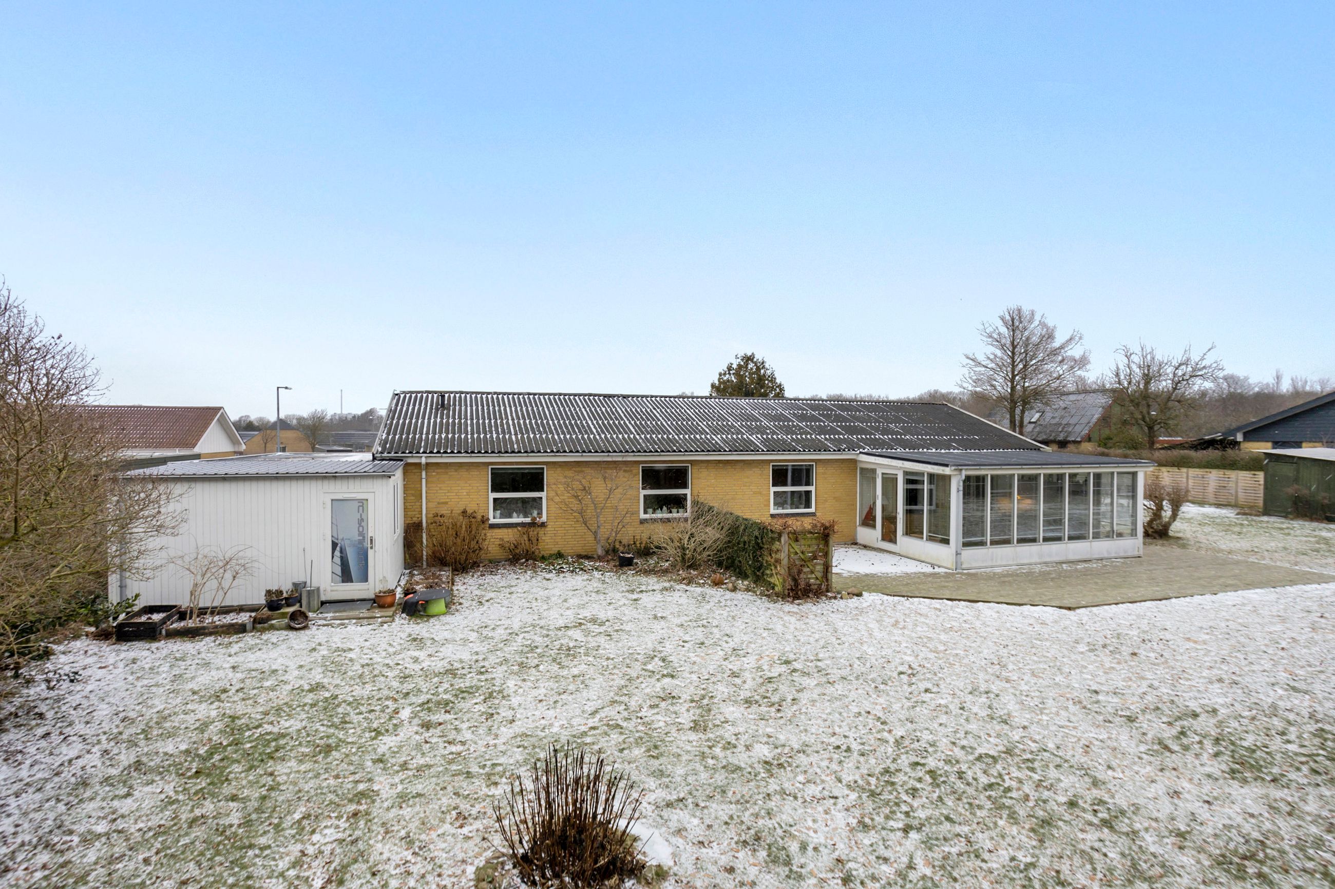 Huset er opført i 1976 i klassiske gule mursten og fremstår velindrettet med en funktionel planløsning. Man bydes velkommen i entré/bryggers, som fungerer som fordelingsgang til boligens badeværelse, soveværelse samt hele tre gode og rummelige værelser. Derudover rummer boligen et gæstetoilet, et køkken samt en hyggelig vinkelstue med god plads til både spise- og opholdsafdeling. Fra stuen er der udgang til en udestue, som forlænger sommeren og skaber en dejlig overgang mellem hus og have.