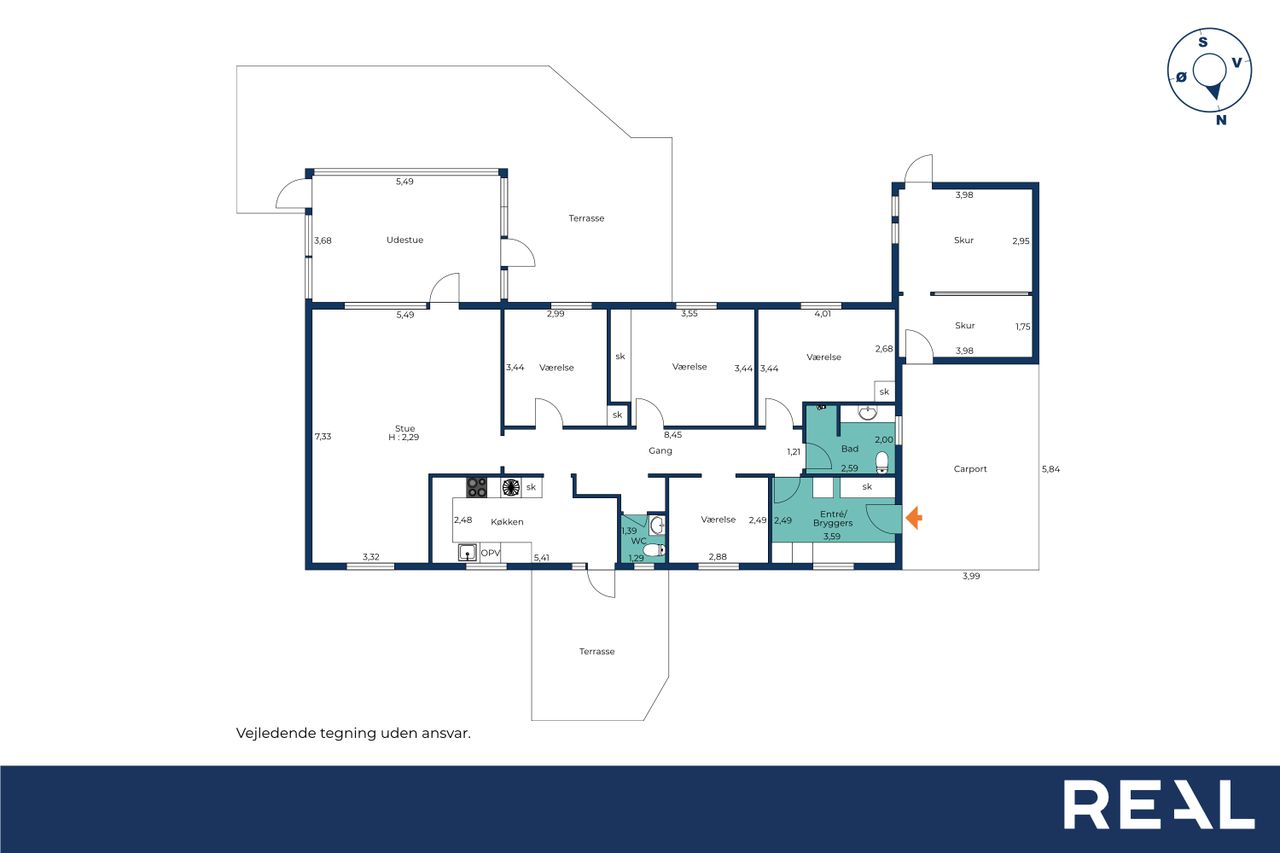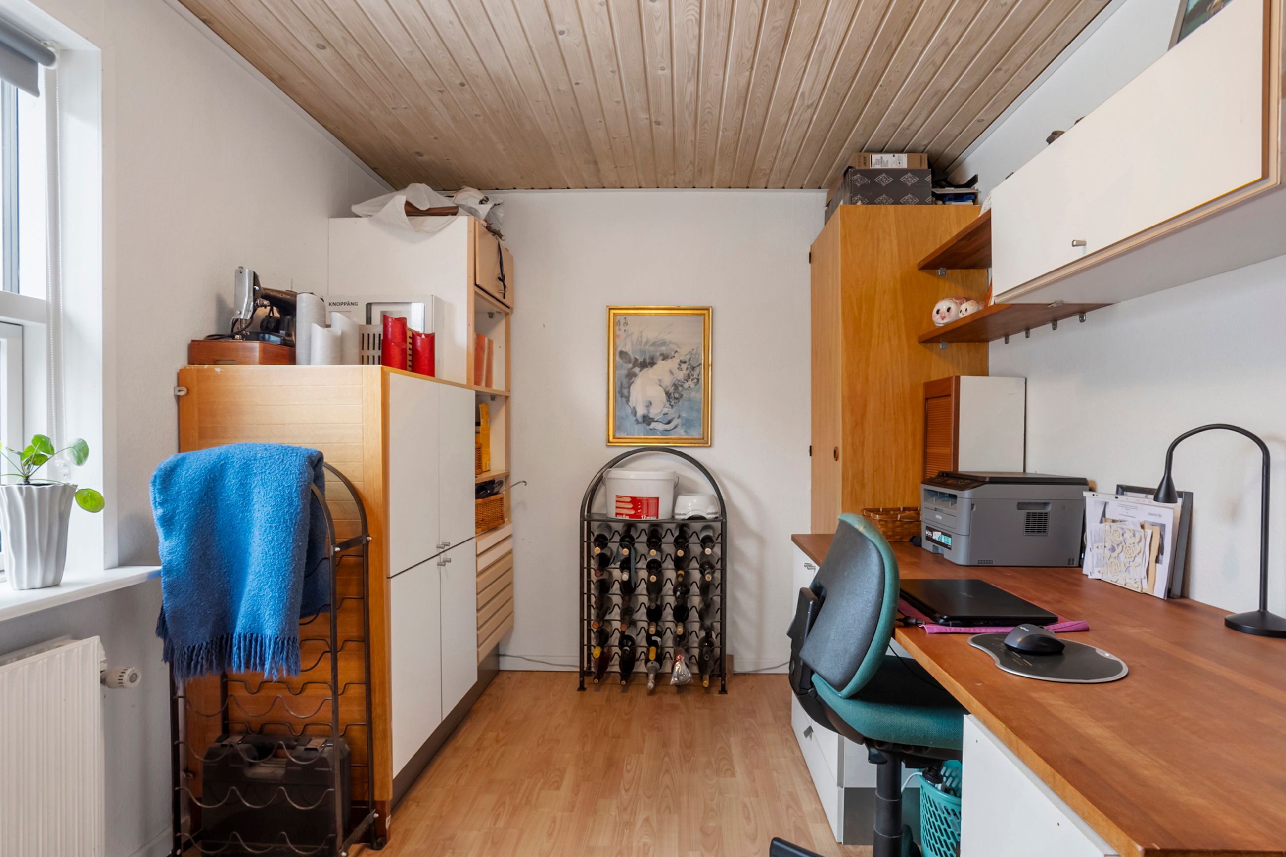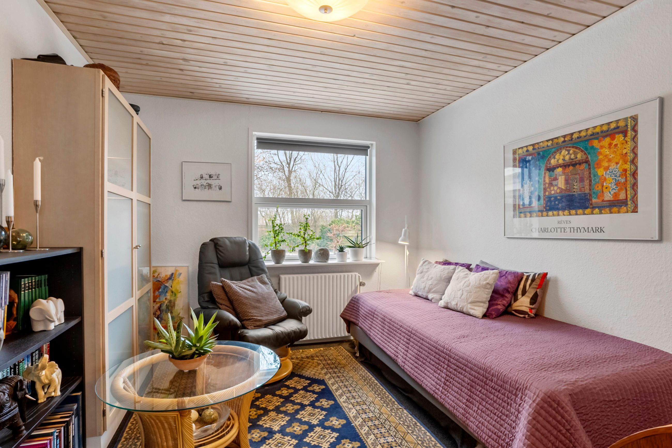 Huset er opført i 1976 i klassiske gule mursten og fremstår velindrettet med en funktionel planløsning. Man bydes velkommen i entré/bryggers, som fungerer som fordelingsgang til boligens badeværelse, soveværelse samt hele tre gode og rummelige værelser. Derudover rummer boligen et gæstetoilet, et køkken samt en hyggelig vinkelstue med god plads til både spise- og opholdsafdeling. Fra stuen er der udgang til en udestue, som forlænger sommeren og skaber en dejlig overgang mellem hus og have.