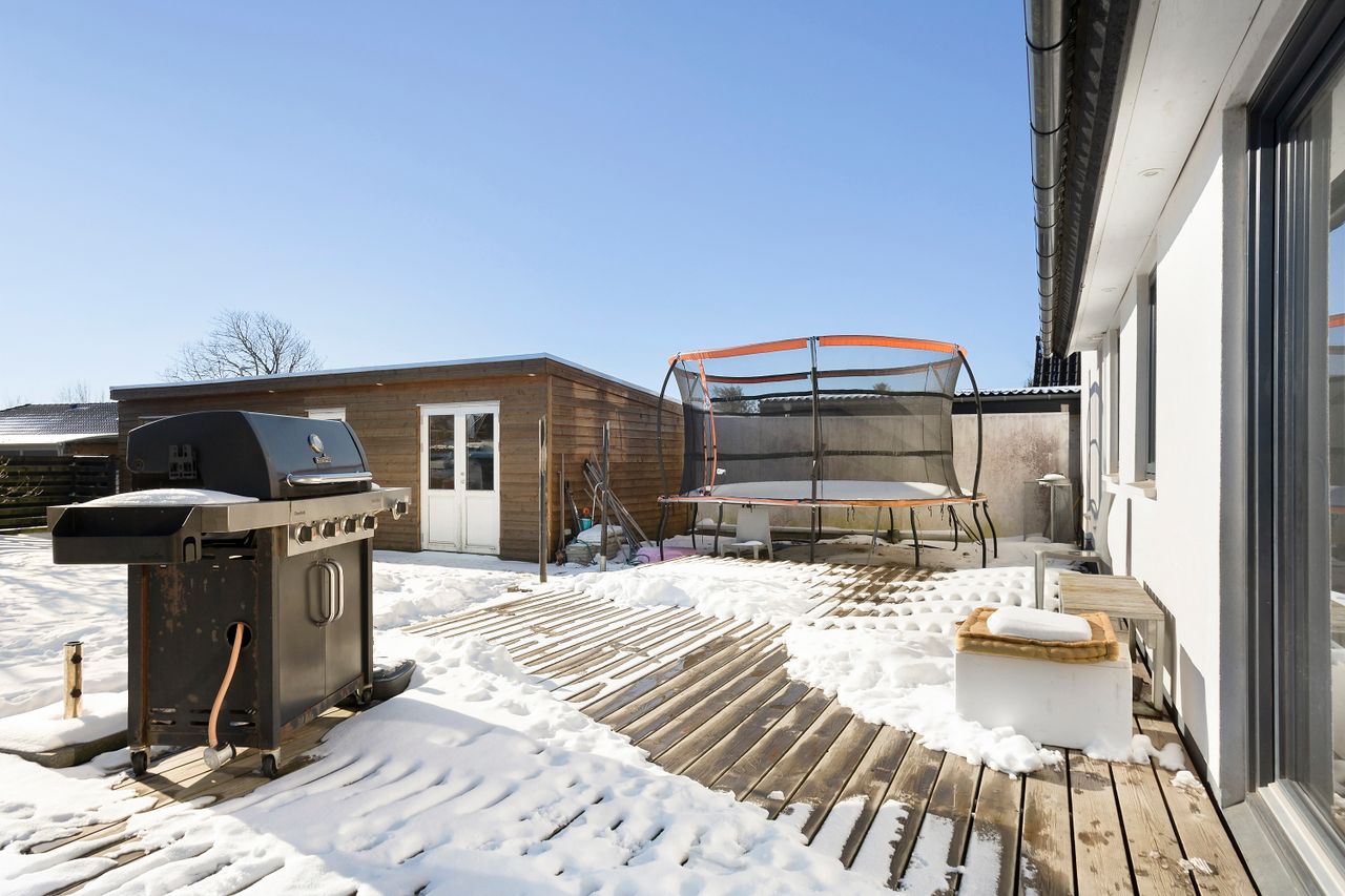 Haven er skøn og ugeneret med en dejlig, stor terrasse, hvor morgenkaffen kan nydes direkte fra køkkenet. Her er der plads til både afslapning og hyggelige grillaftener. Til ejendommen hører desuden en god garage med el-port som er opført i 2020 samt et praktisk skur, som giver ekstra opbevaringsplads. Ejendommen ligger på en 557 m2 stor grund, som giver en overskuelig og nem have med god plads til udeliv.