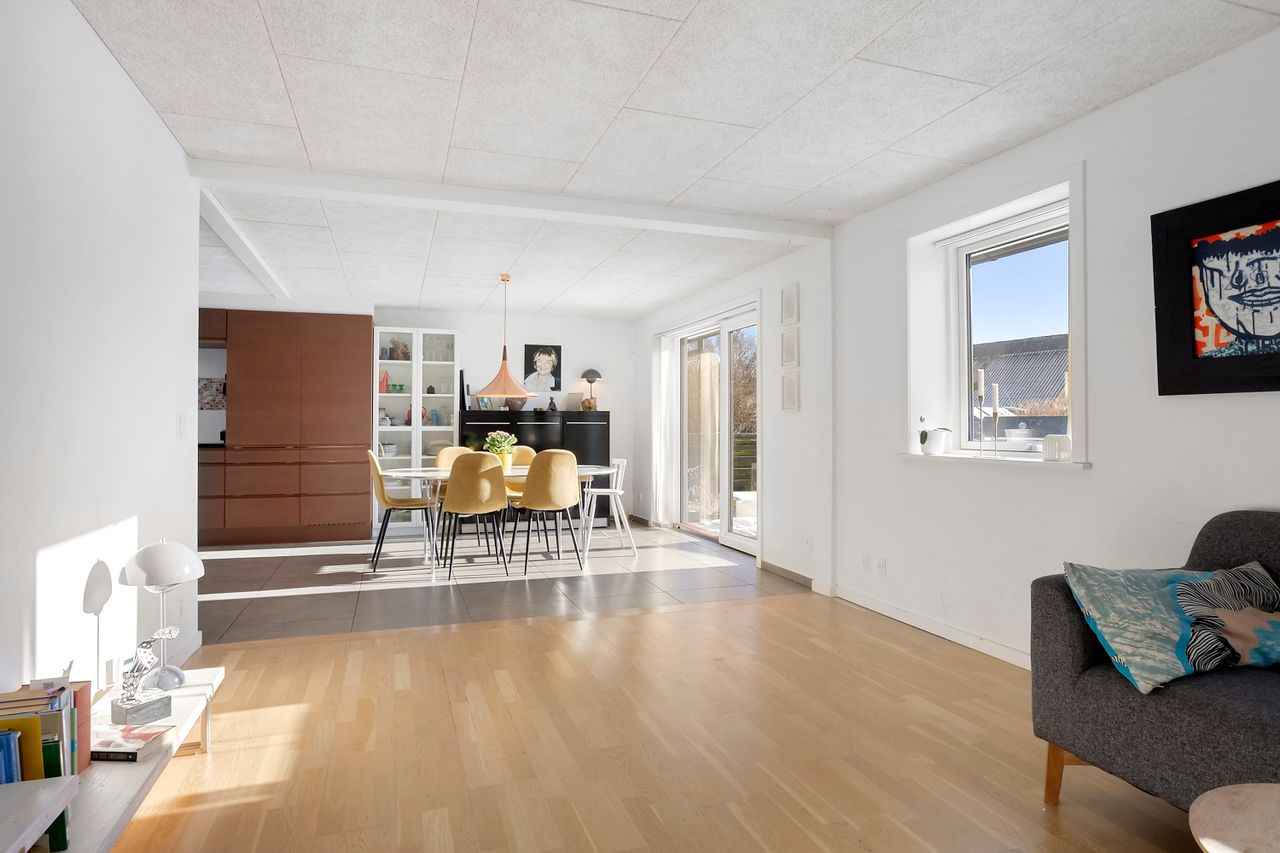 Boligen rummer i alt 193 veludnyttede kvadratmeter fordelt på 107 m2 i stueplan og 86 m2 på overetagen. Huset fremstår i flot stand med energimærke B og vinduer i træ/alu fra 2013, hvilket bidrager til både komfort og energieffektivitet. I hele stueetagen er der desuden gulvvarme, som sikrer en behagelig og jævn varme året rundt. Det giver både høj komfort i hverdagen og en fleksibel indretning uden synlige radiatorer.