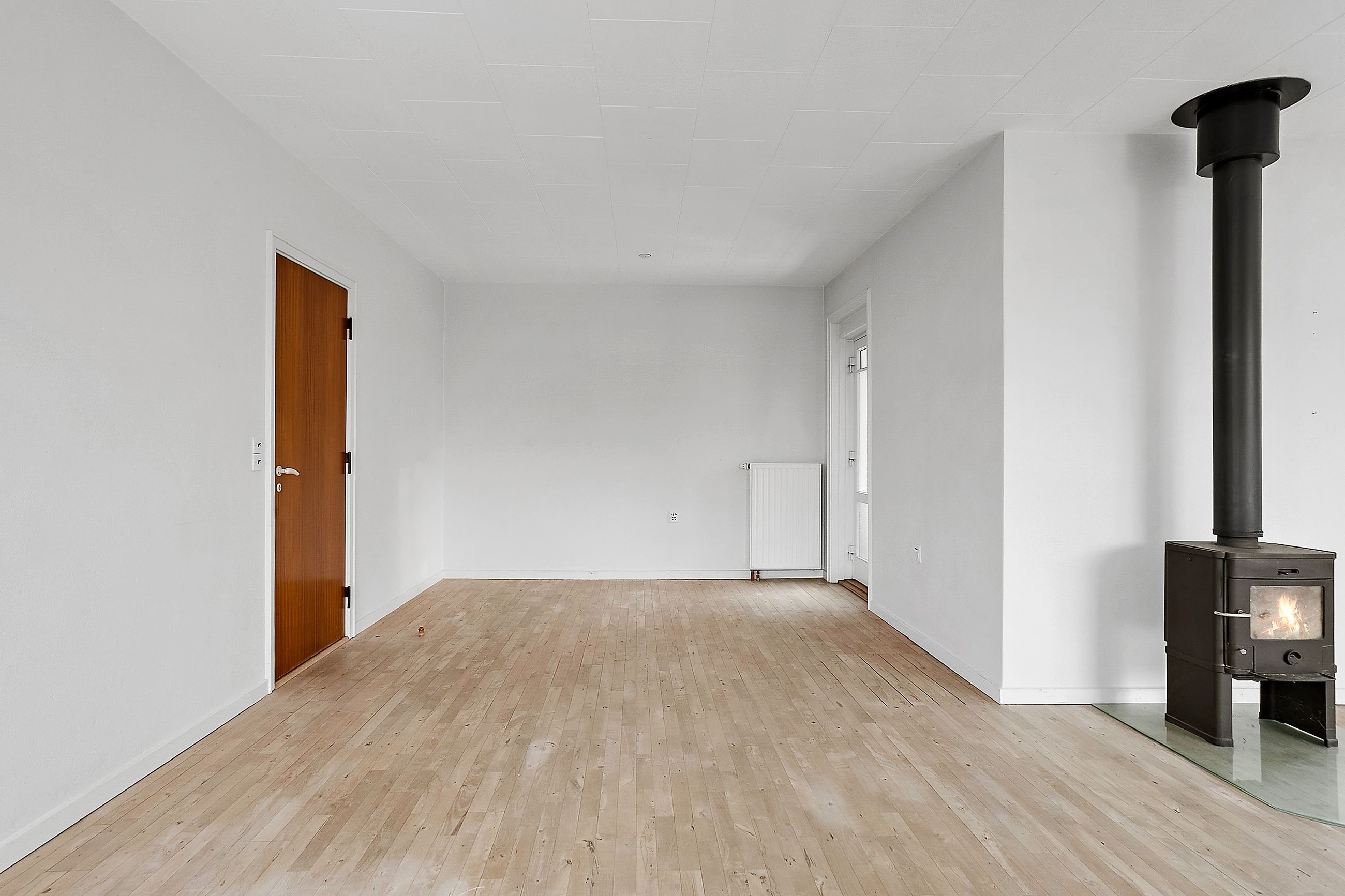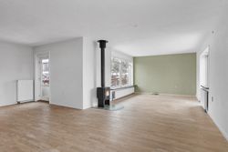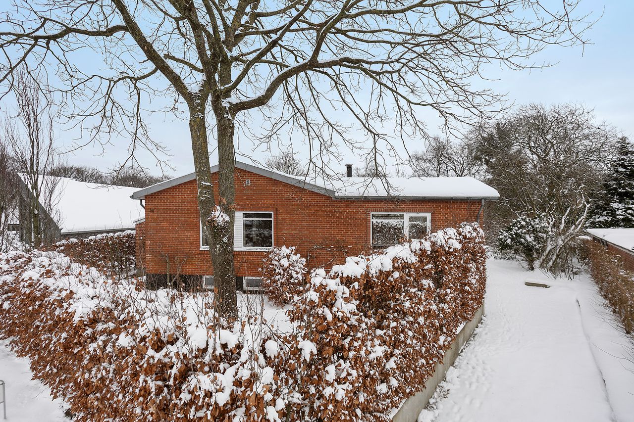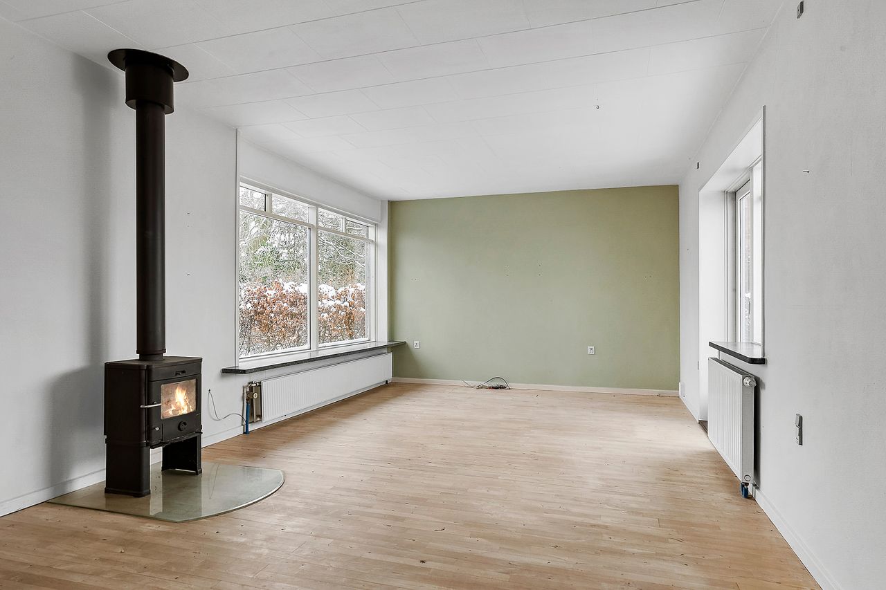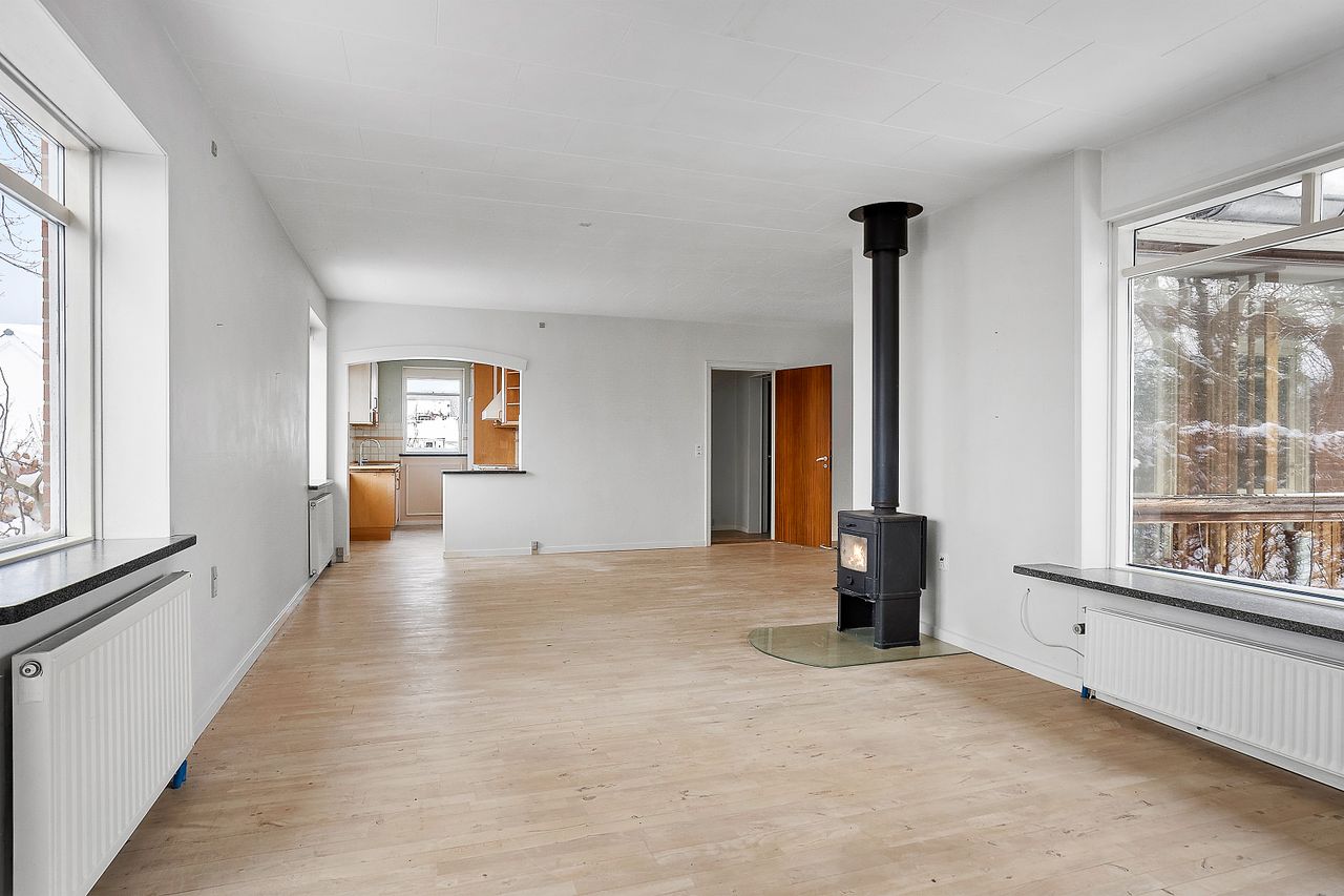 Boligen rummer 100 m2 boligareal samt en kælder på 62 m2, som tilsammen giver masser af plads. Via entréen er der adgang til både stueplan og kælder. På stueplan findes et køkken, som ligger i naturlig forbindelse med en rummelig vinkelstue. Stuen er kendetegnet ved et behageligt lysindfald fra de store vinduespartier samt brændeovn, der bidrager til en hyggelig stemning.
