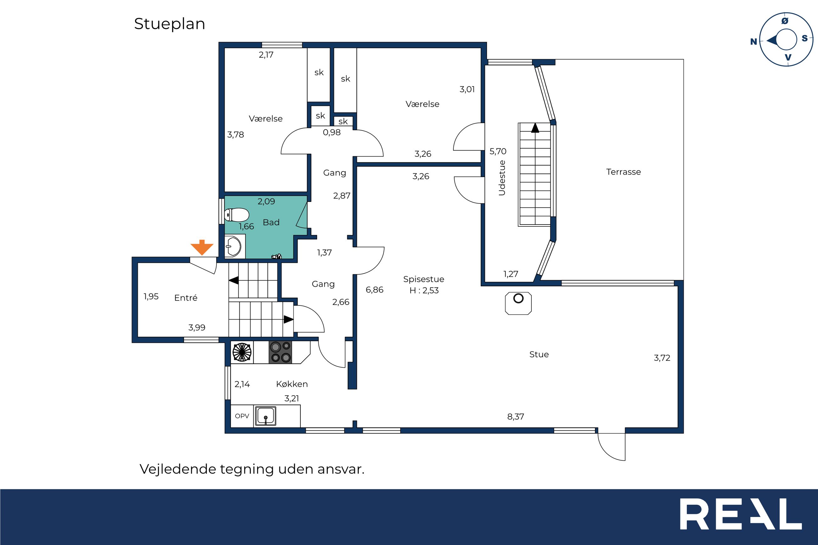 Stueplanet indeholder desuden en fordelingsgang med adgang til badeværelse med gulvvarme samt to gode værelser, der kan anvendes til eksempelvis soveværelse, børneværelse eller hjemmekontor.