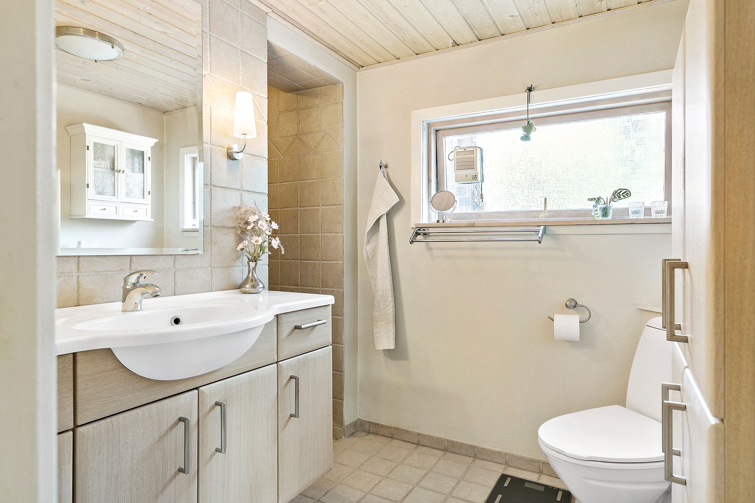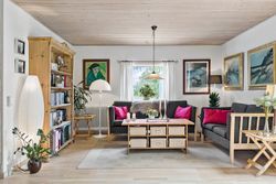 Huset har ligeledes renoveret badeværelse med gulvvarme og stor bruseniche. Fra den hyggelige stuen