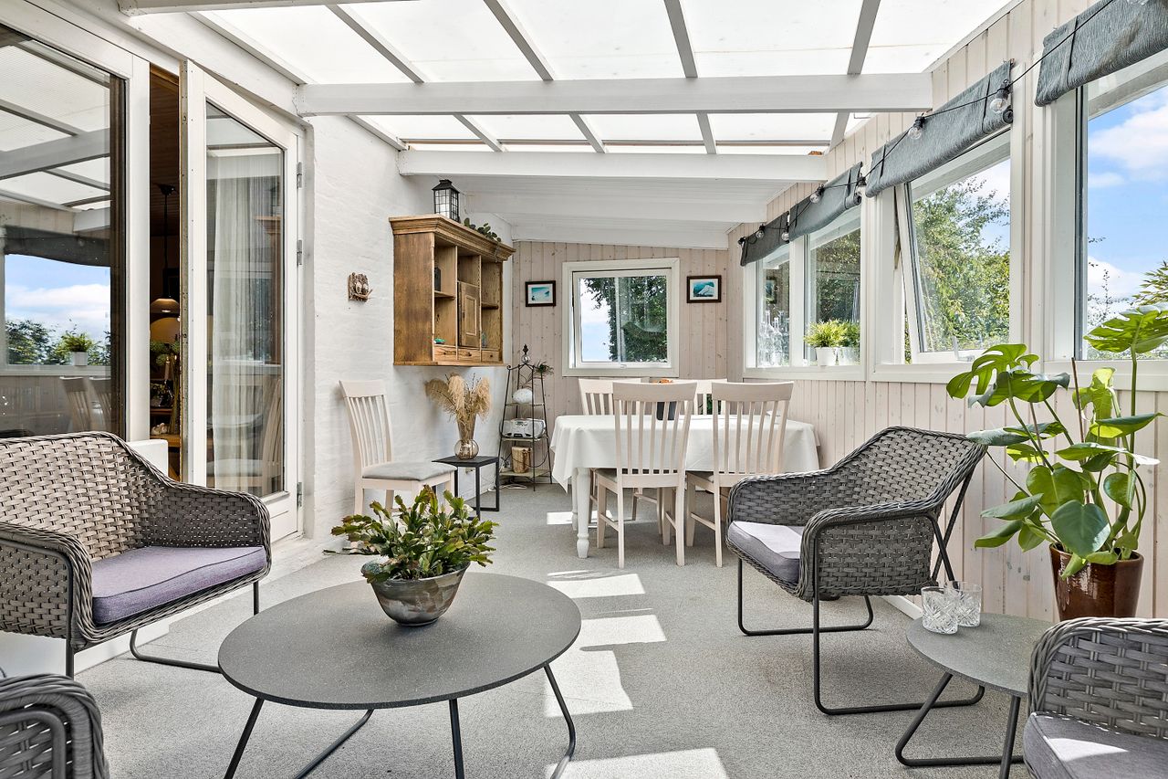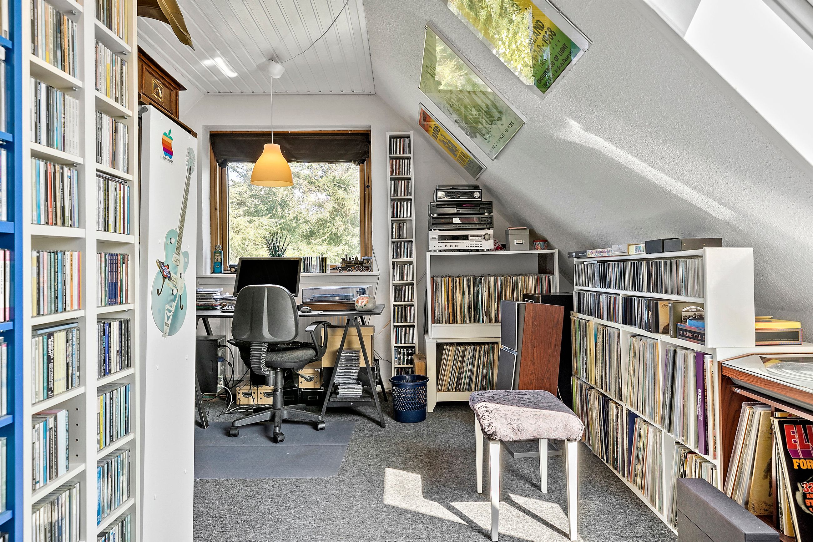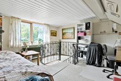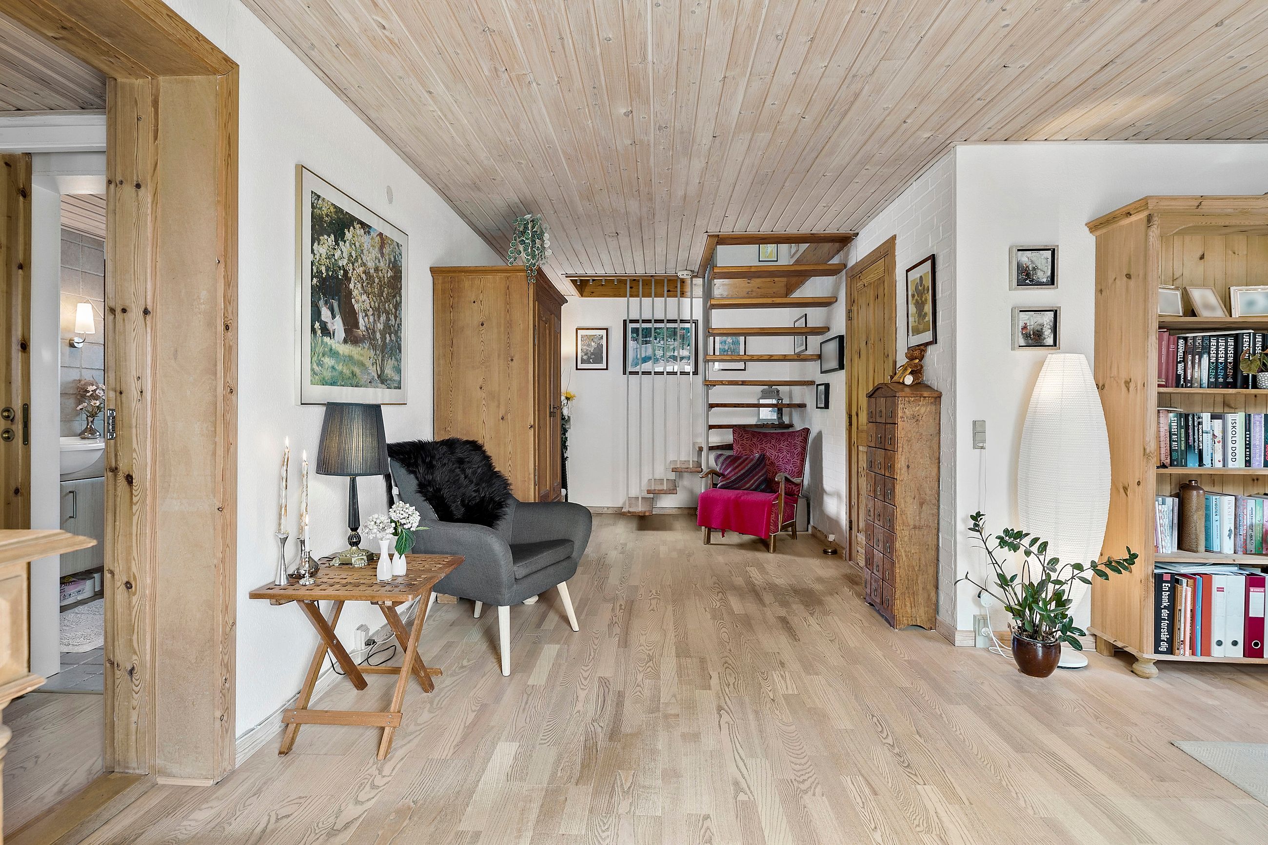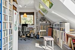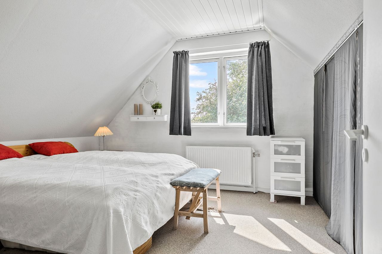 er der adgang til 1. sal med 2 værelser og repos, samt en stor lys udestue med god udsigt over naturen.