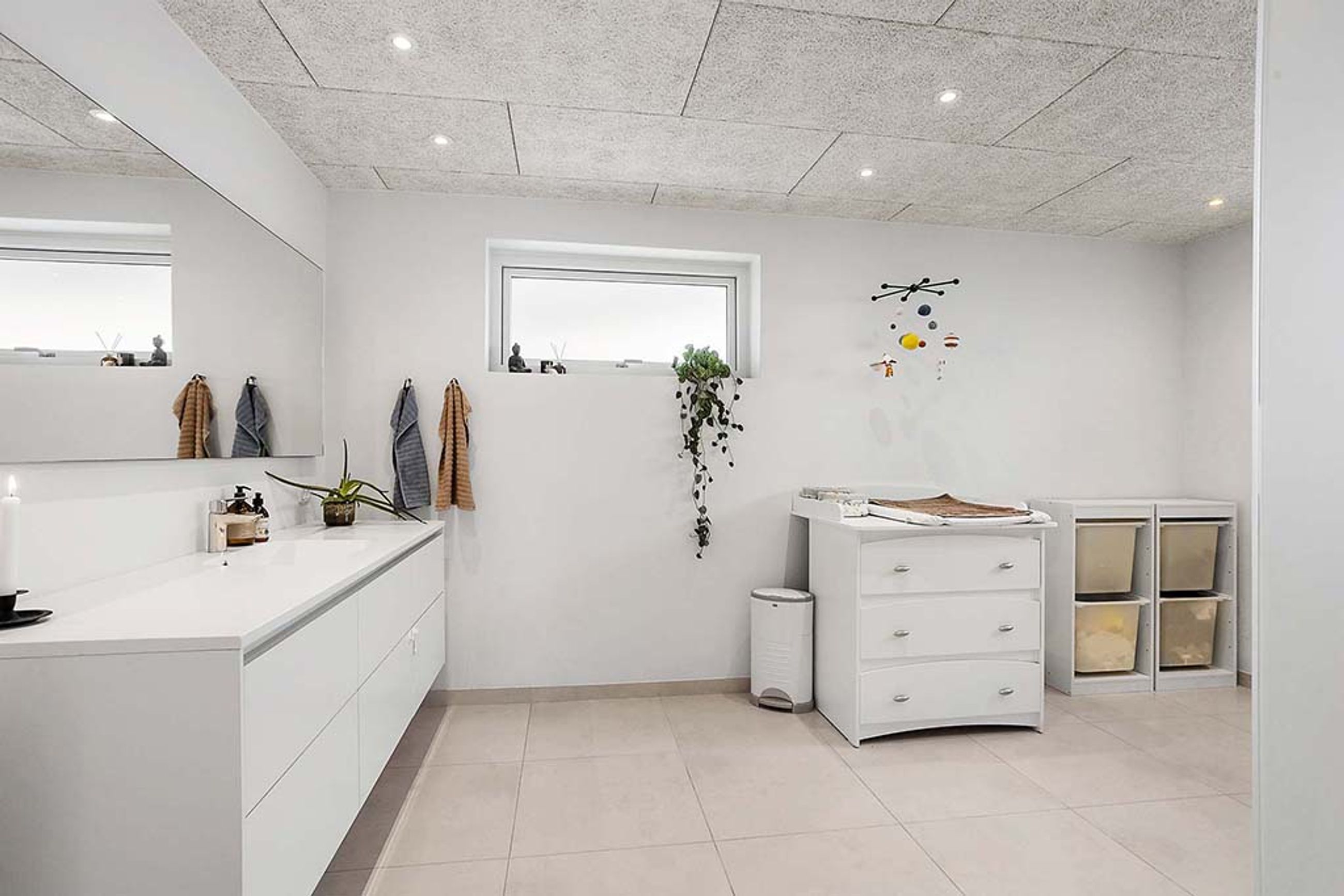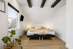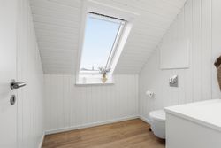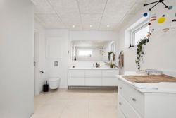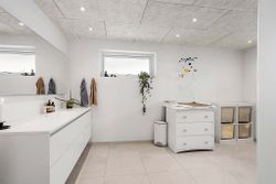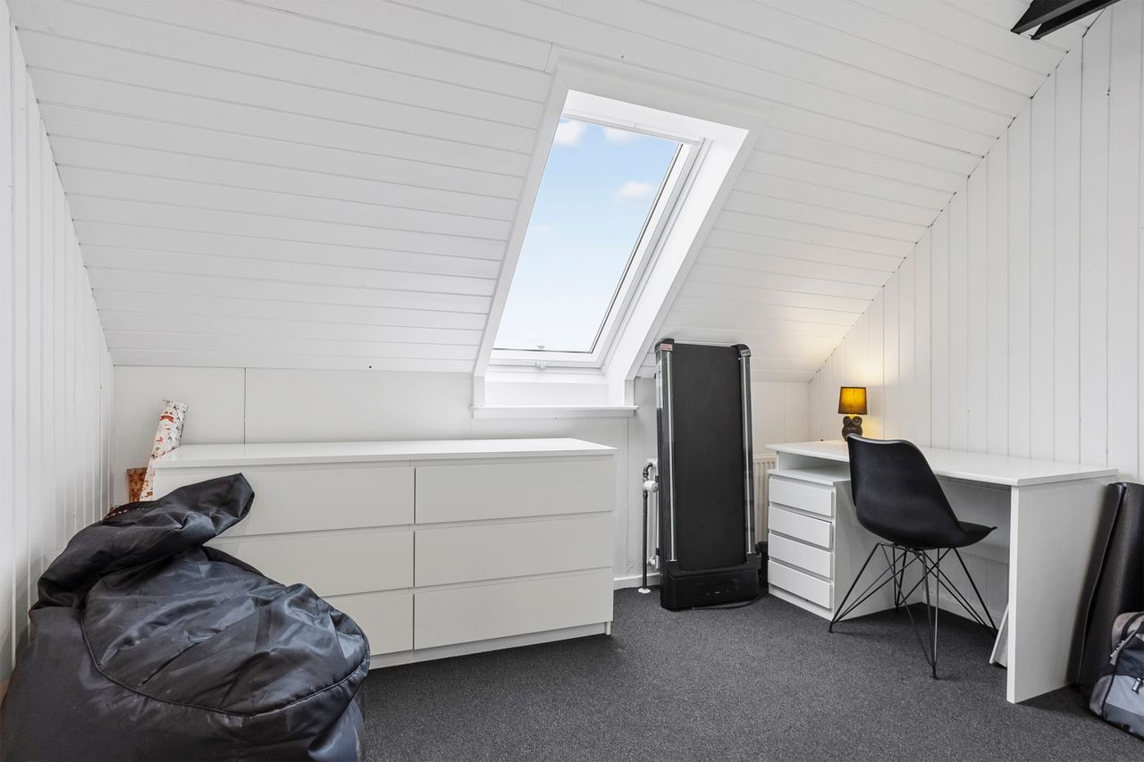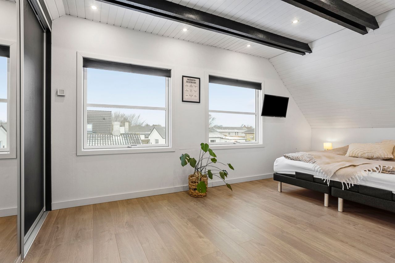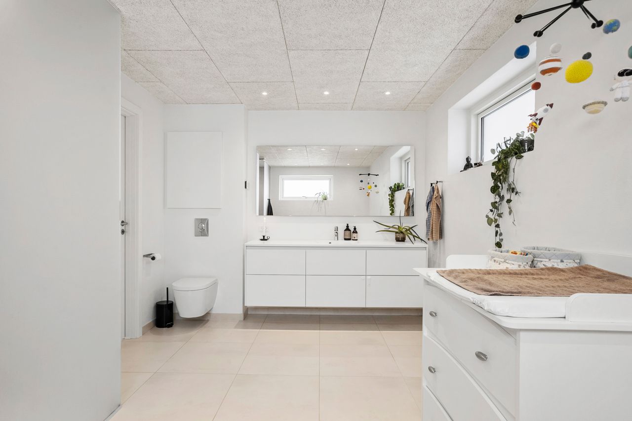 Boligen rummer fem værelser, alle placeret på førstesalen. To af værelserne ligger samlet og giver oplagte muligheder for en separat forældreafdeling med soveværelse og walk-in-closet, børneværelse eller hjemmekontor. Derudover byder huset på to lækre badeværelser – heraf et i stueplan med dobbeltbruseniche og klargjort til badekar. Der er gulvvarme i hele underetagen samt på overetagen, hvor der ikke er gulvtæpper, hvilket sikrer en behagelig komfort året rundt.