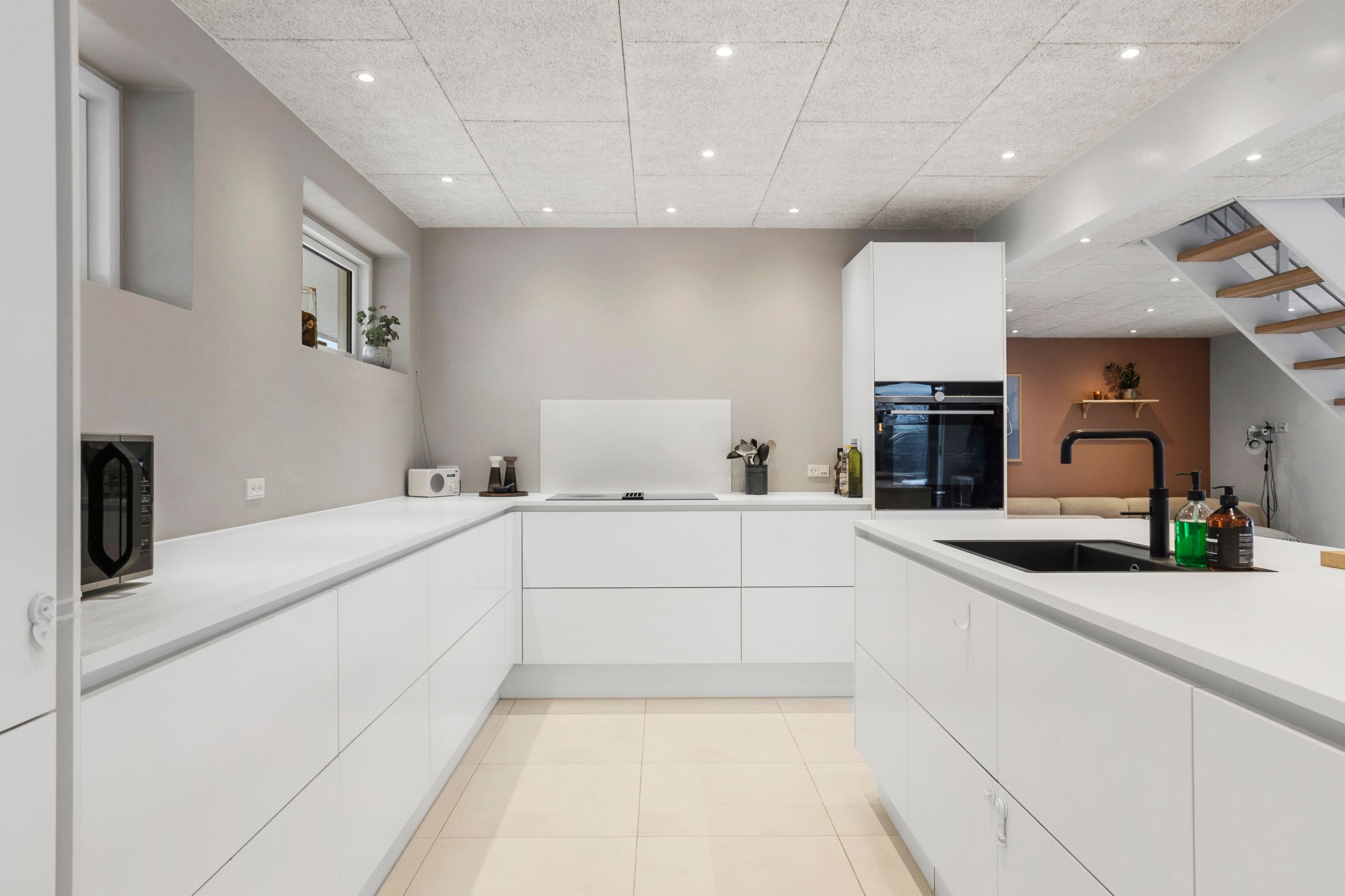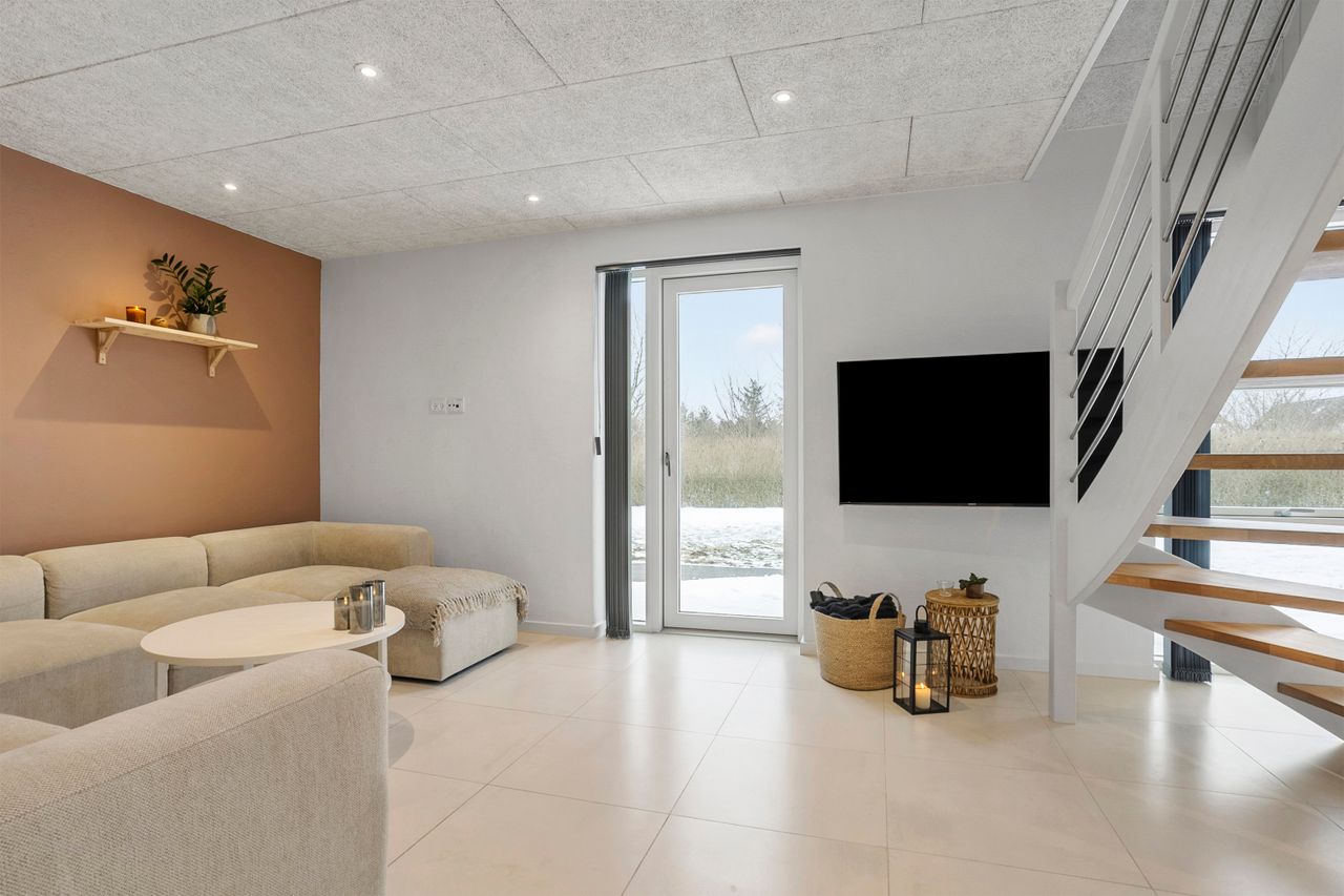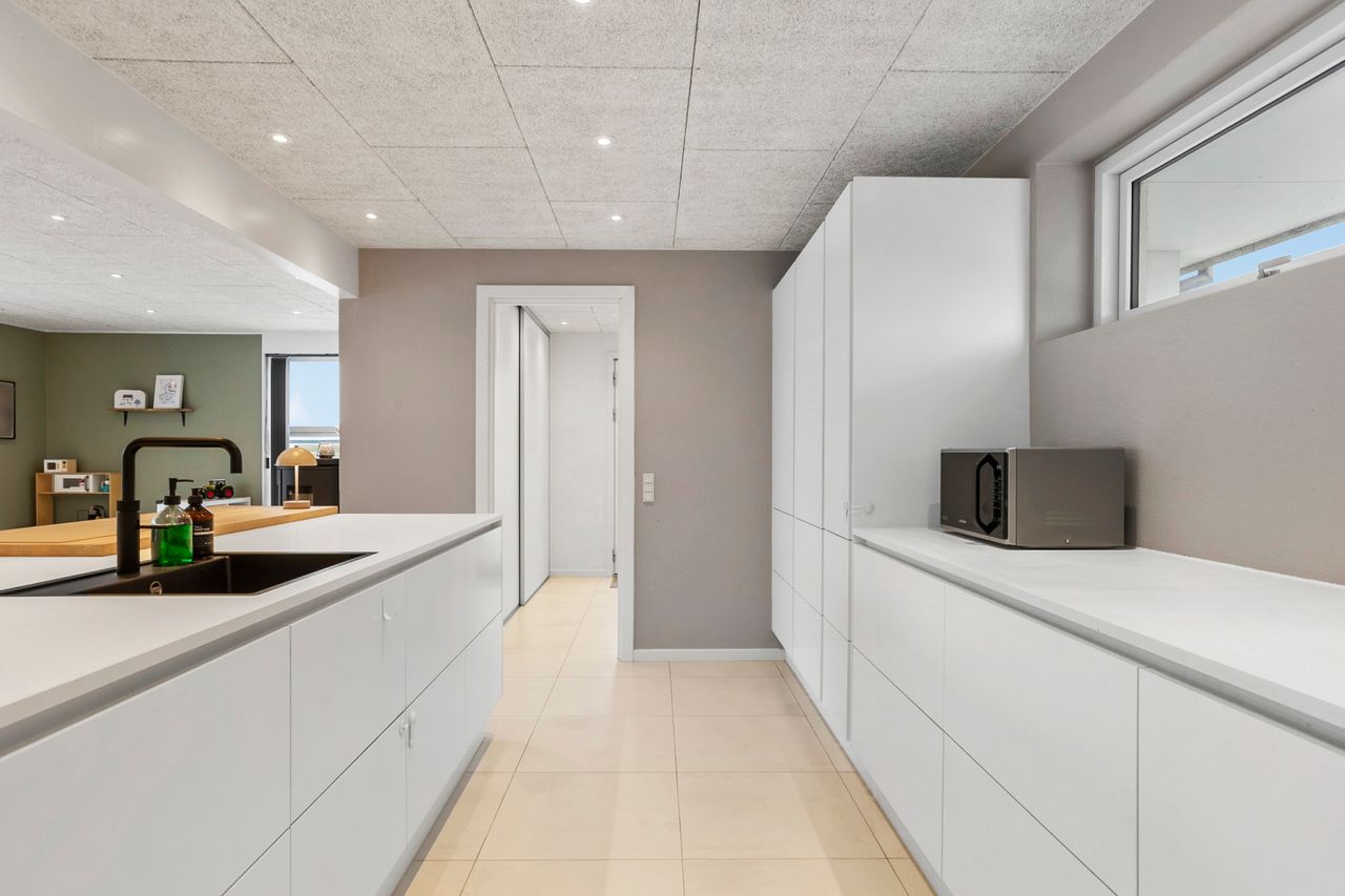 Hjemmets hjerte er det store, lyse opholdsmiljø, hvor stue og køkken-alrum smelter sammen i ét indbydende rum. Køkkenet fra Svane står stilrent og tidløst og danner en elegant ramme om både hverdagsliv og gæstebud. Her er god plads til både spiseafdeling og hyggelig sofagruppe, og de store vinduespartier sikrer et skønt lysindfald.