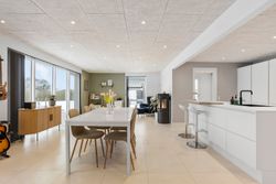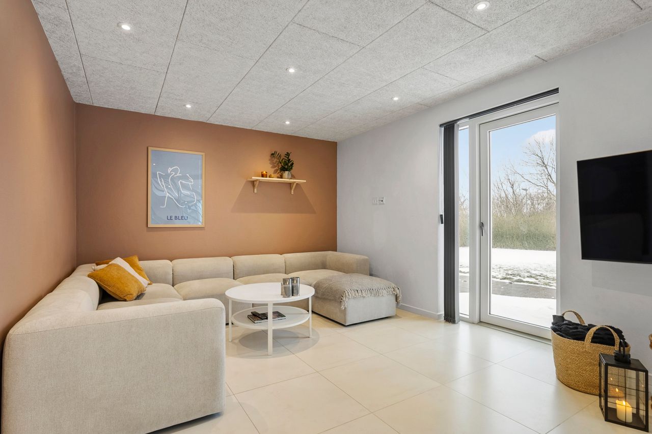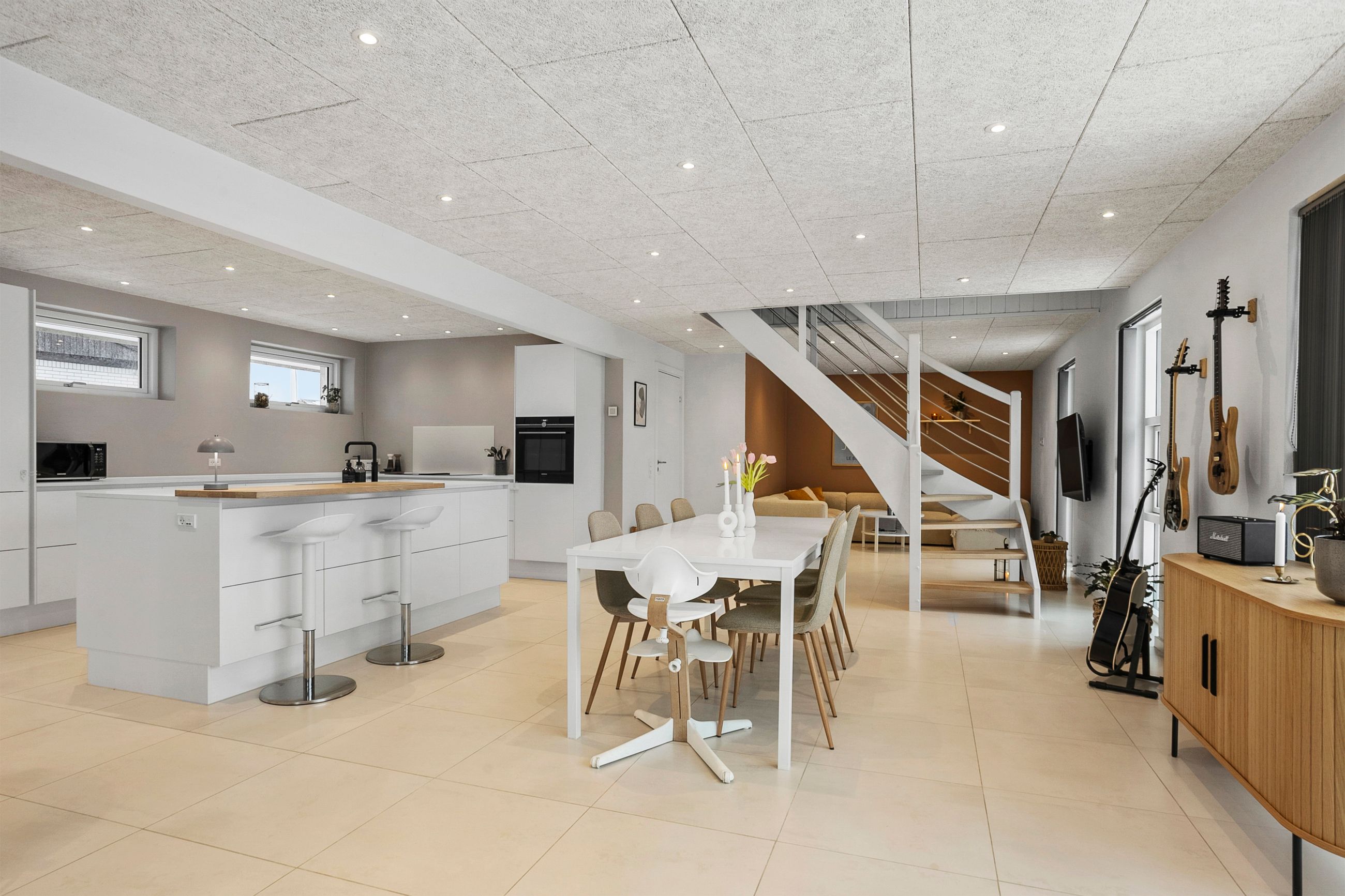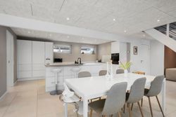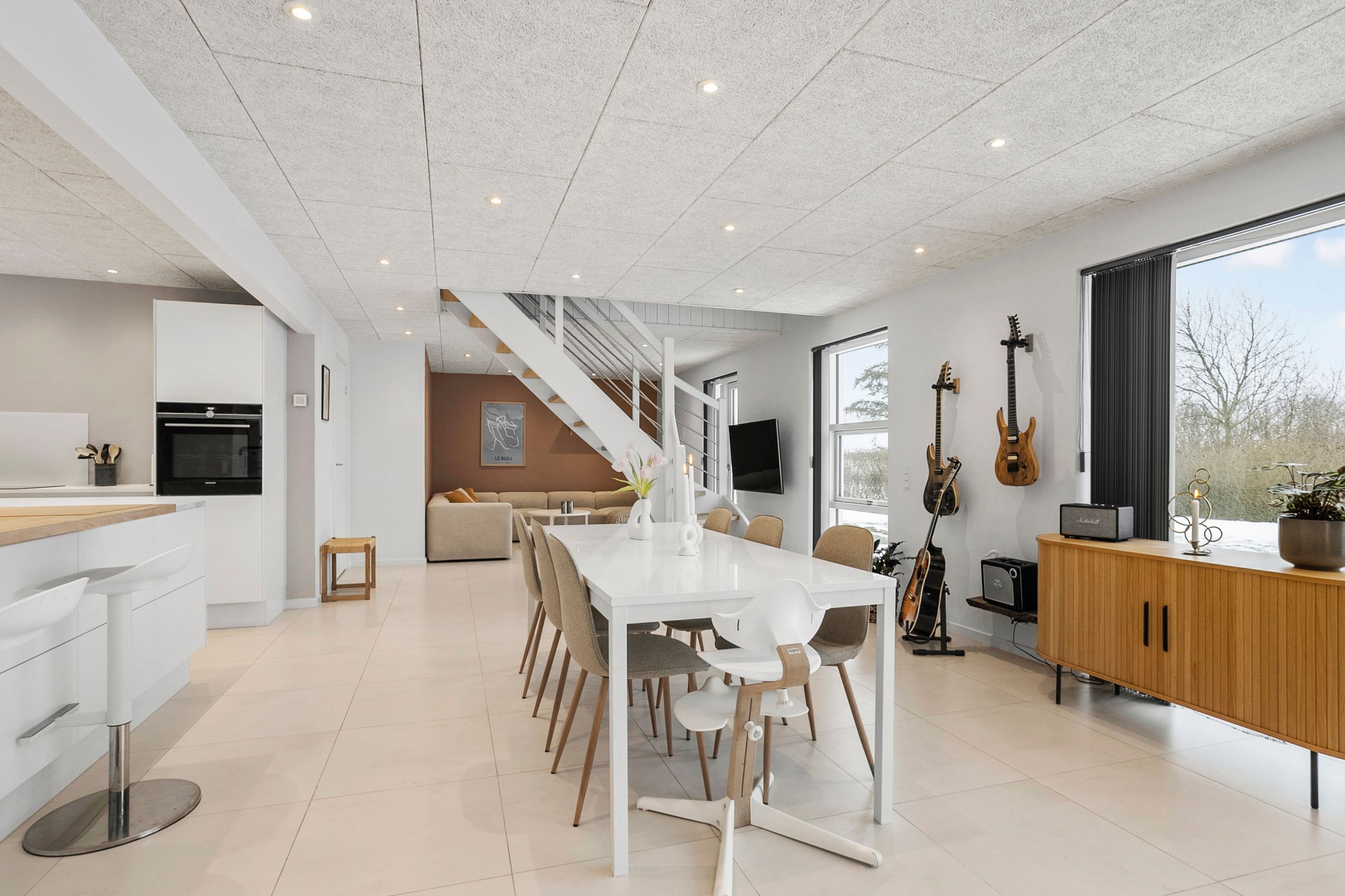 Hjemmets hjerte er det store, lyse opholdsmiljø, hvor stue og køkken-alrum smelter sammen i ét indbydende rum. Køkkenet fra Svane står stilrent og tidløst og danner en elegant ramme om både hverdagsliv og gæstebud. Her er god plads til både spiseafdeling og hyggelig sofagruppe, og de store vinduespartier sikrer et skønt lysindfald.