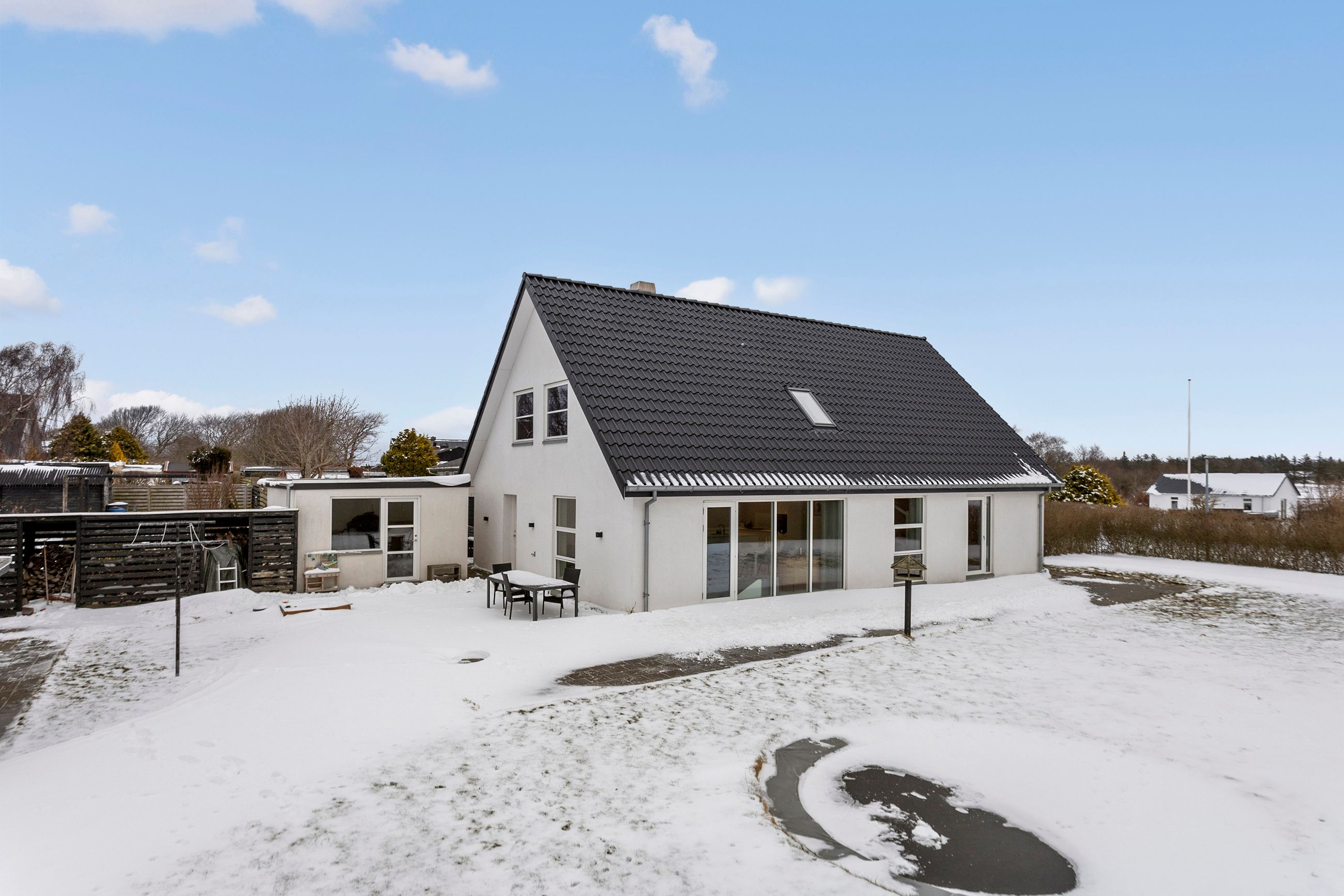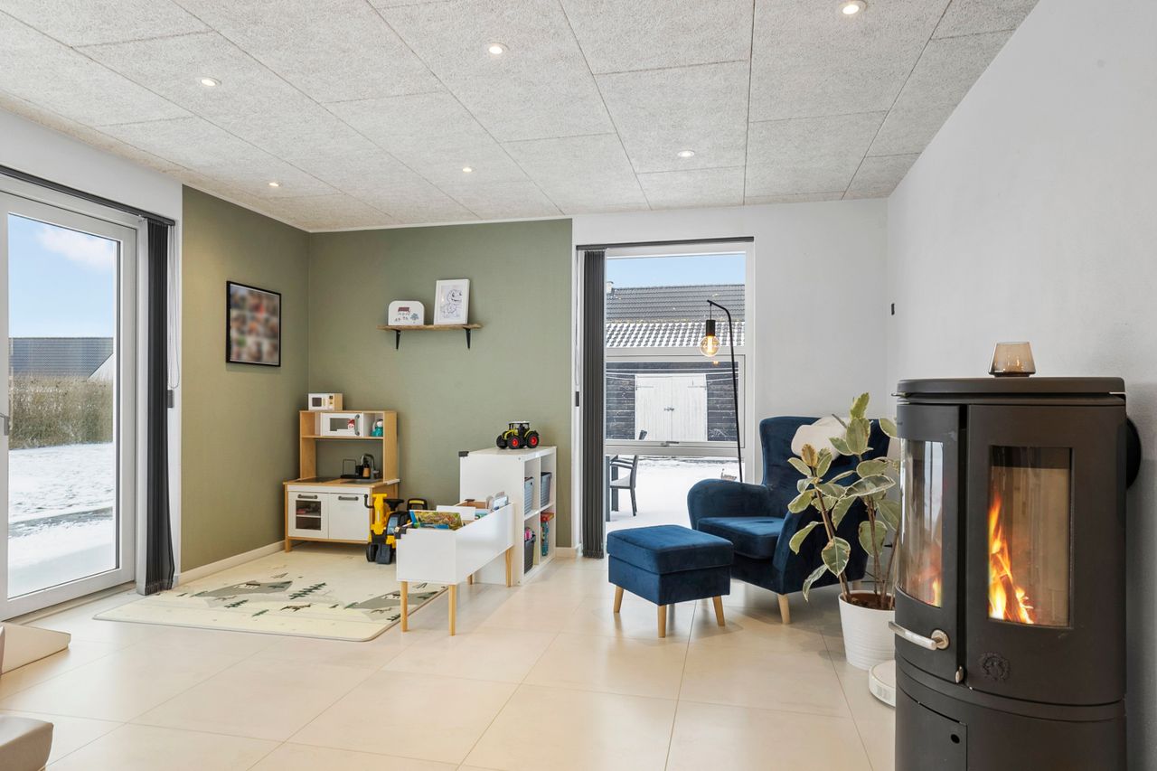Udendørs venter en 944 m2 stor grund med en skøn, solrig terrasse og udsigt over åbne marker. Haven byder på god plads til leg og udeliv i rolige og trygge omgivelser. Der er desuden klargjort til separatkloakering.