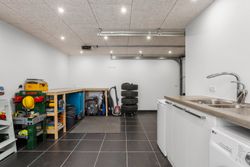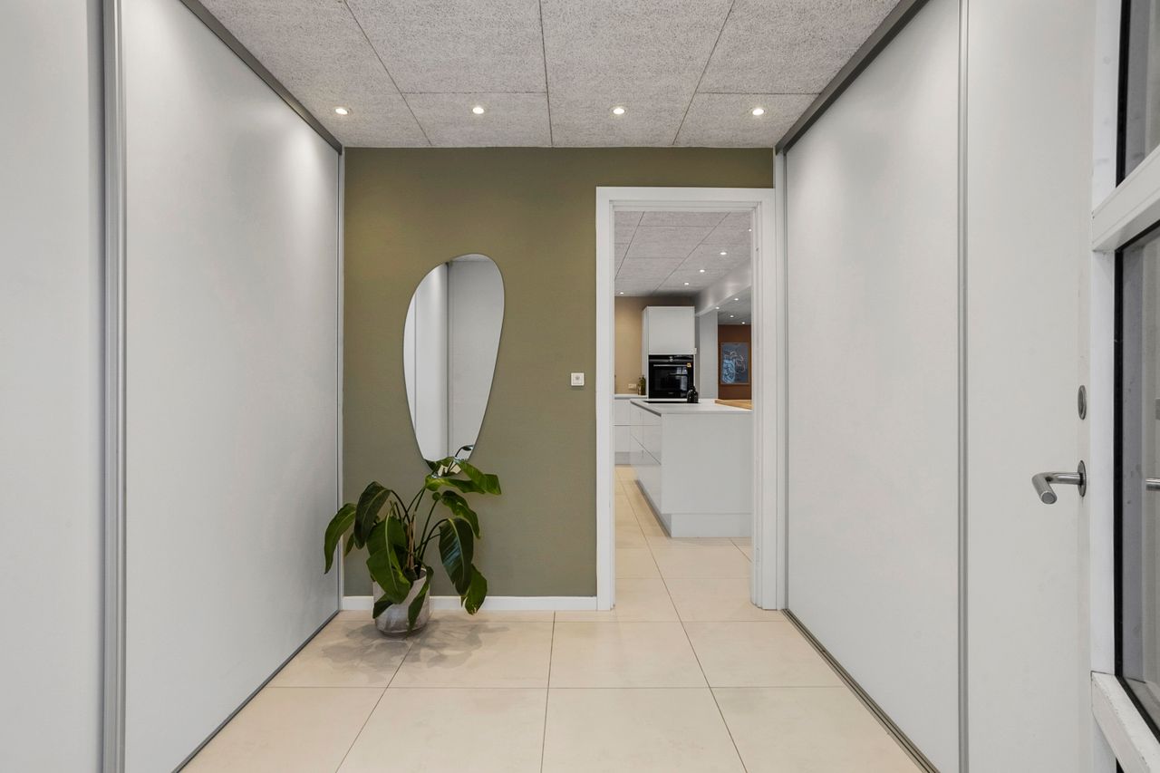 Entréen fremstår indbydende med flotte Svane-elementer og gode opbevaringsløsninger. Fra boligen er der direkte adgang til en virkelig anvendelig og isoleret garage med el-port samt praktiske bryggersfaciliteter.