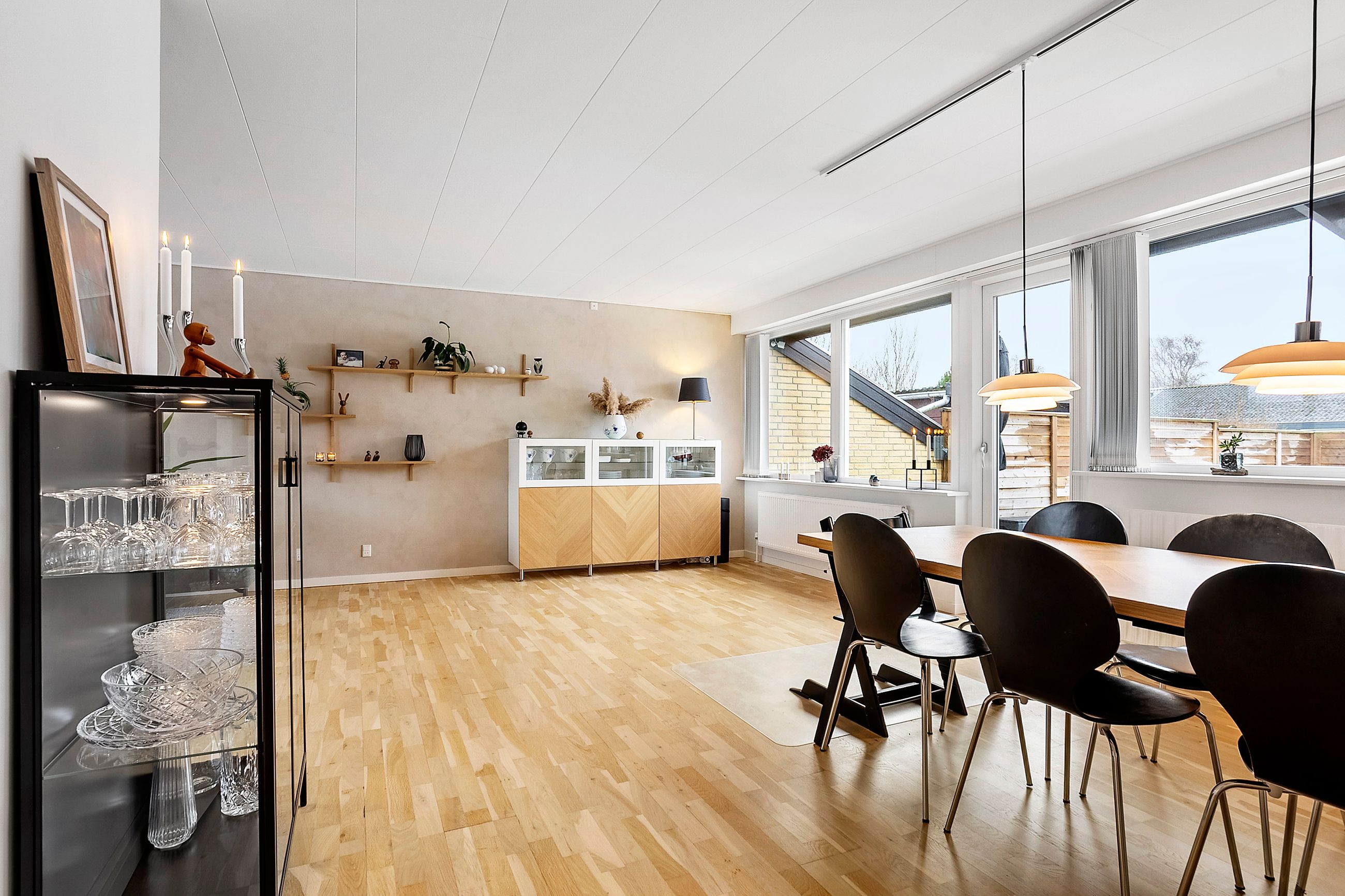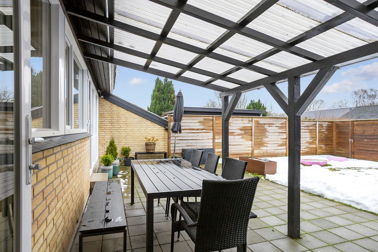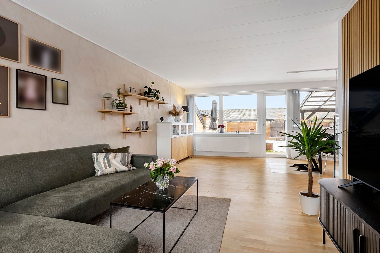 Boligens naturlige samlingspunkt er den rummelige opholds- og spisestue, som har direkte udgang til en dejlig terrasse og en lukket, ugeneret have.