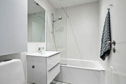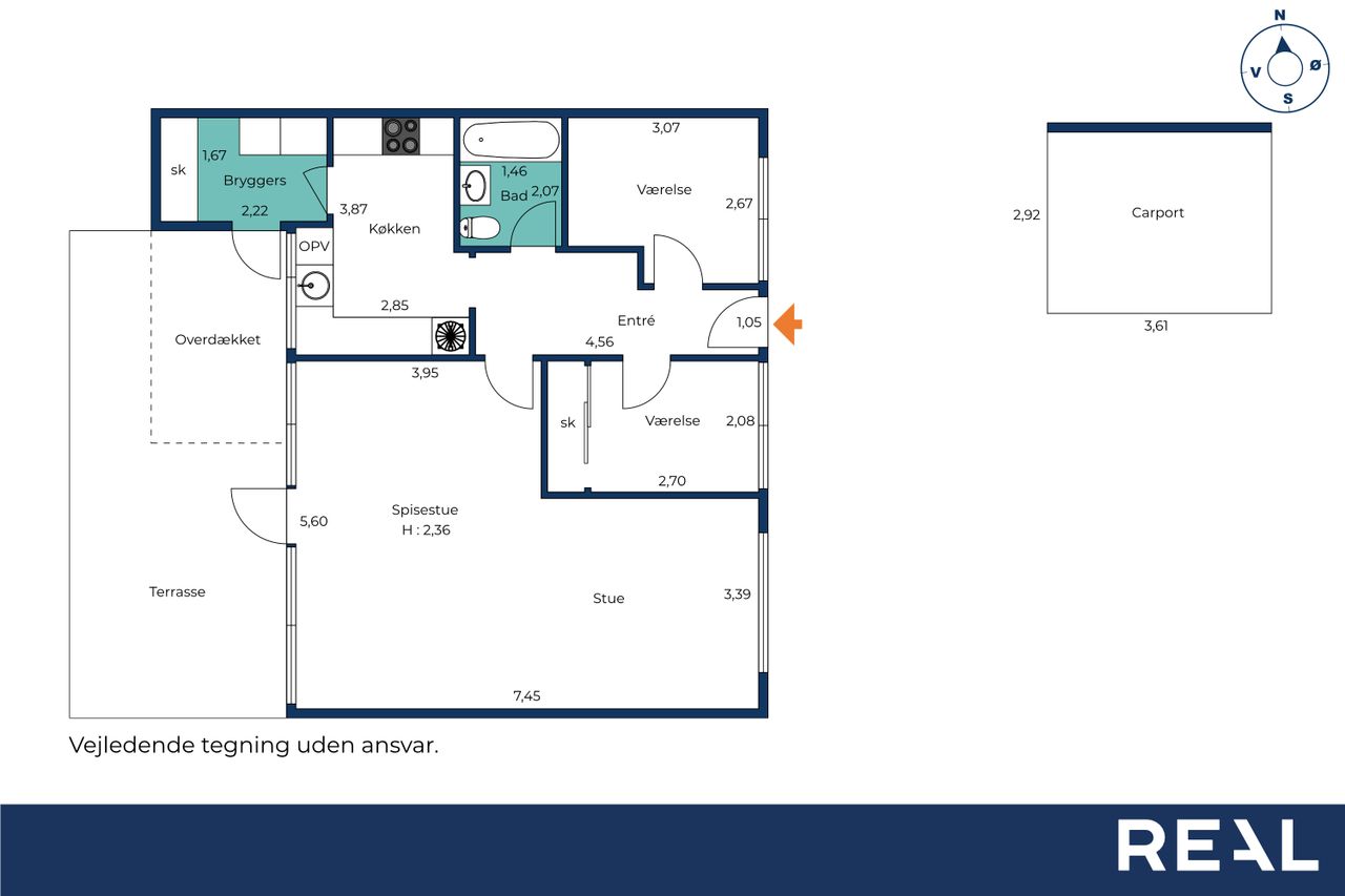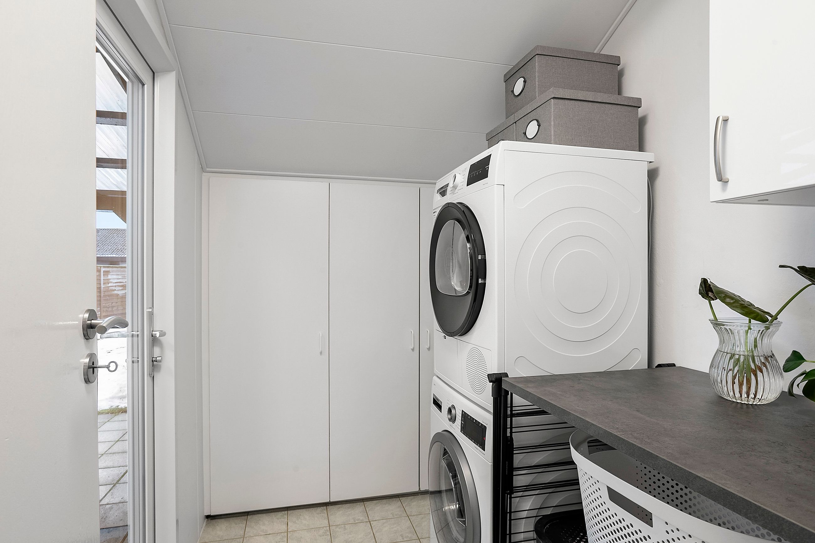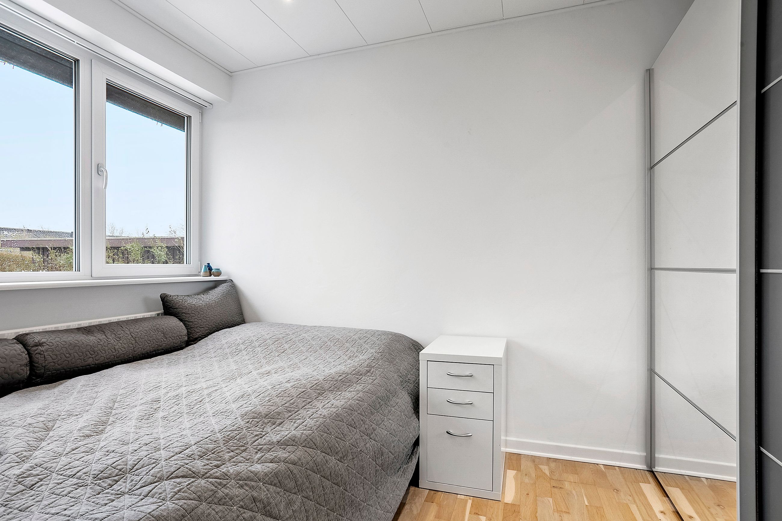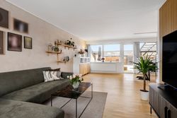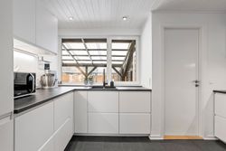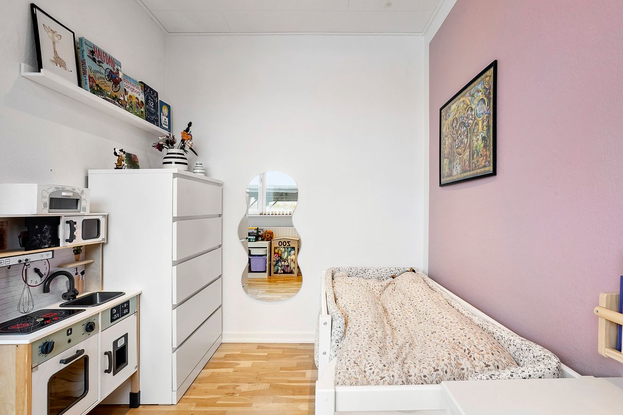 Derudover indeholder boligen et soveværelse, et børneværelse, et lyst badeværelse med badekar, samt et praktisk bryggers med vaskesøjle, skabsplads og udgang.