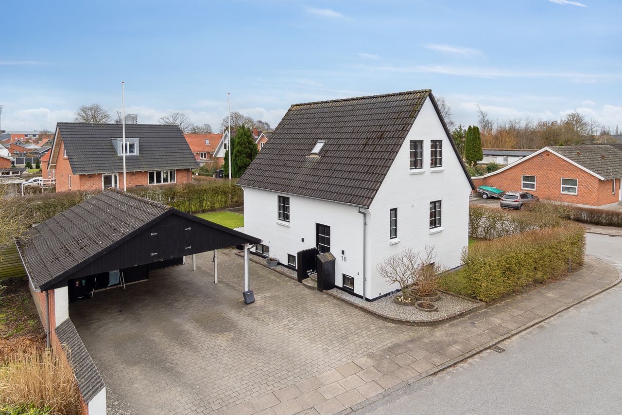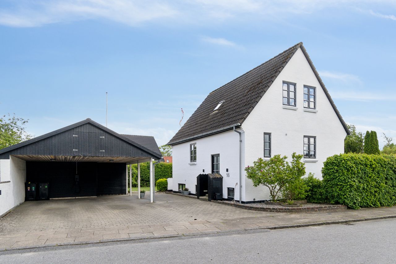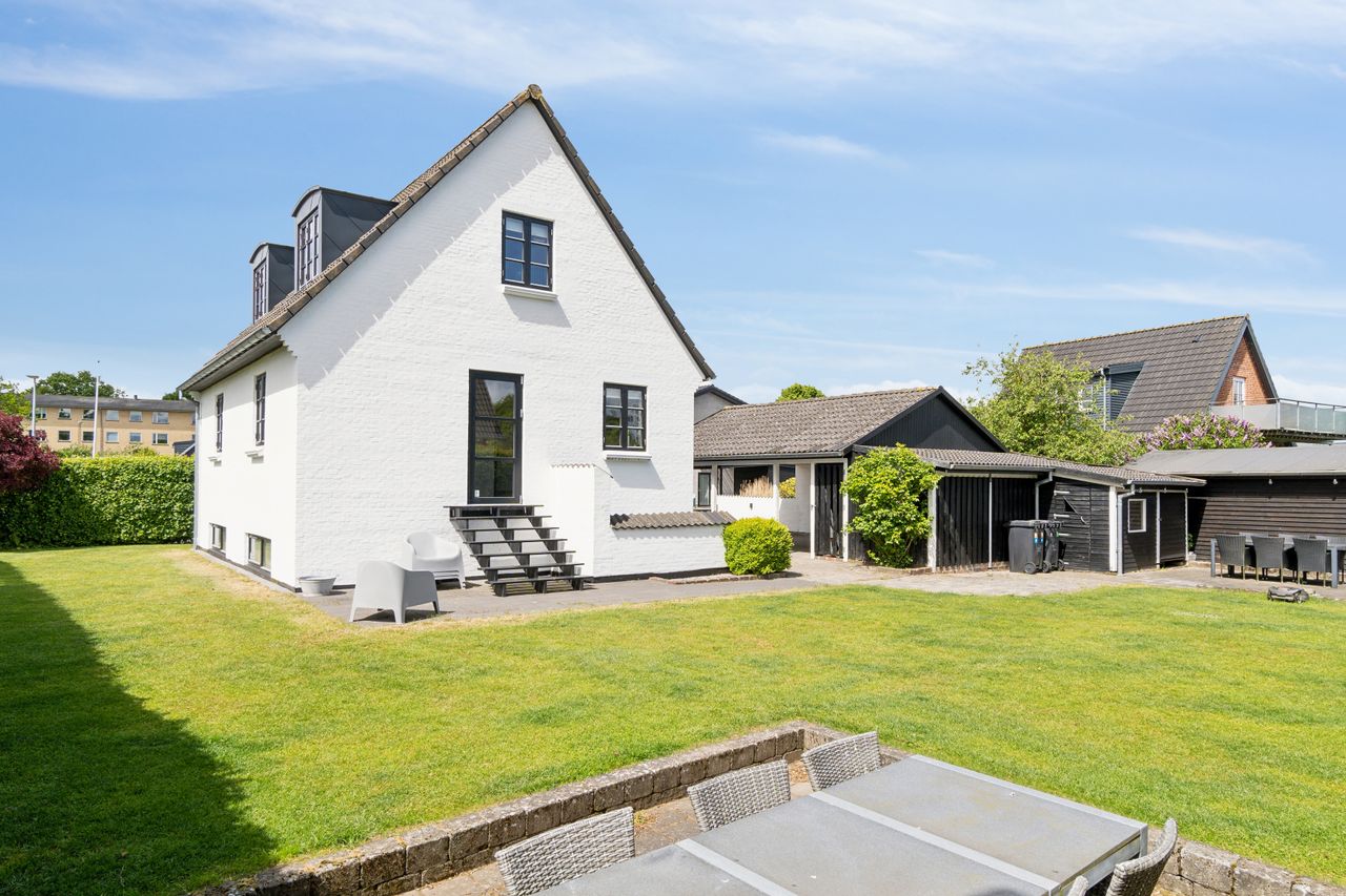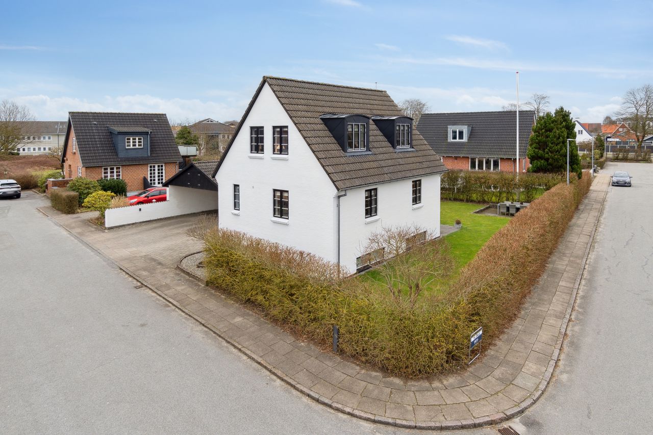 Med sin hvidpudsede facade og sorte betontagsten fremstår denne villa både klassisk og stilfuld. Her får du 170 m2 under tag, fordelt på tre plan, hvilket giver masser af plads til hele familien.