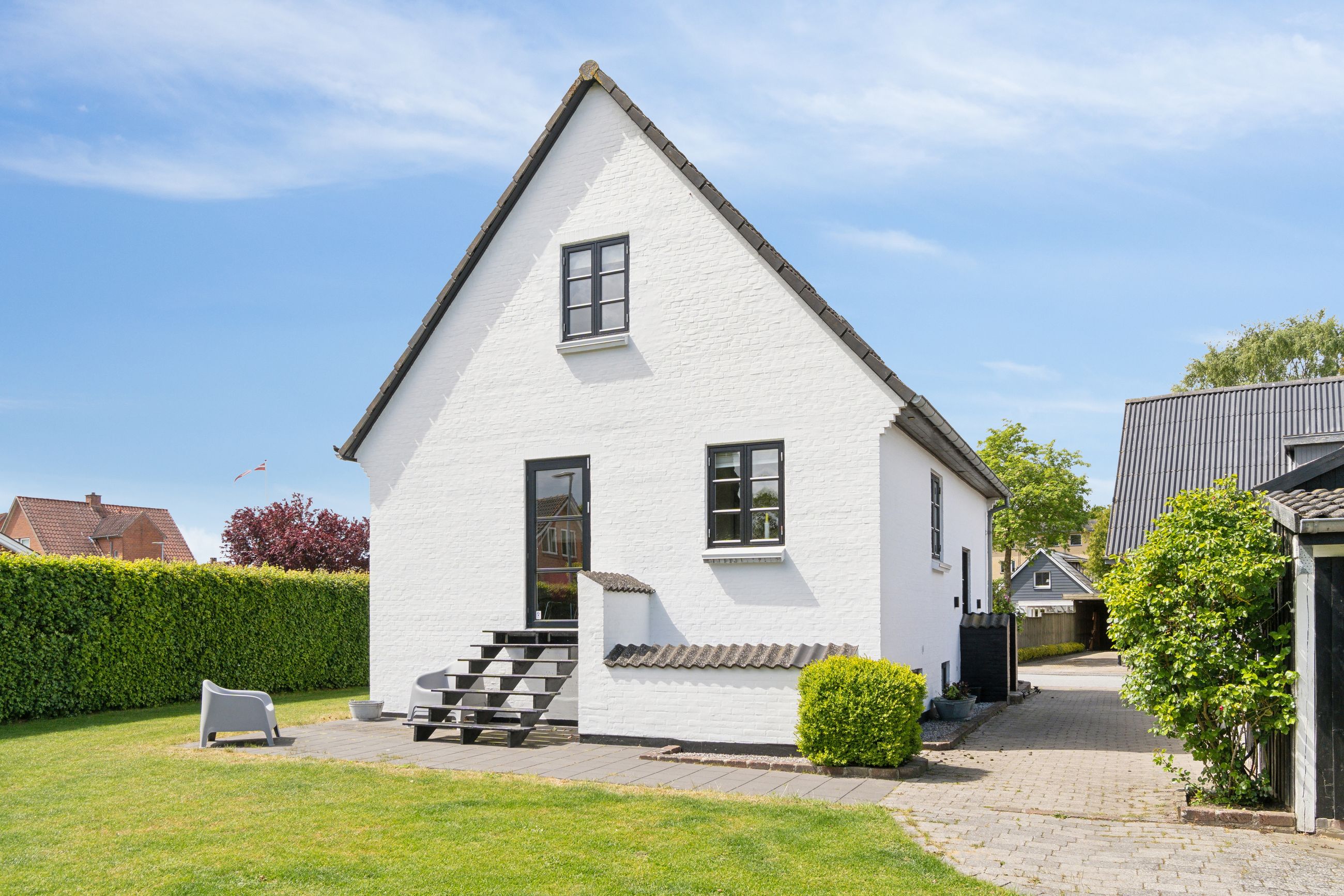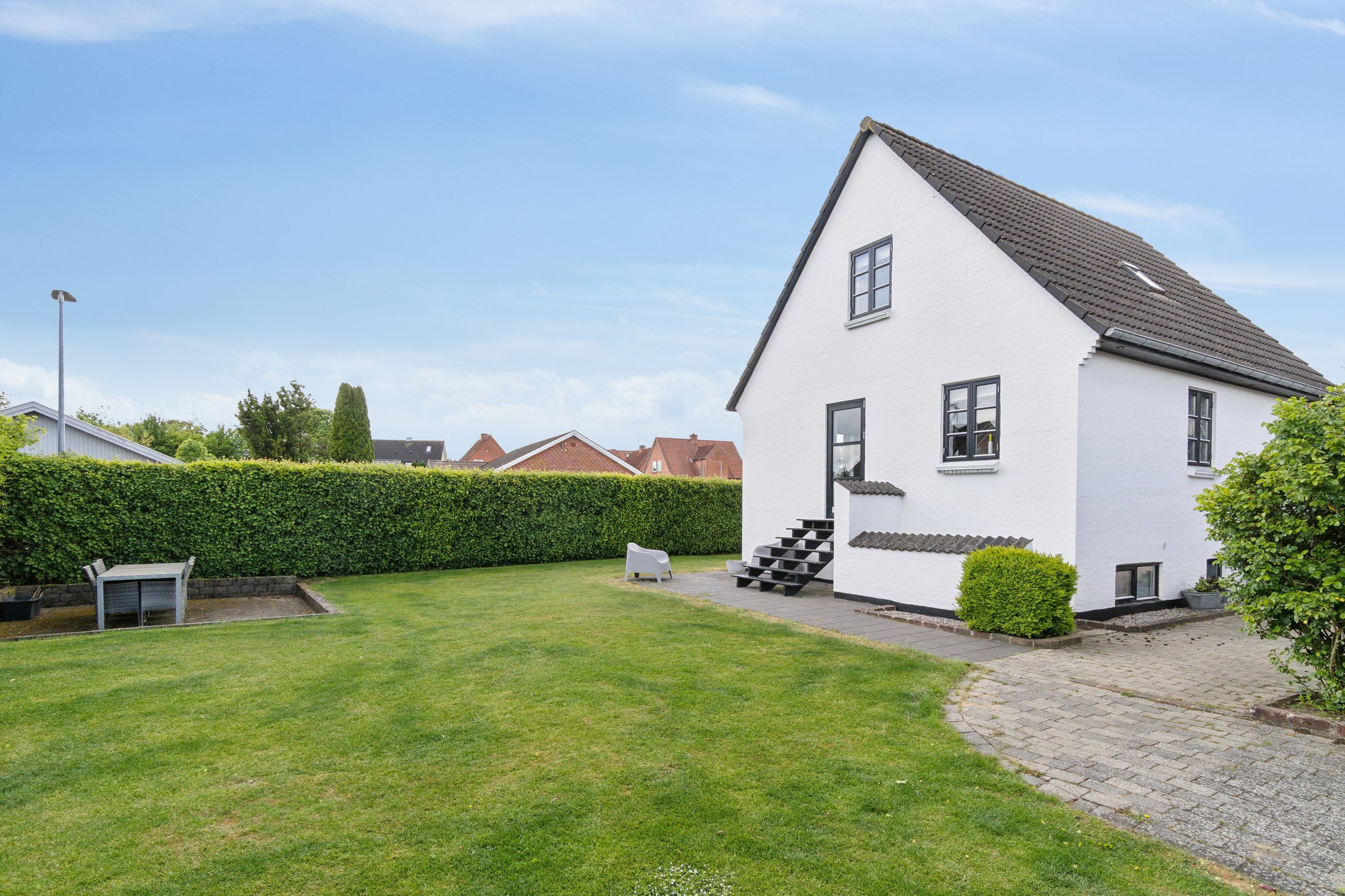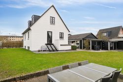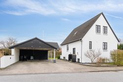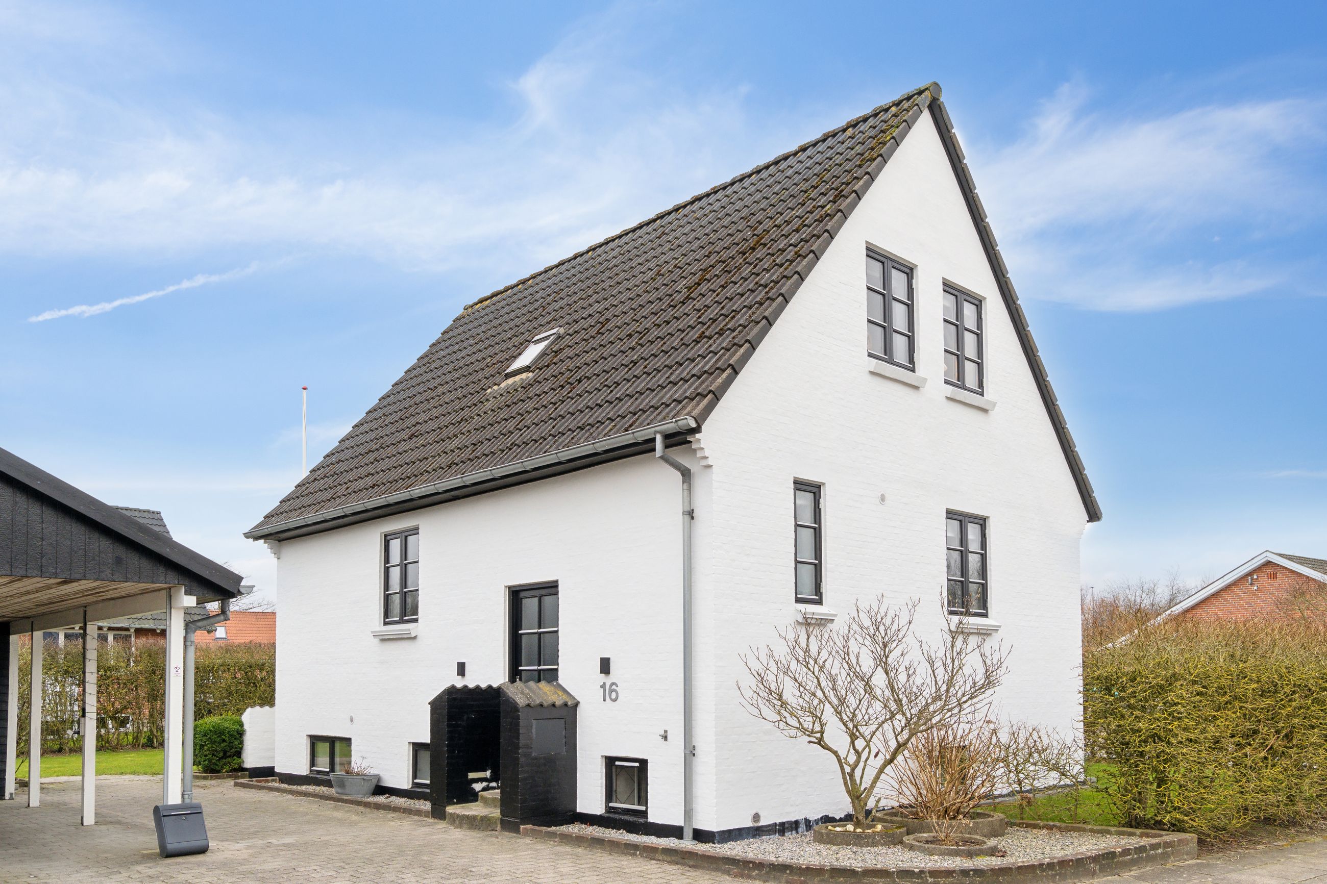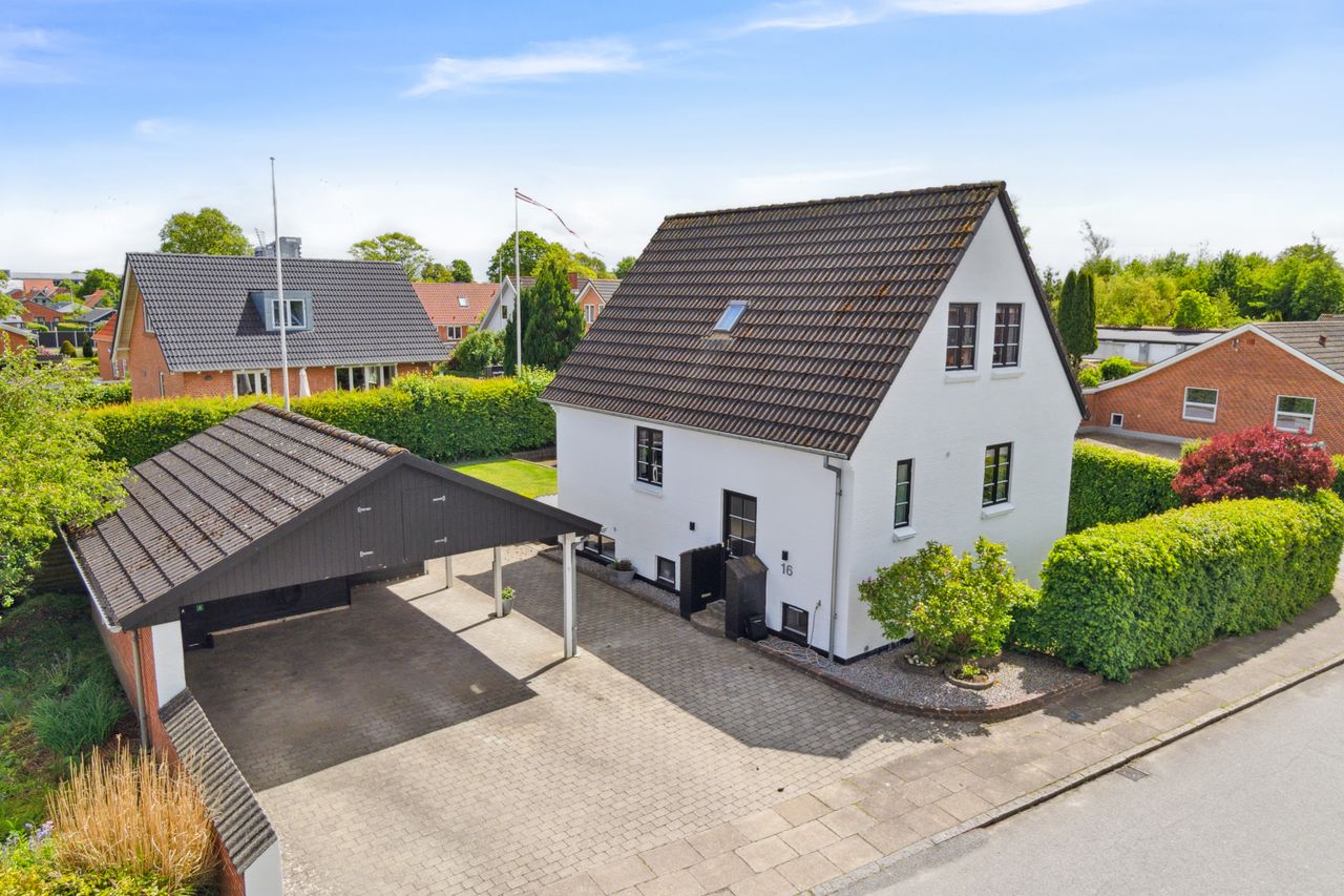Med sin hvidpudsede facade og sorte betontagsten fremstår denne villa både klassisk og stilfuld. Her får du 170 m2 under tag, fordelt på tre plan, hvilket giver masser af plads til hele familien.