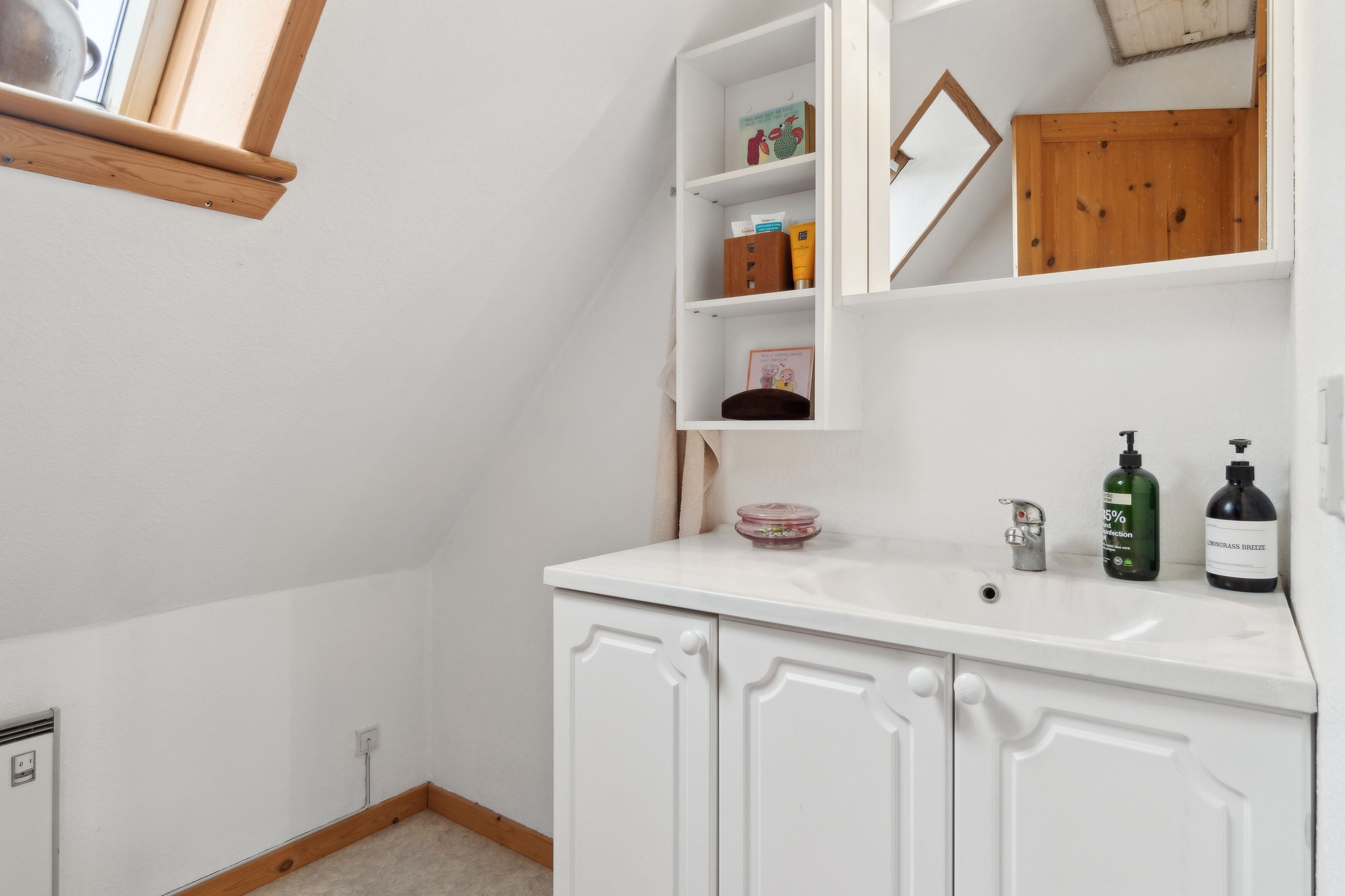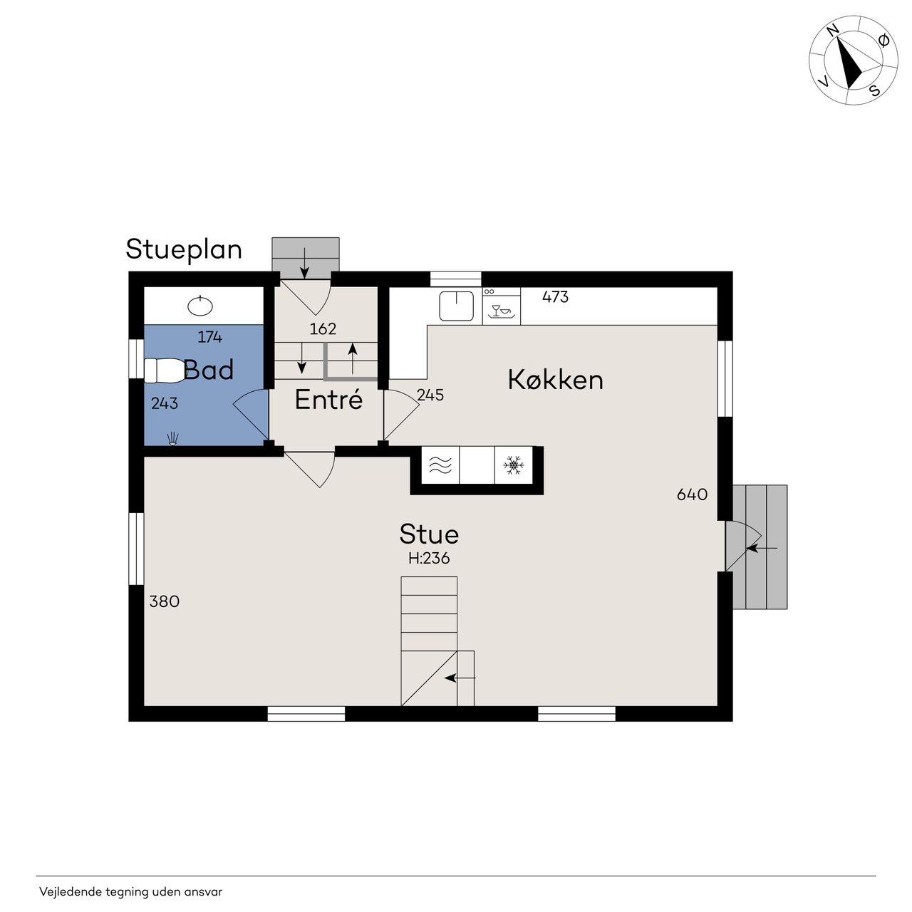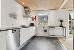 Når du træder ind i stueetagen, mødes du af et åbent og lyst opholdsrum, hvor køkkenet er integreret med den store stue – perfekt til samvær og hyggelige middage. Derudover finder du et badeværelse på denne etage.