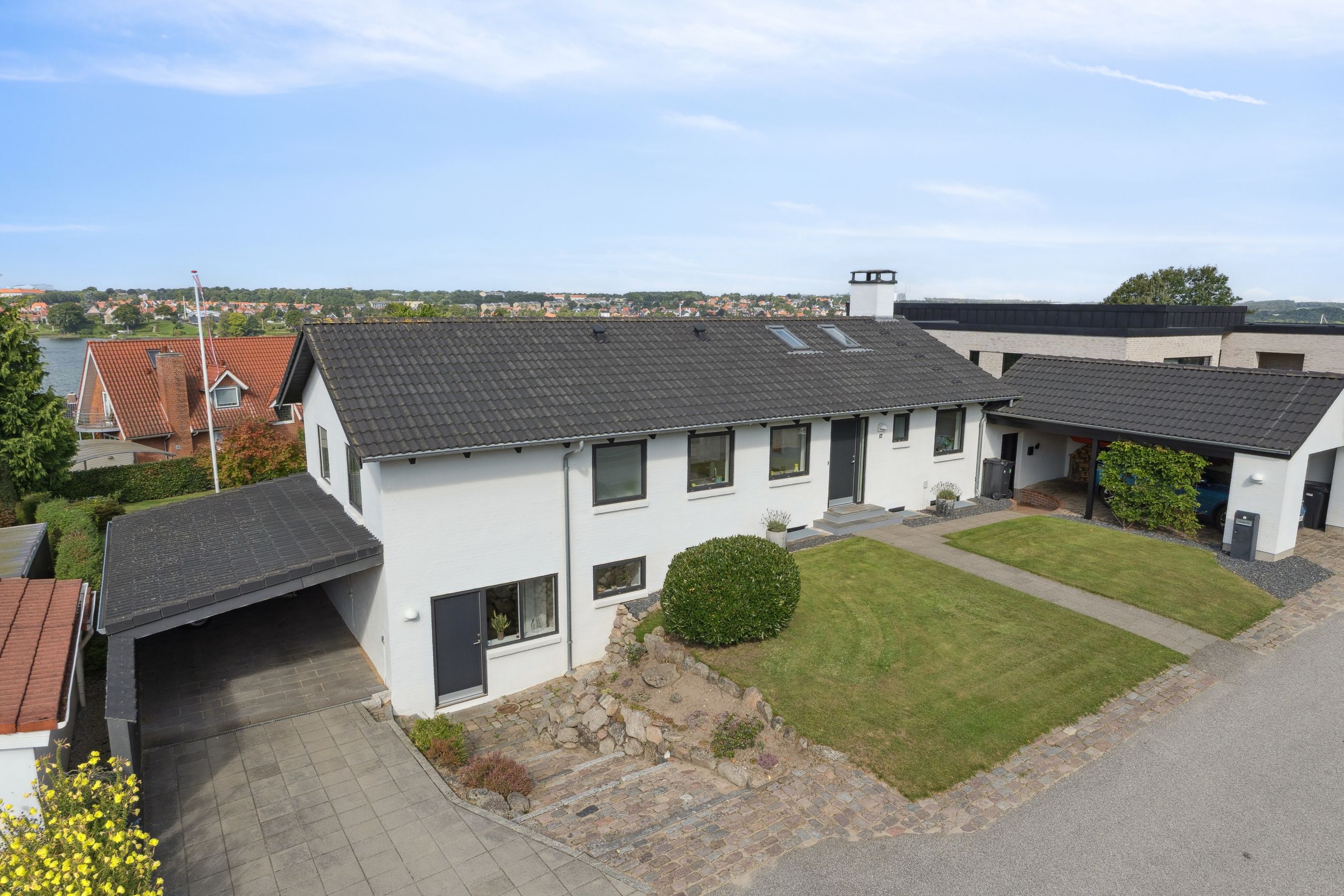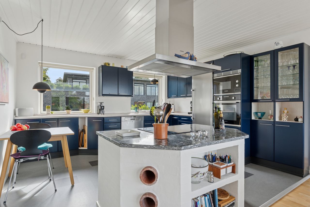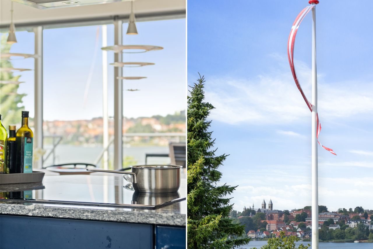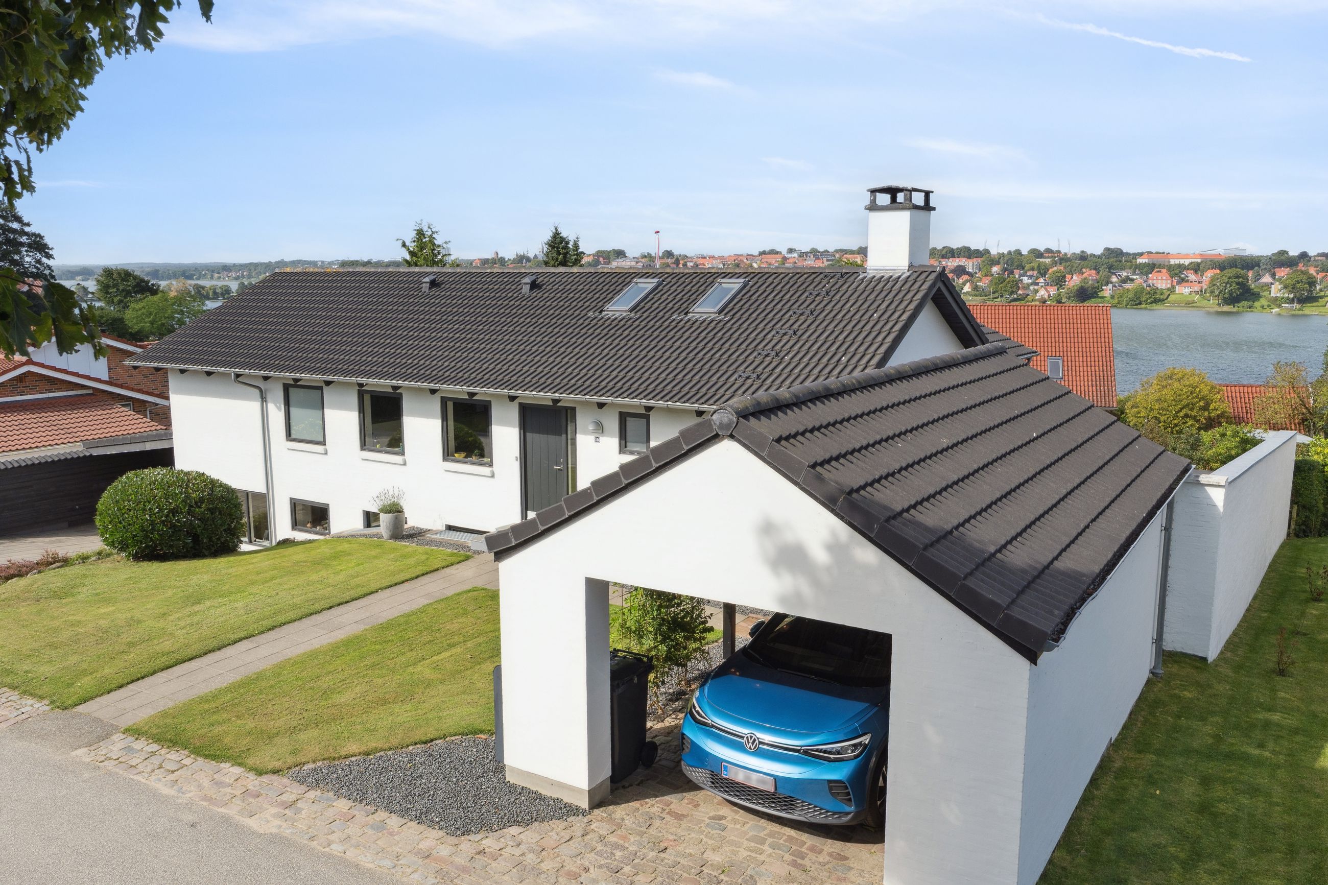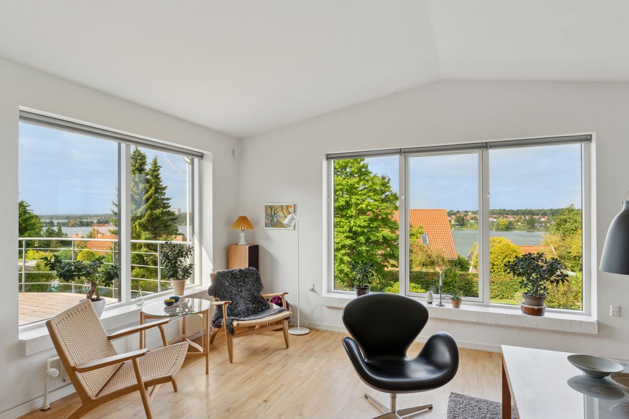 Indvendigt byder boligen på en gennemtænkt planløsning med lyse, åbne rum og en behagelig atmosfære. De store vinduespartier i stue og køkken-alrum skaber ikke bare et fantastisk lysindfald. De trækker også udsigten helt ind i hjemmet, så du aldrig glemmer, hvor privilegeret du bor. Her kan du sidde i sofaen og lade blikket glide ud over byen, eller stå ved køkkenøen og nyde synet af solnedgangen over søen, mens aftensmaden tilberedes.