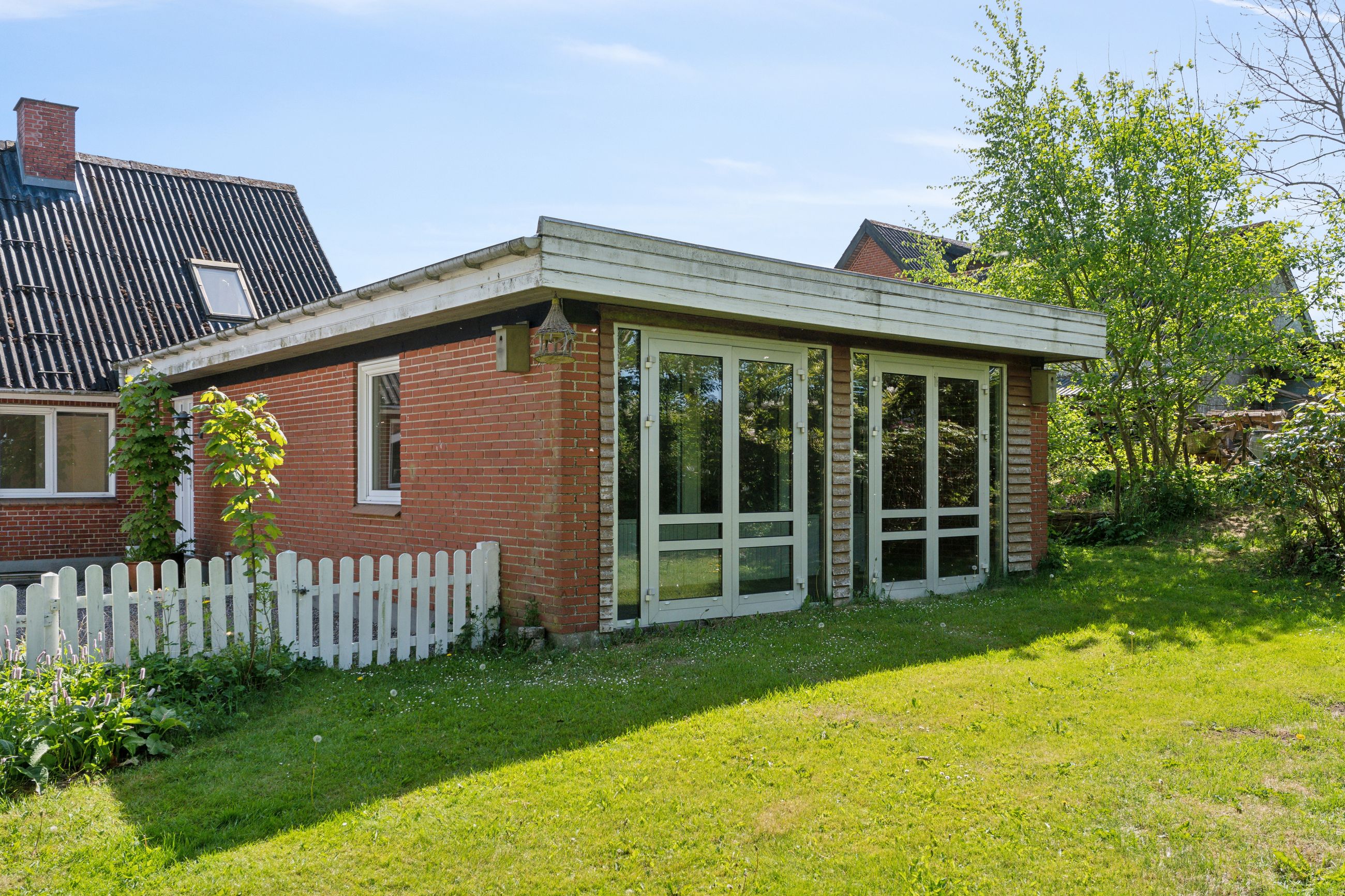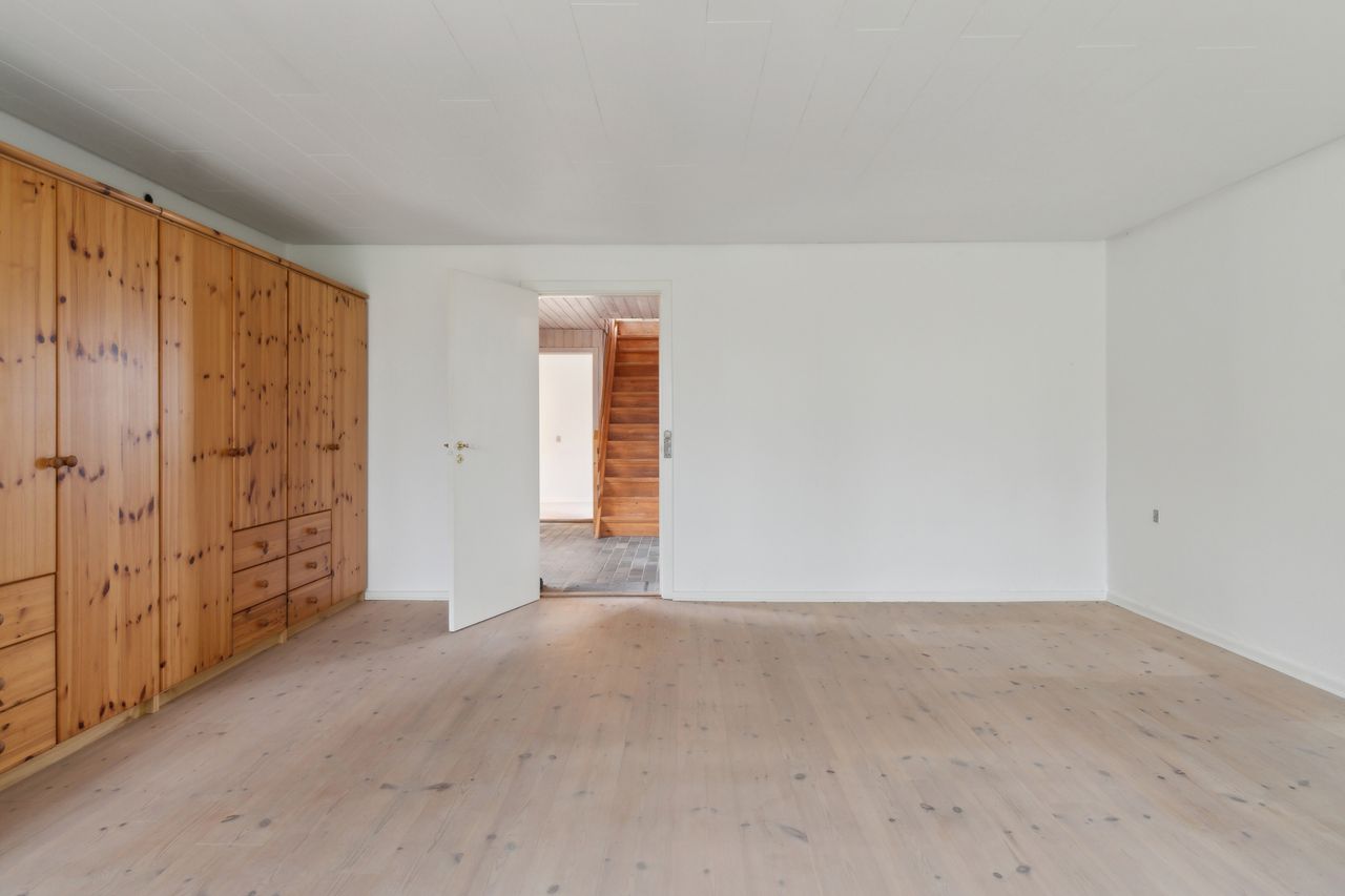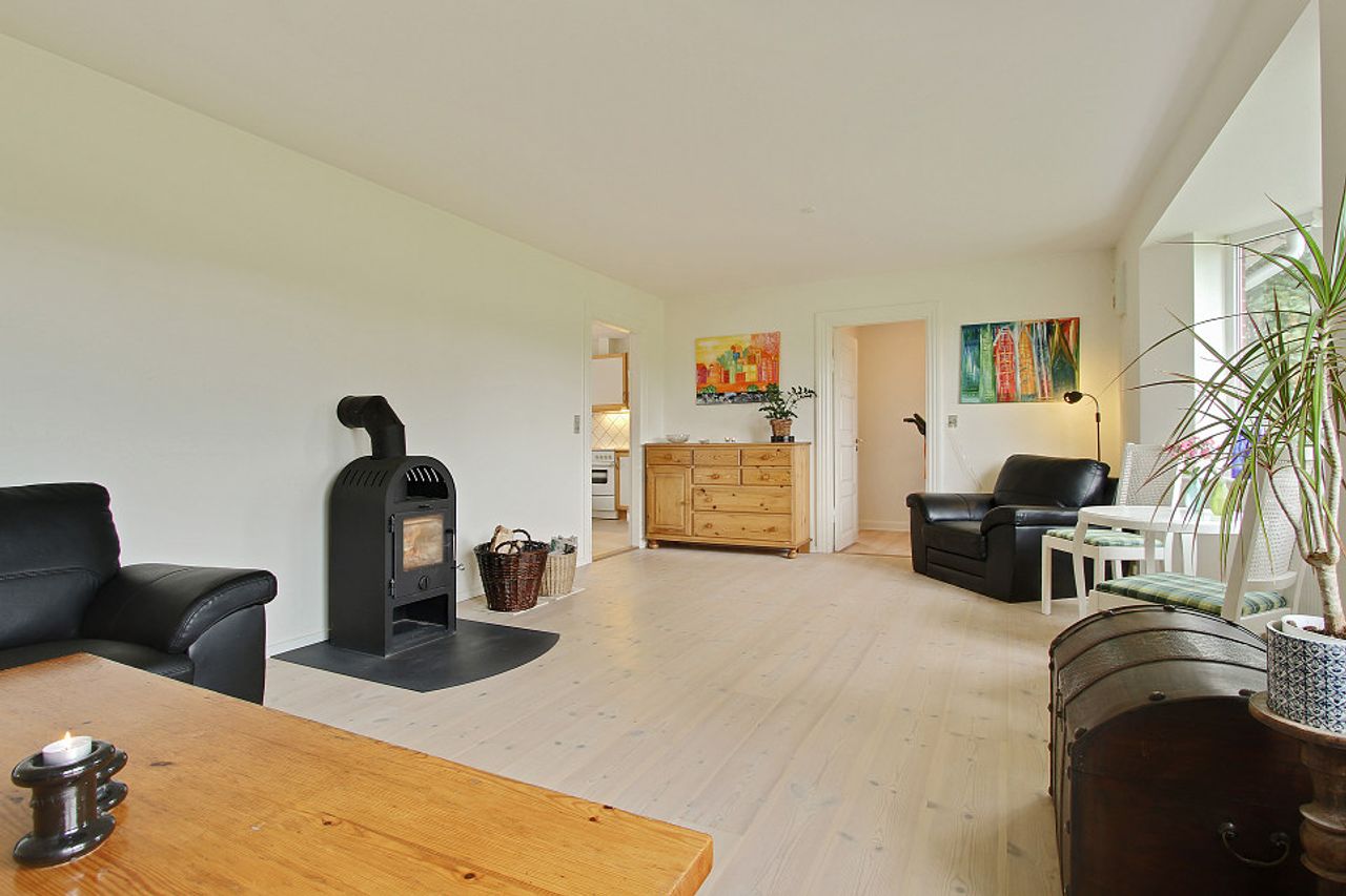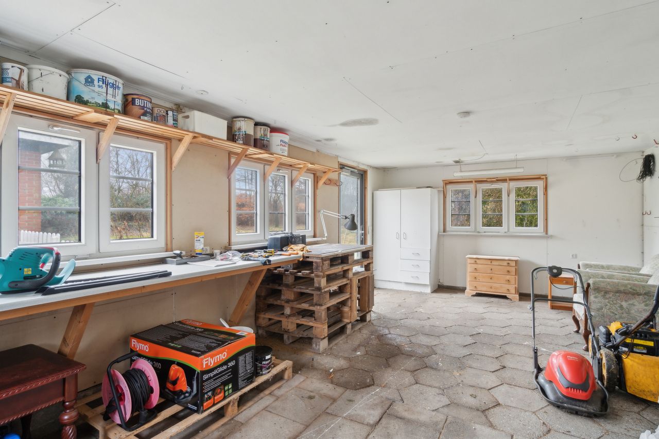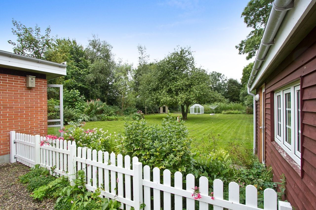 Ejendommen byder på gode, lyse opholdsrum, en funktionel planløsning og en hyggelig atmosfære. Udenfor får du en stor have, hvor du kan skabe din egen grønne oase – hvad enten du drømmer om en køkkenhave, blomsterbede eller et sted til afslapning i solen.