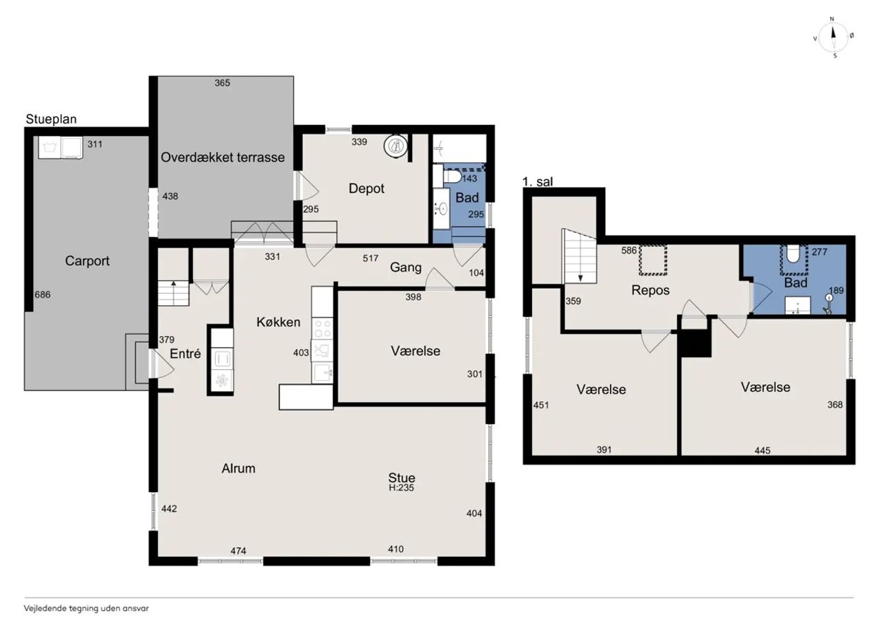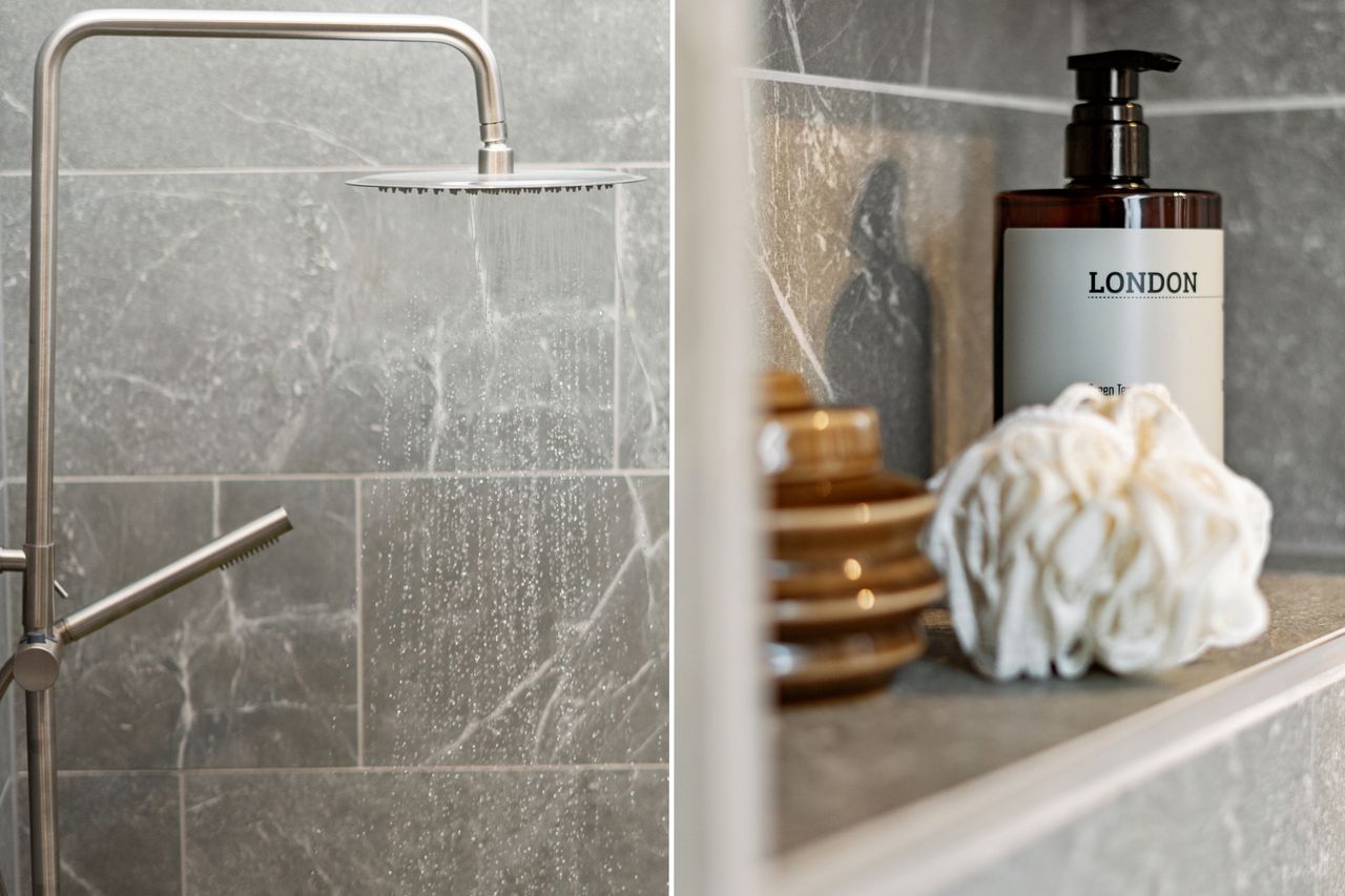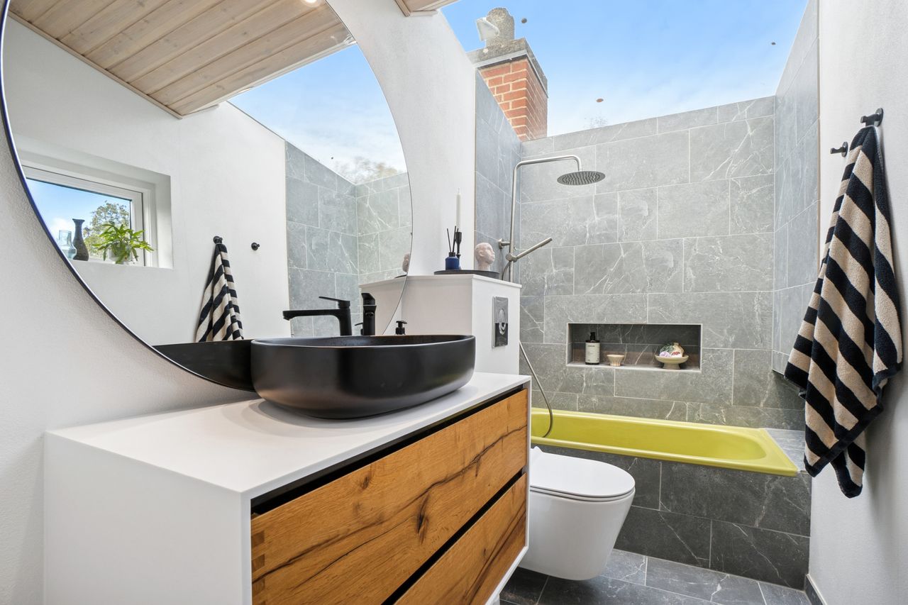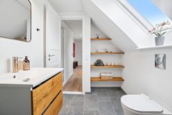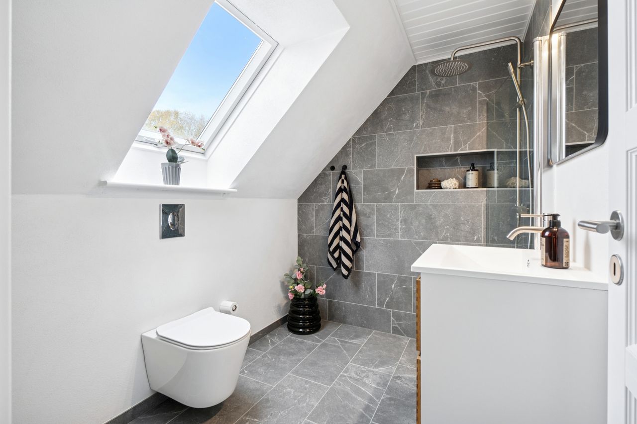 Begge badeværelser er nyrenoverede i stilrene materialer og med praktiske løsninger til hverdagens behov – det ene placeret i stueplan, det andet på førstesalen. Perfekt til familien eller parret, der sætter pris på både funktionalitet og æstetik.
