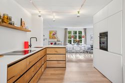 Det splinternye køkken er husets naturlige samlingspunkt – moderne indrettet med god skabsplads og i åben forbindelse til spiseområde og stue. Fra køkkenet er der direkte udgang til en skøn træterrasse, der inviterer til afslapning og hyggelige stunder med flot view over åbne arealer.
