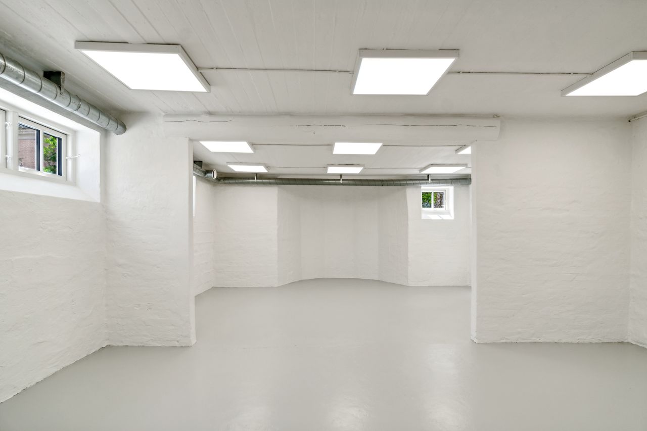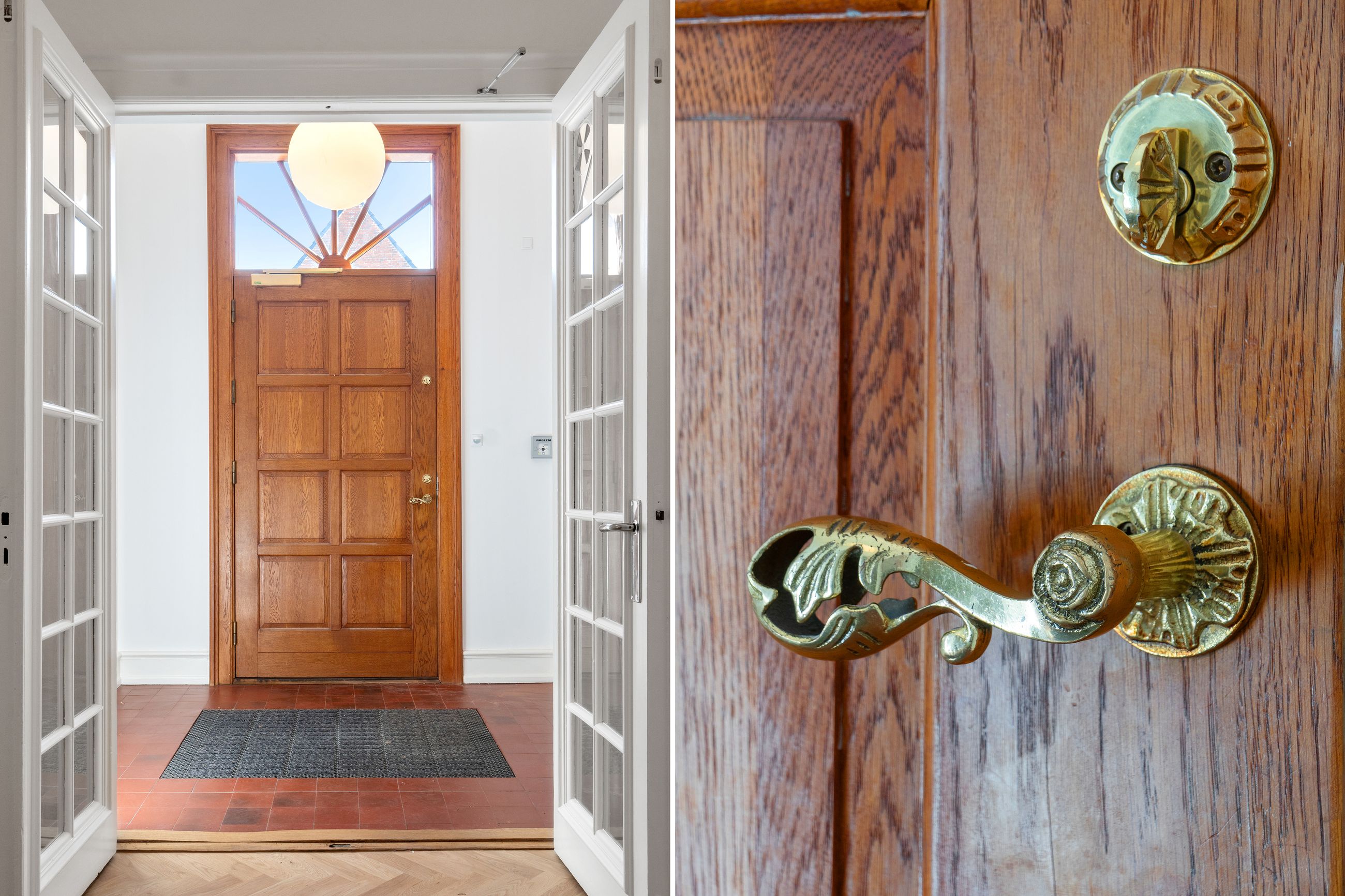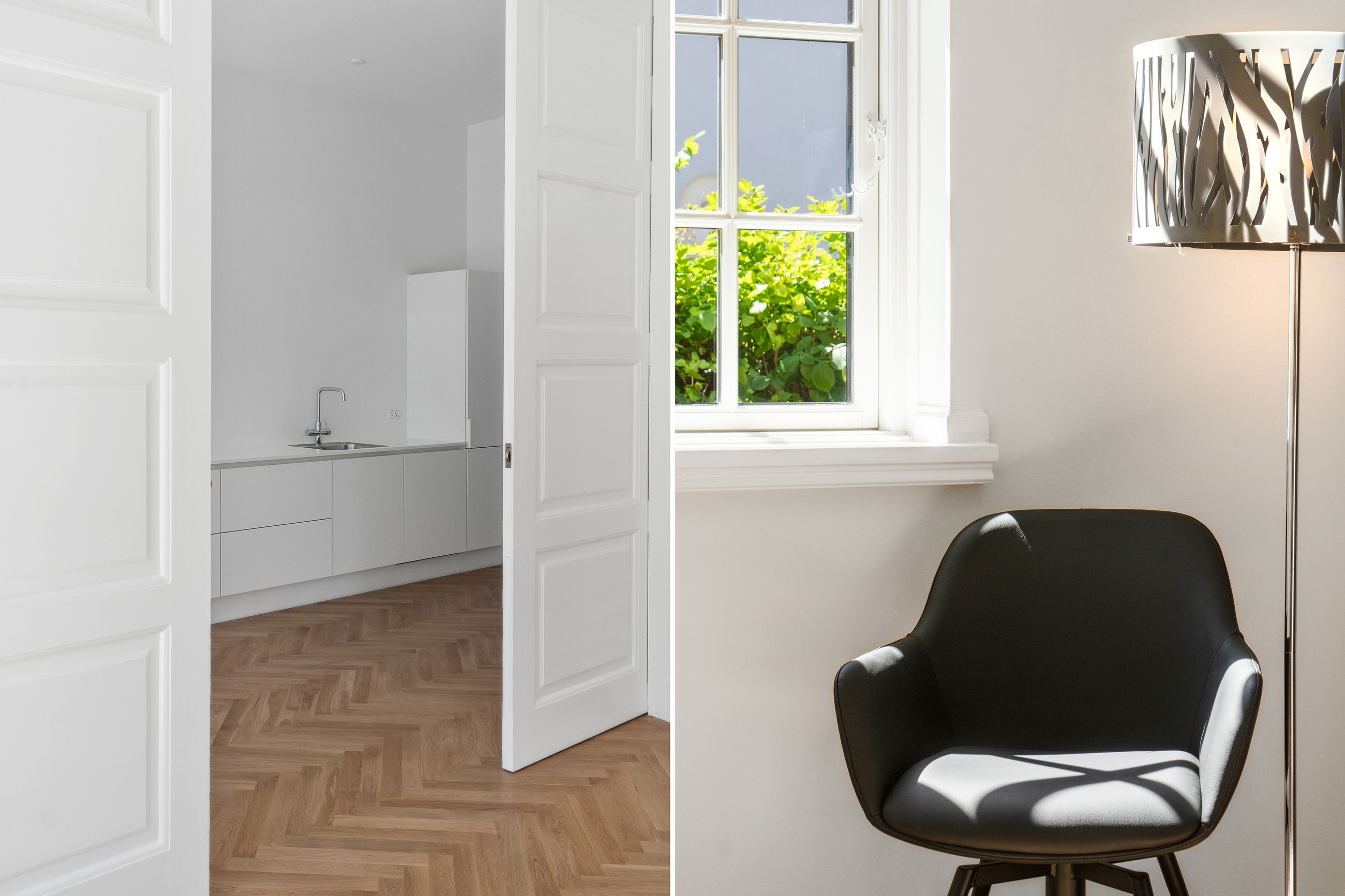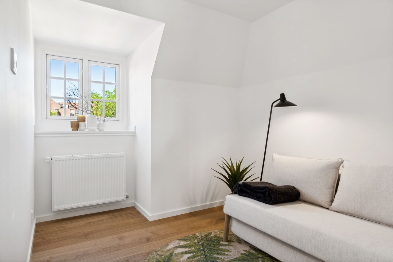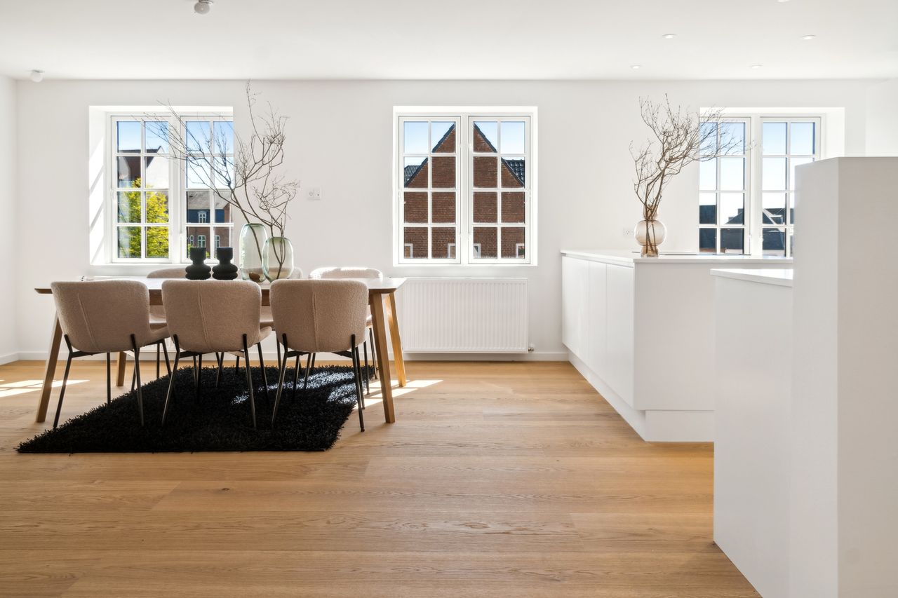 Indenfor bydes du velkommen i højloftede rum med 3,25 meters lofthøjde, udskårne lister, elegante paneler og gulve i sildebensparket samt egeplankegulve. De store vinduer bringer masser af naturligt lys ind, hvilket skaber en lys og luftige atmosfære i alle værelser.