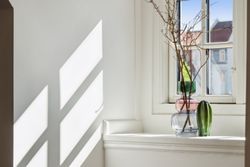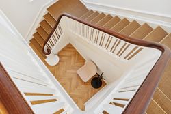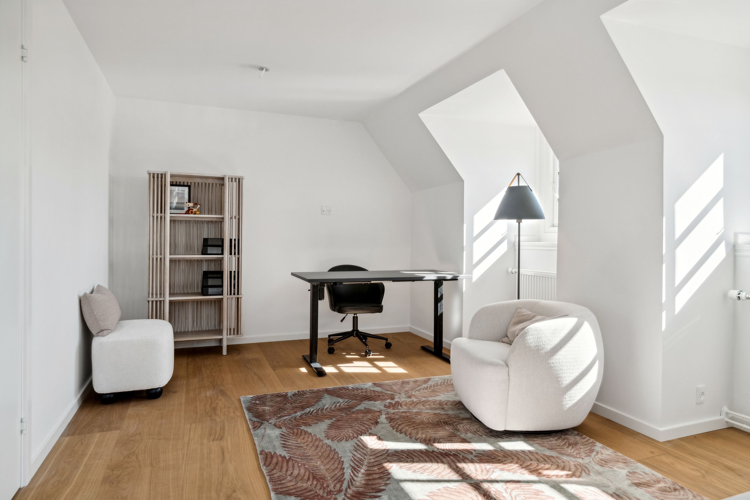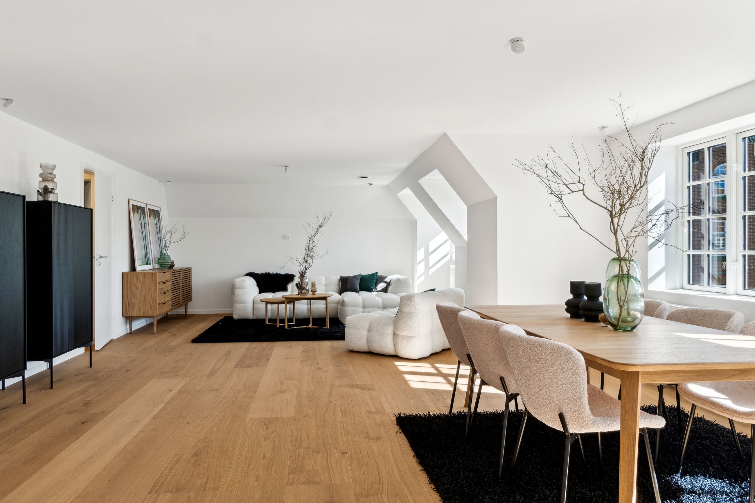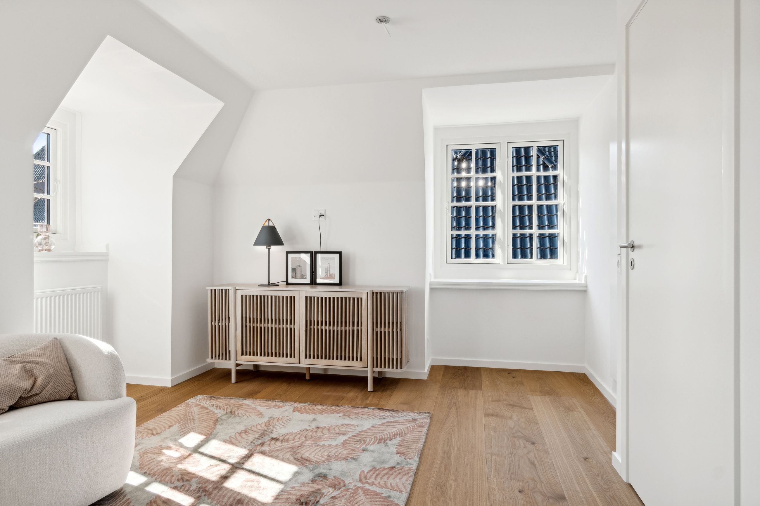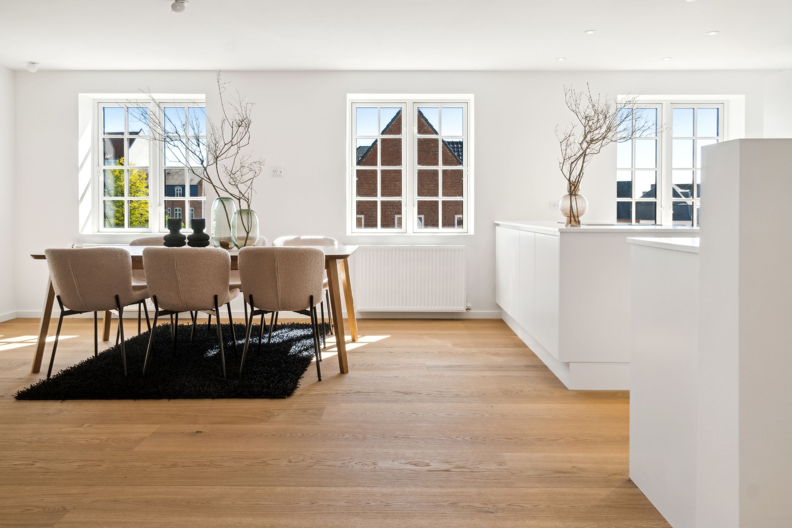 Indenfor bydes du velkommen i højloftede rum med 3,25 meters lofthøjde, udskårne lister, elegante paneler og gulve i sildebensparket samt egeplankegulve. De store vinduer bringer masser af naturligt lys ind, hvilket skaber en lys og luftige atmosfære i alle værelser.